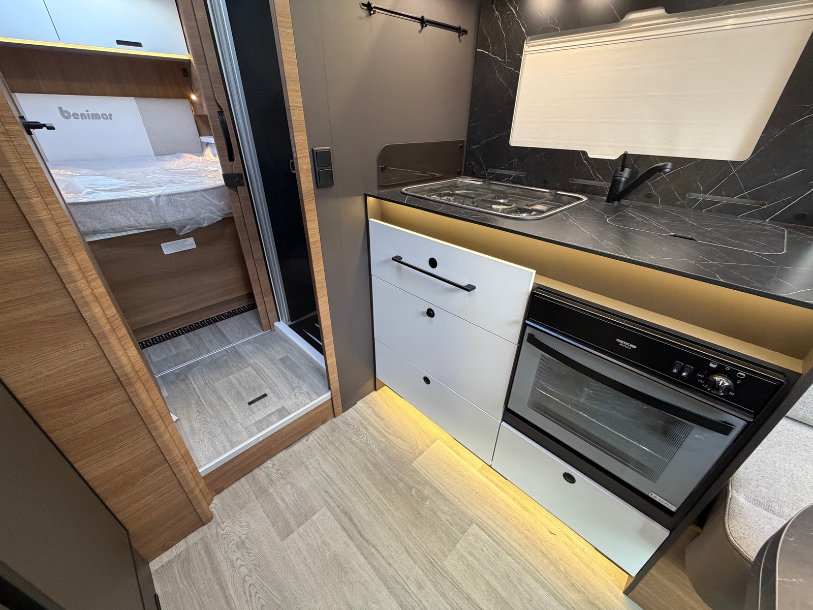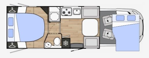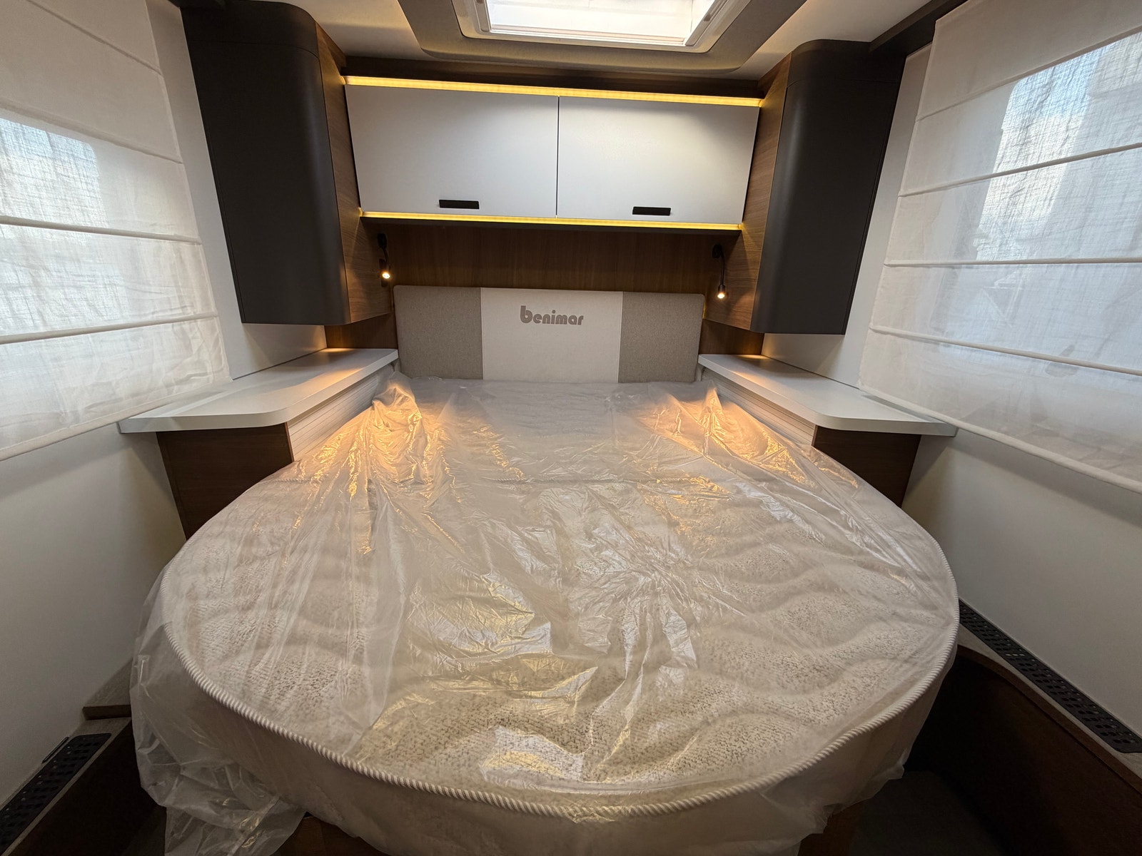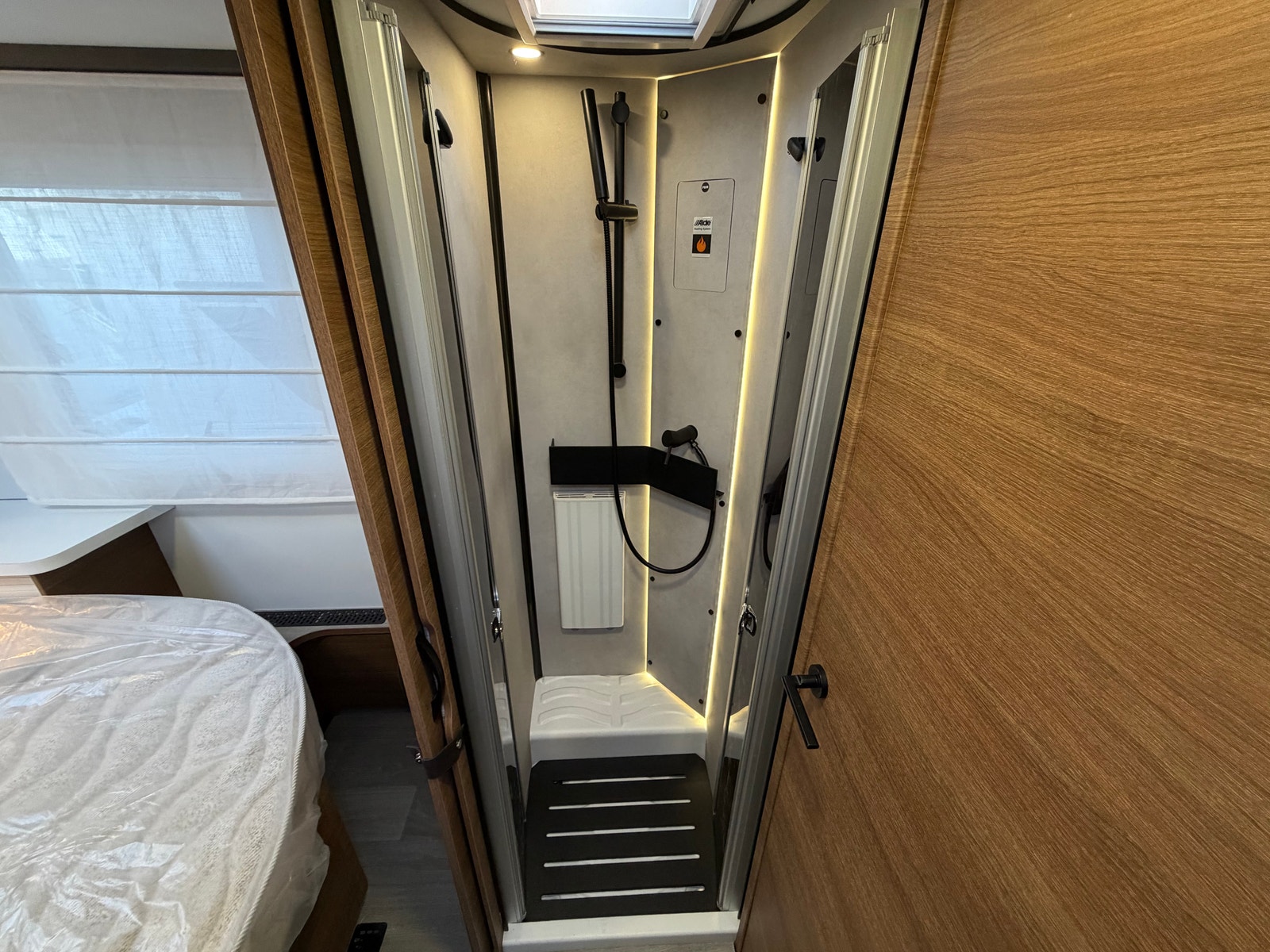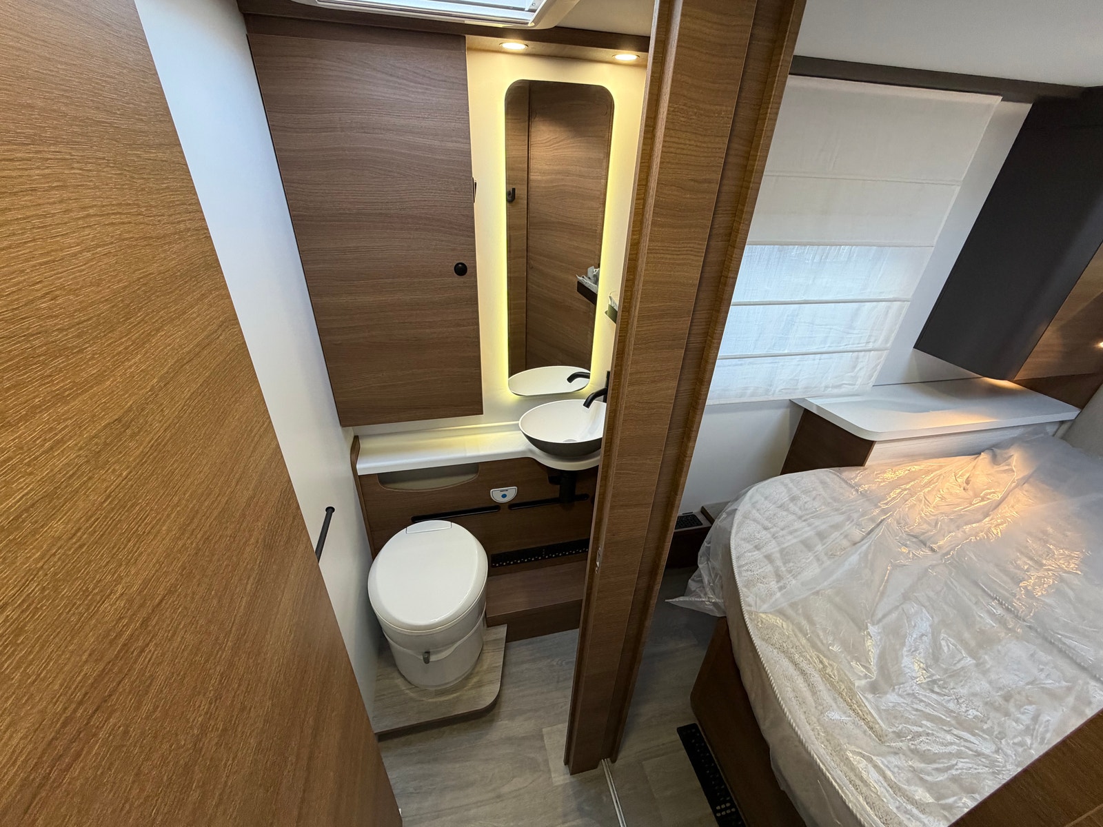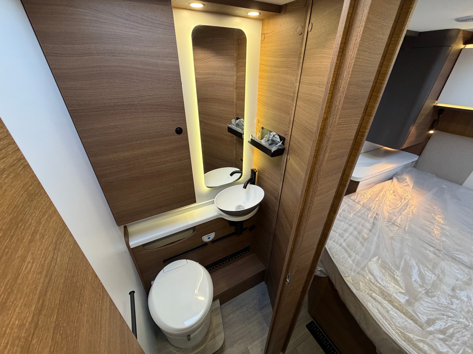Bak er det midtstilt dobbelseng og godt med skapplass. Det er separert toalett og dusj og mulighet for å lukke igjen dør frem mot kjøkken. Det er også skyvedør fra soverom og inn mot bad/toalett. Perfekt bil for opptil 4 personer.