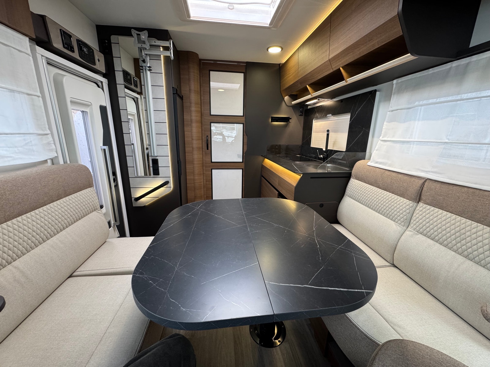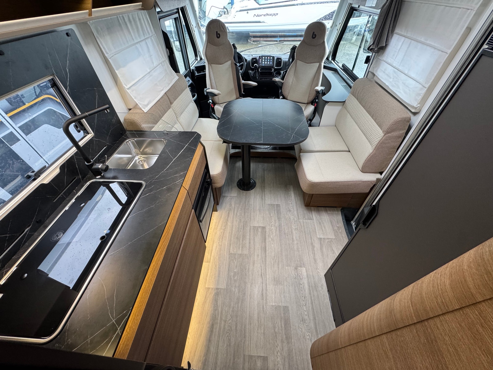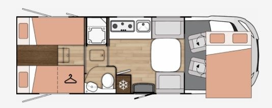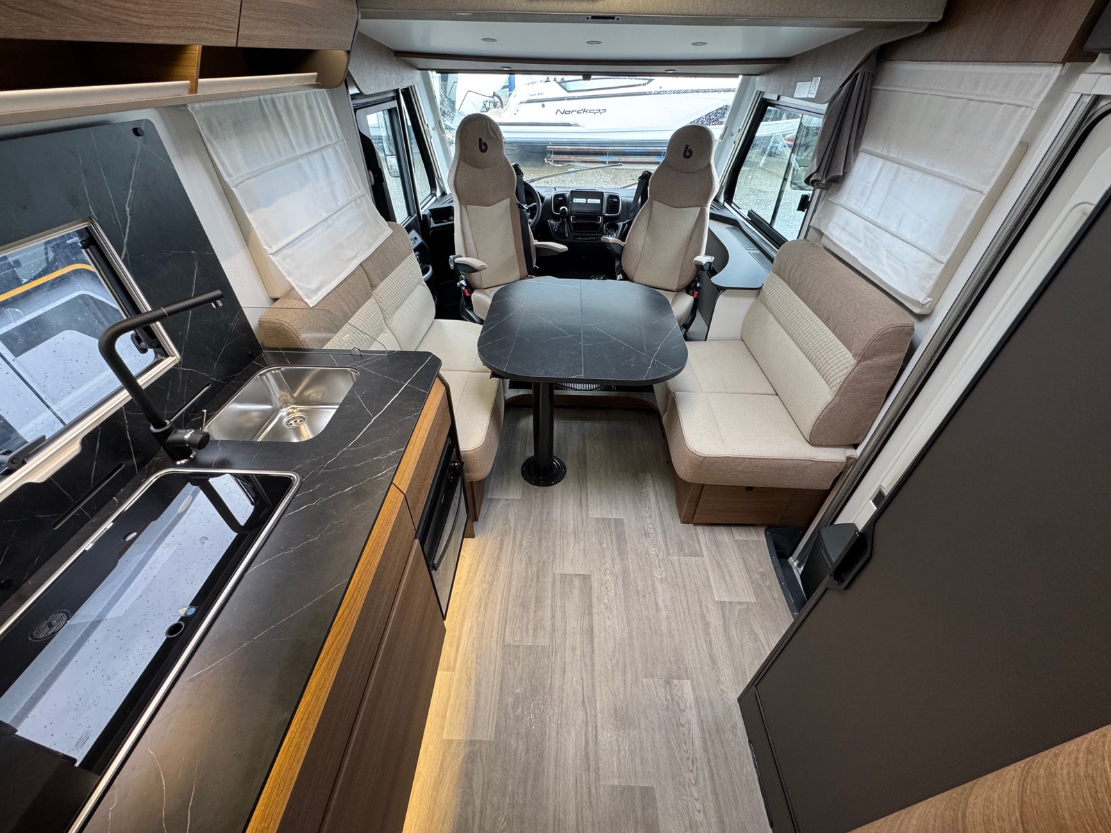 «Face to Face» løsningen ved salong gjør at du får en meget romslig sittegruppe, spesielt siden salongbord er foldbart. passasjer 3 og 4 vil også sitte behagelig under kjøring ved denne type løsning. Takseng i front kan være nede uten at det går utover salong.