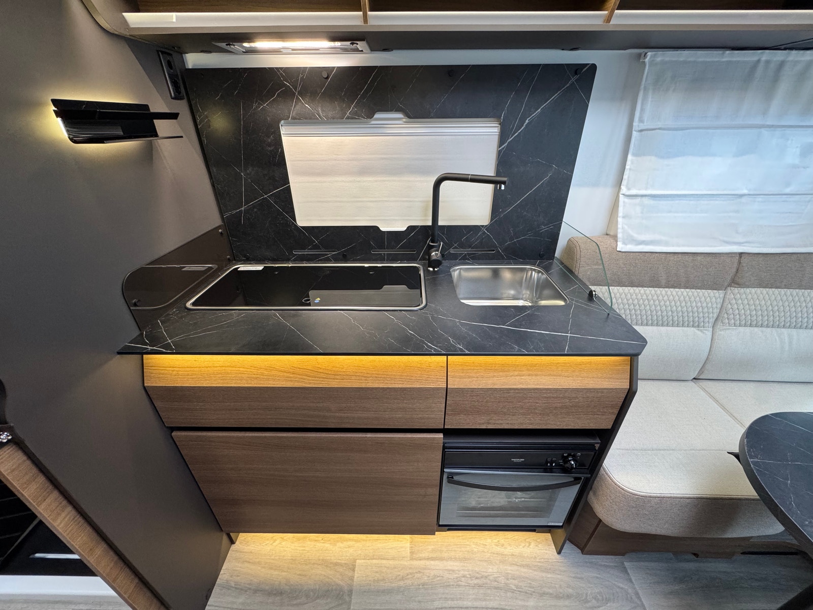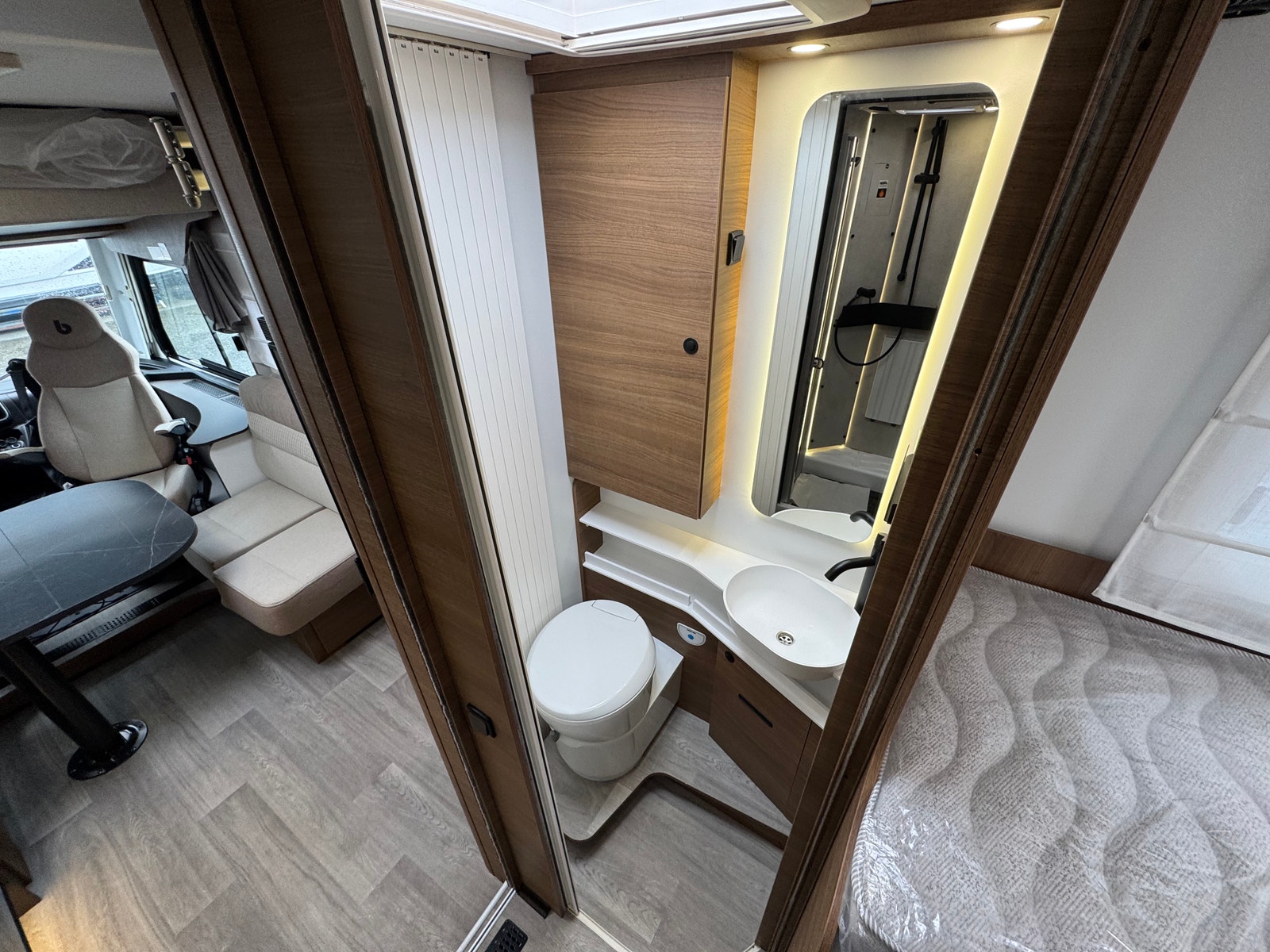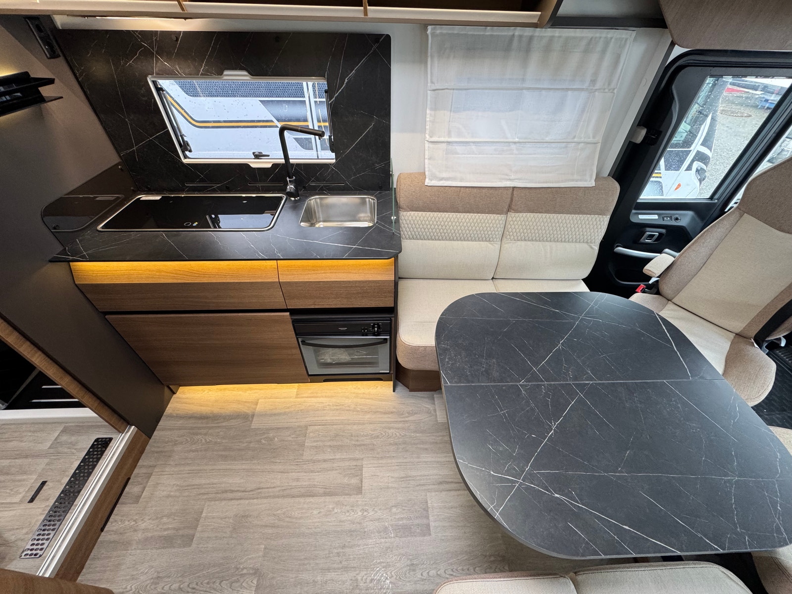 «Face to Face» løsningen ved salong gjør at du får en meget romslig sittegruppe, spesielt siden salongbord er foldbart. passasjer 3 og 4 vil også sitte behagelig under kjøring ved denne type løsning. Takseng i front kan være nede uten at det går utover salong.