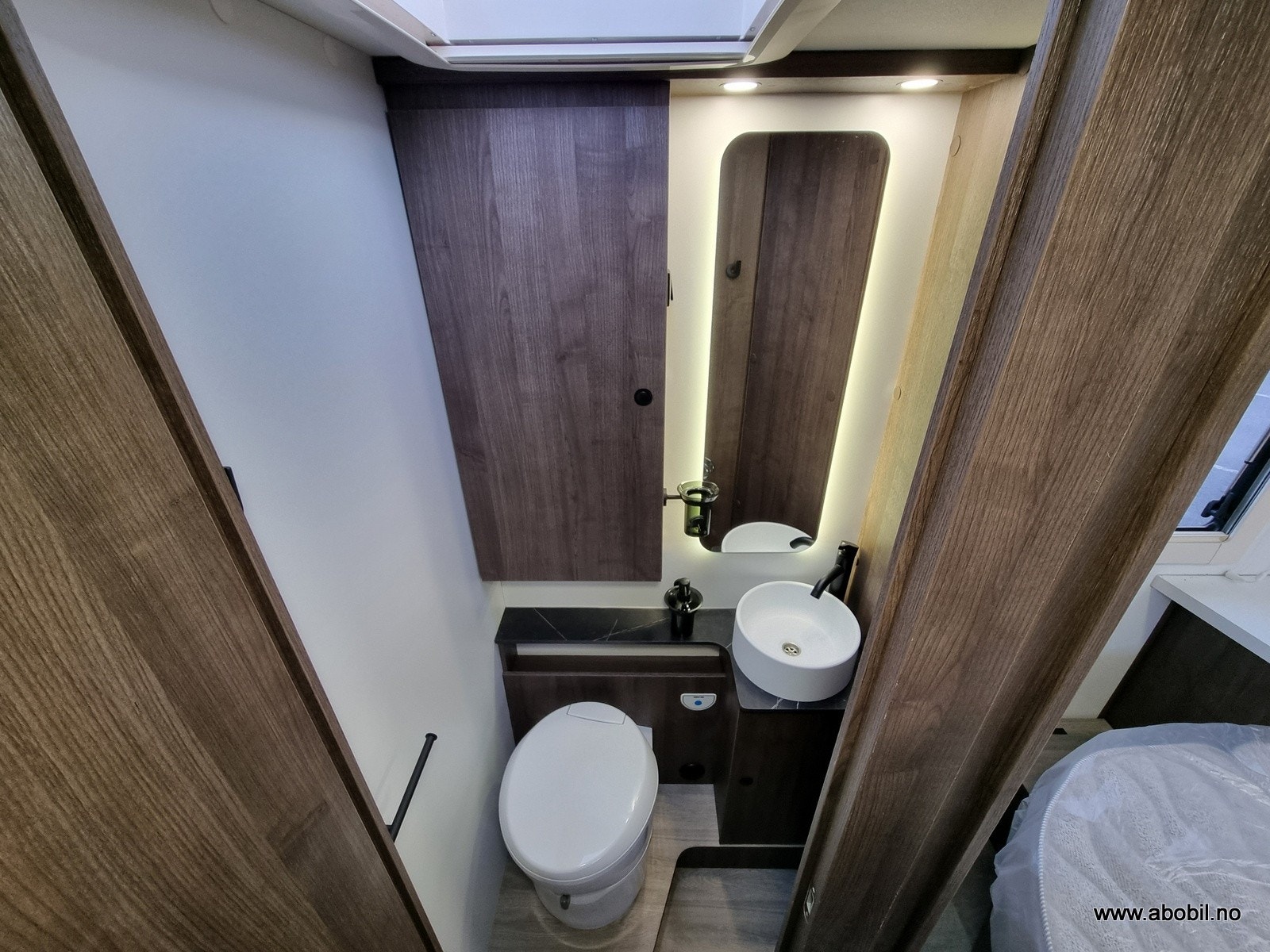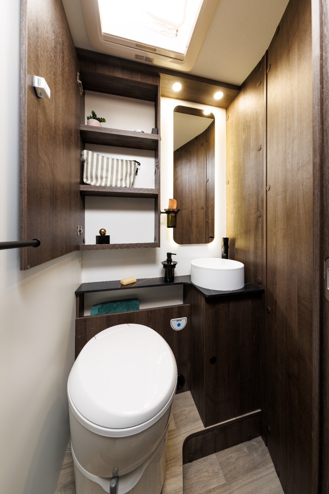 Praktisk baderom med separat dusj. Dusjen har takluke for god utlufting og nedtrekkbar stang for håndkle. To avløp i dusjen for ekstra god drenering. Baderommet er i eget separat rom med svingbart toalett for å frigjøre mer plass. Flotte detaljer som stort speil, såpeholdere, skapplass for toalettsaker og en egen takluke.