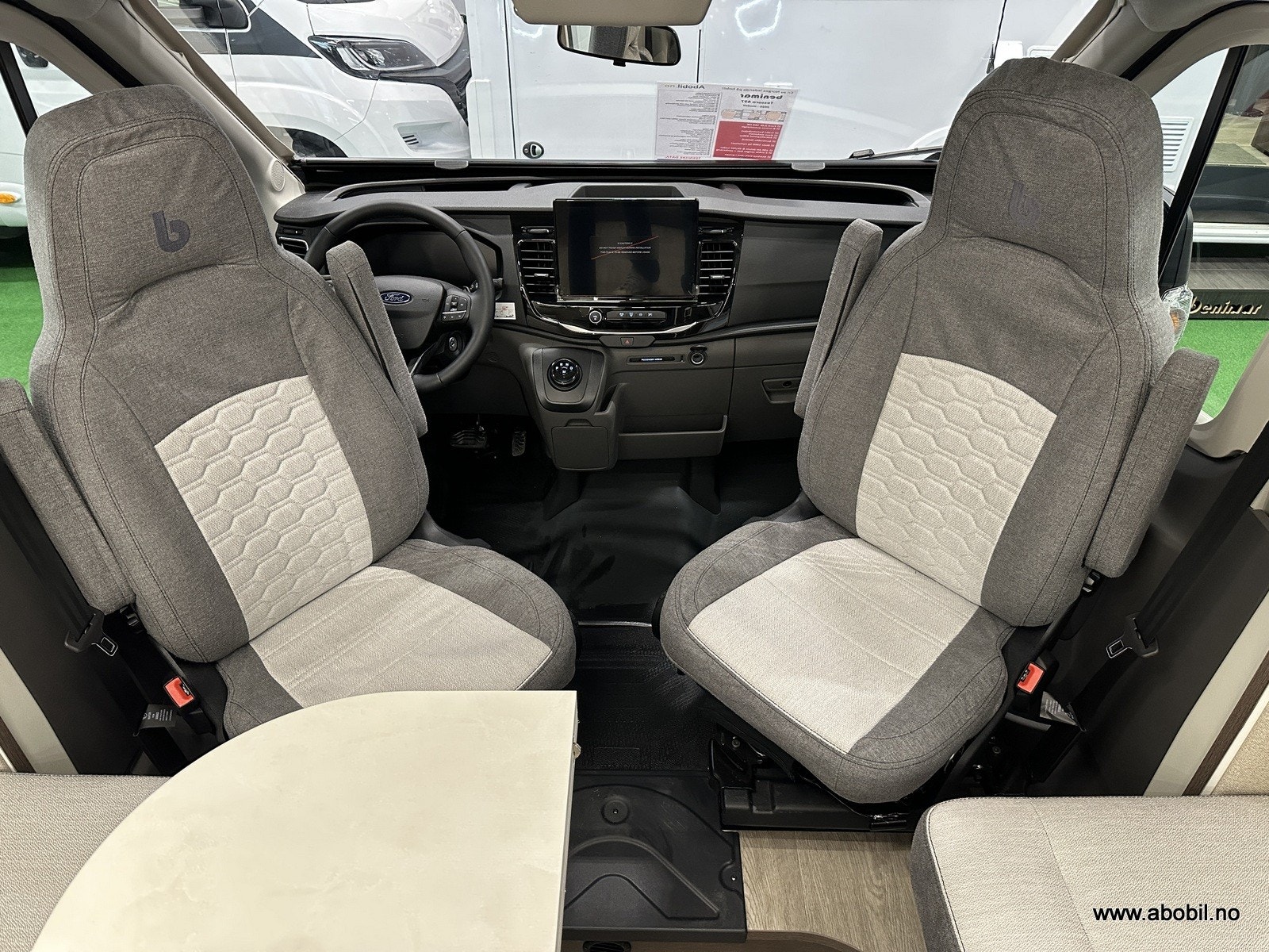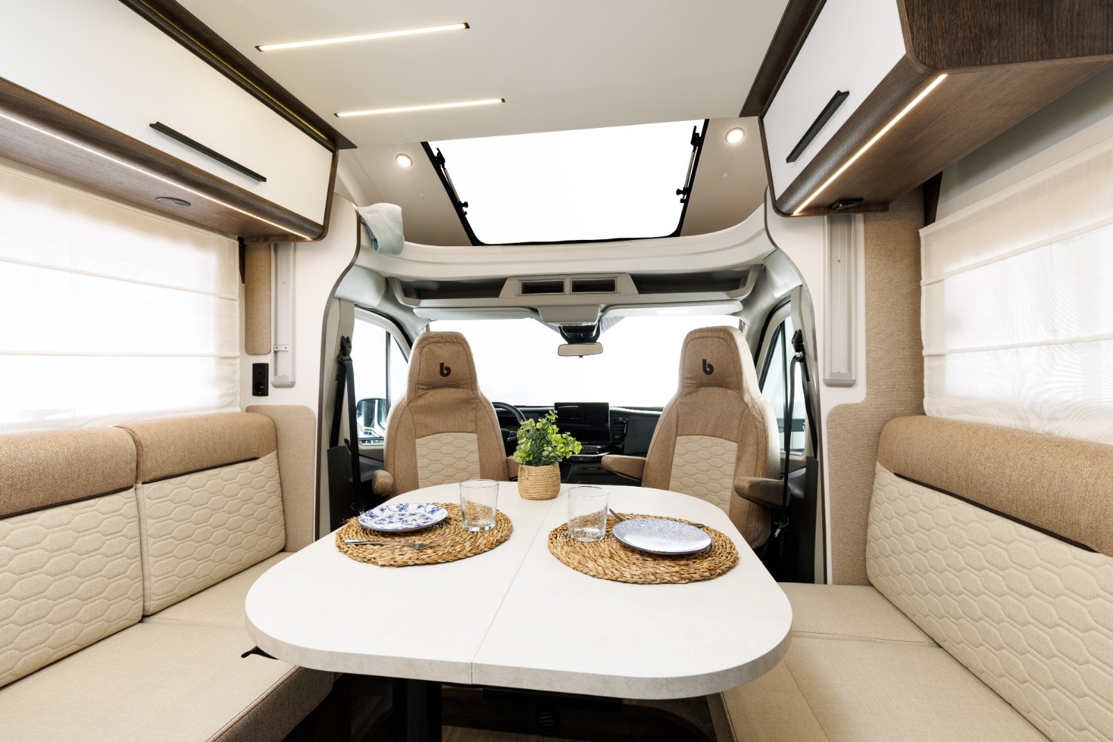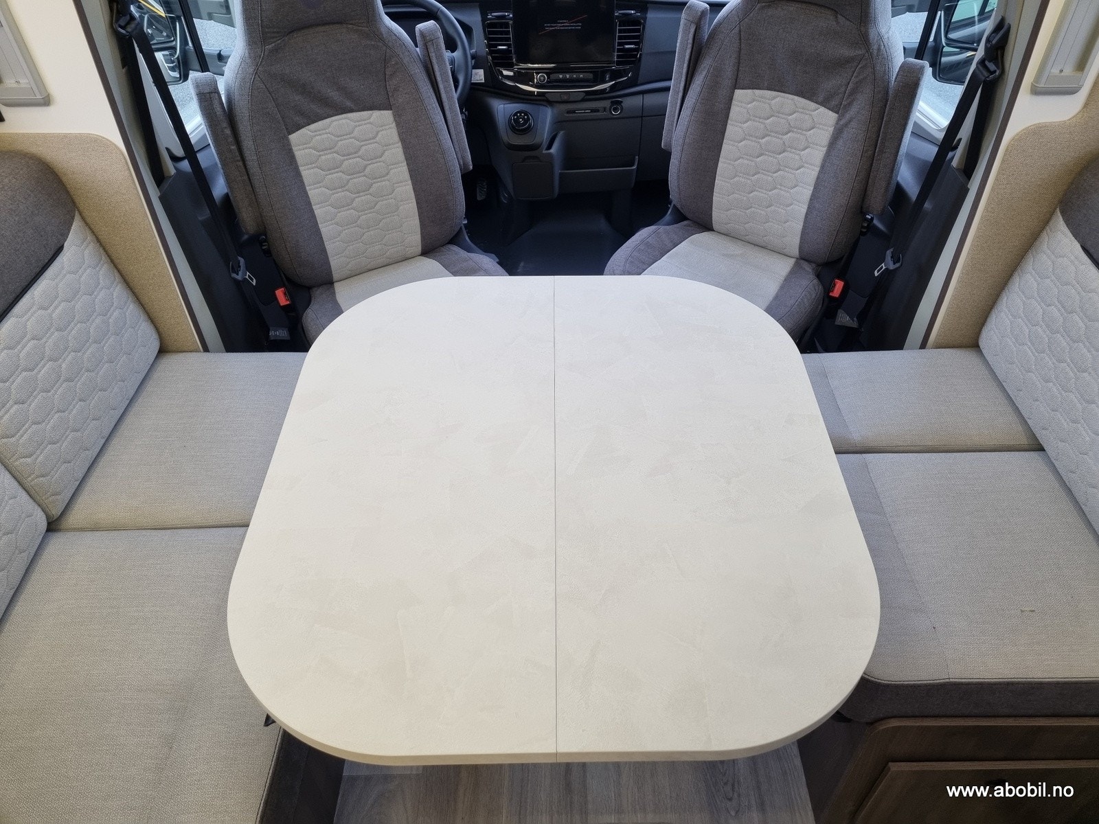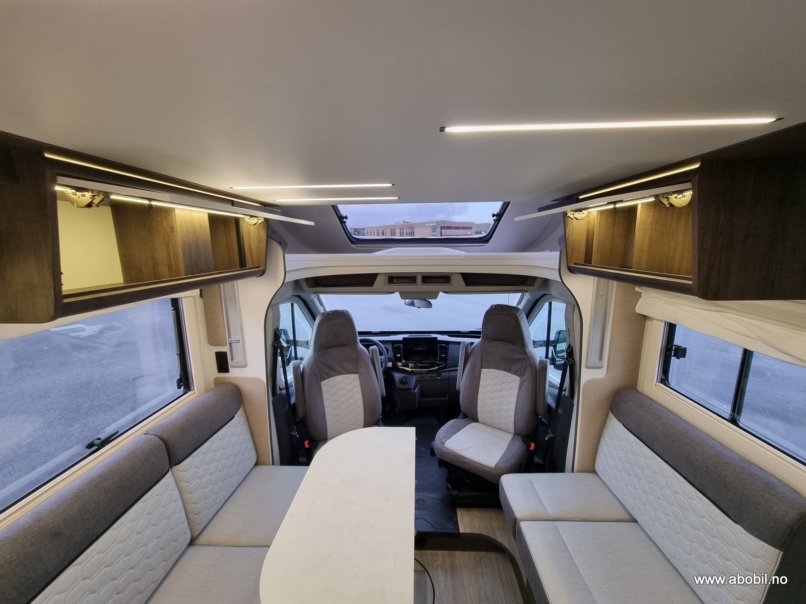 Romslig og sittegruppe med en nydelig Face-to-face løsning og et multiregulerbart bord. LED-belysning i hele bodelen. Store vinduer samt panoramatakluke som enkelt kan åpnes. Alle vinduer og takluker har myggnetting og formørknings plissé/rollo-gardiner. Flere ladepunkter for mobil, nettbrett osv.