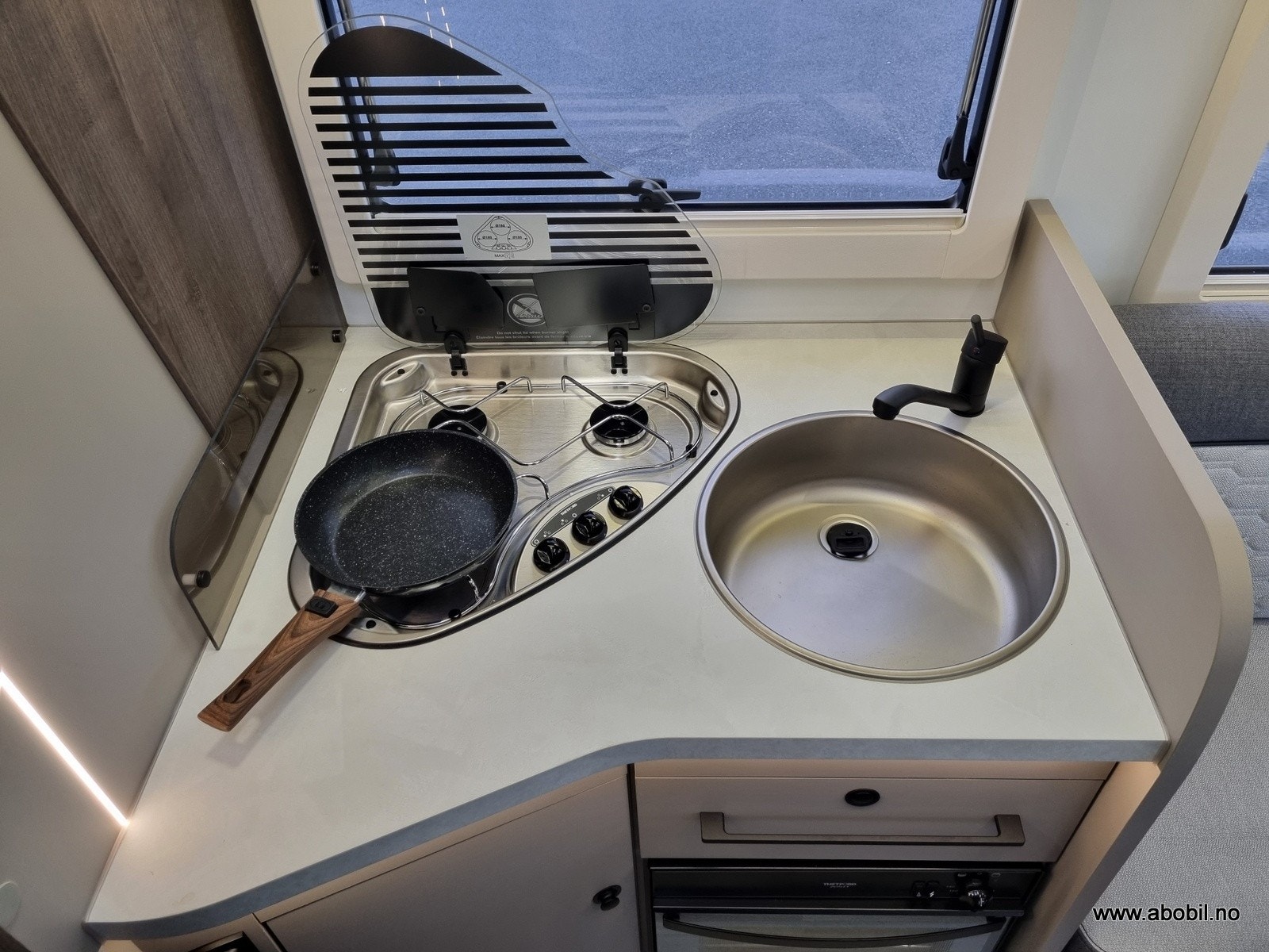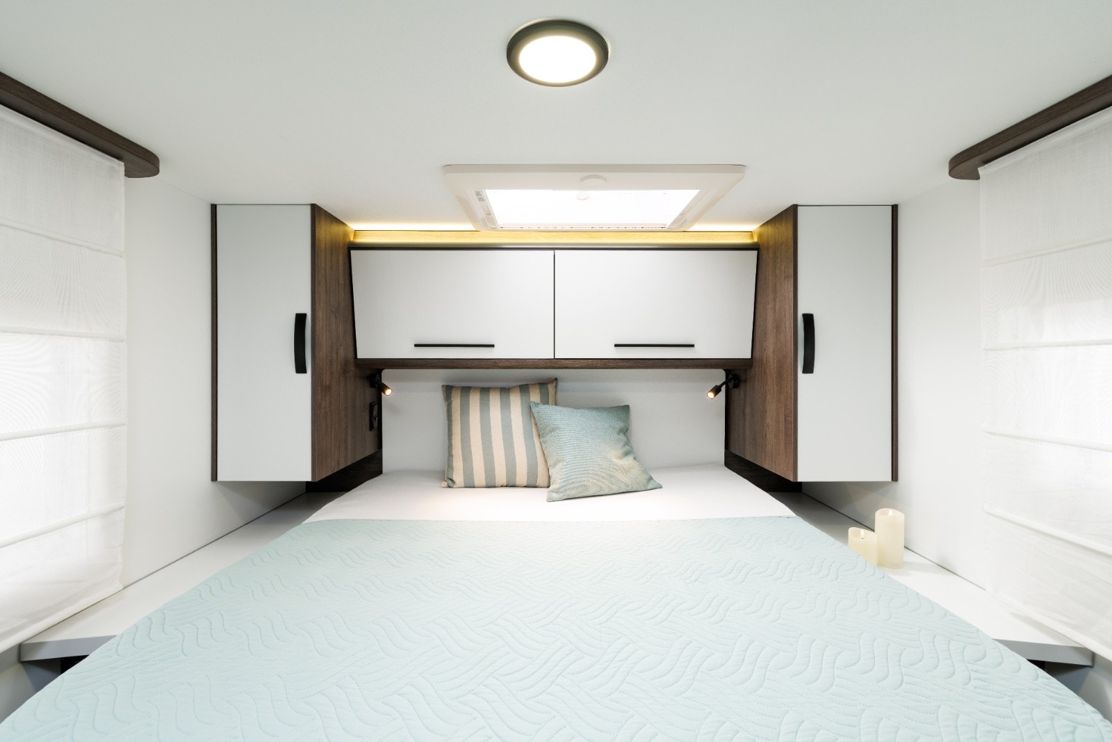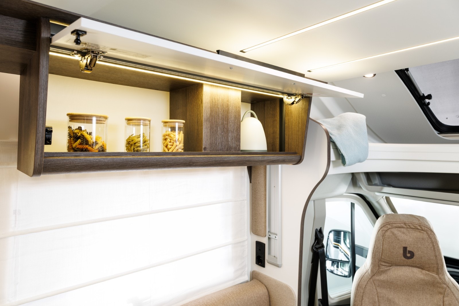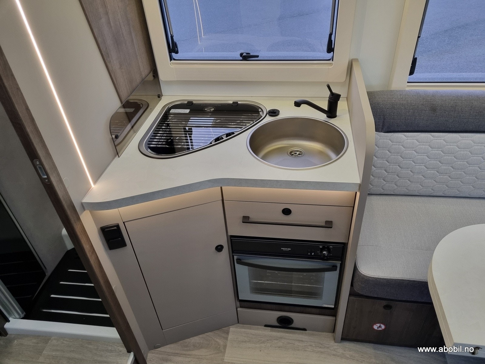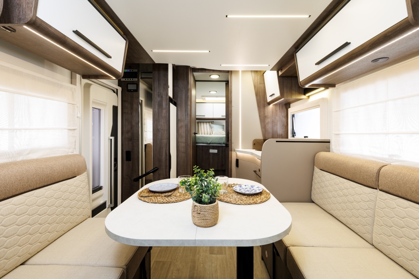 Romslig og sittegruppe med en nydelig Face-to-face løsning og et multiregulerbart bord. LED-belysning i hele bodelen. Store vinduer samt panoramatakluke som enkelt kan åpnes. Alle vinduer og takluker har myggnetting og formørknings plissé/rollo-gardiner. Flere ladepunkter for mobil, nettbrett osv.