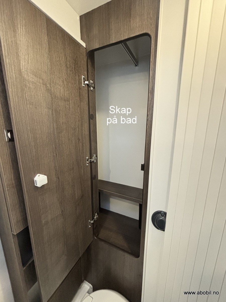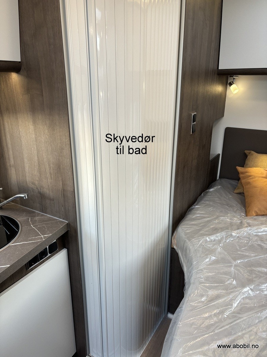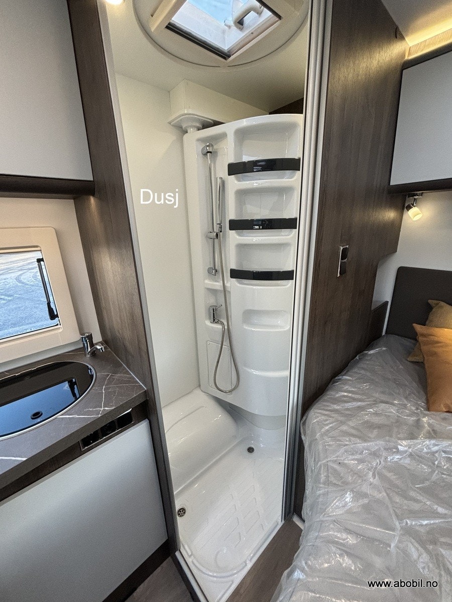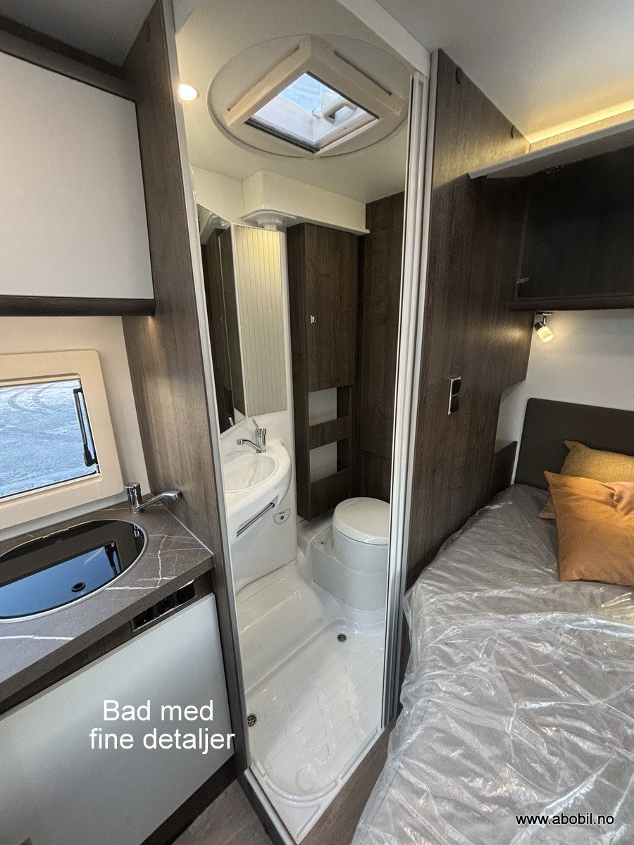Denne bobilen har en fantastisk smart og romslig planløsning. Hovedseng bak er en fransk løsning som gir ekstra god plass til romslig baderom. Baderommet kan enkelt omgjøres til en utrolig flott dusj ved å enkelt svinge veggen rundt.