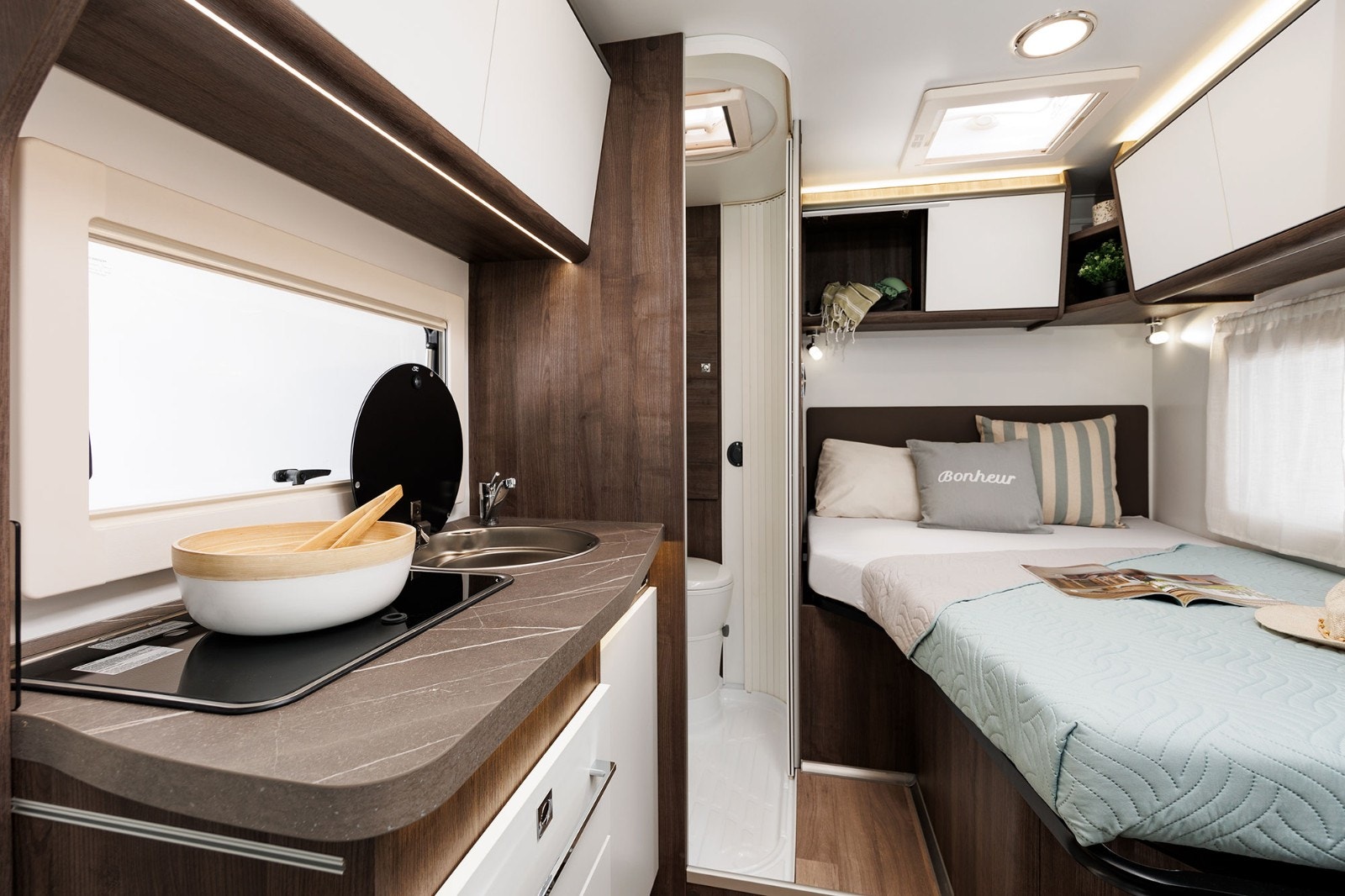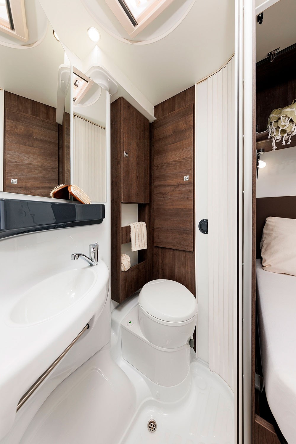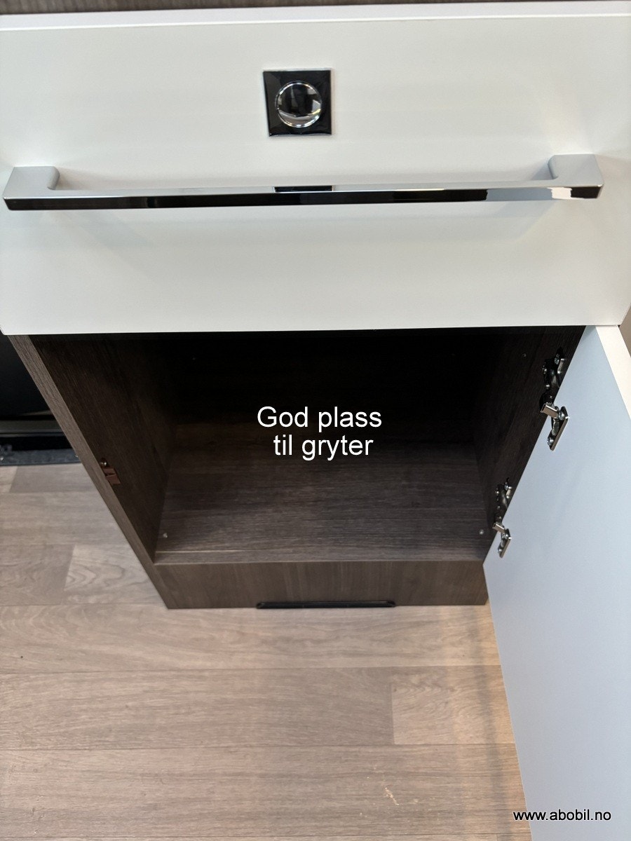 Denne bobilen har en fantastisk smart og romslig planløsning. Hovedseng bak er en fransk løsning som gir ekstra god plass til romslig baderom. Baderommet kan enkelt omgjøres til en utrolig flott dusj ved å enkelt svinge veggen rundt.
