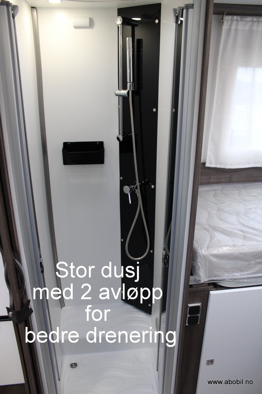 Det er 2 avløp i dusjen på denne modellen Benimar for ekstra god drenering selv med litt helling på bodelen ved f.eks fricamping.