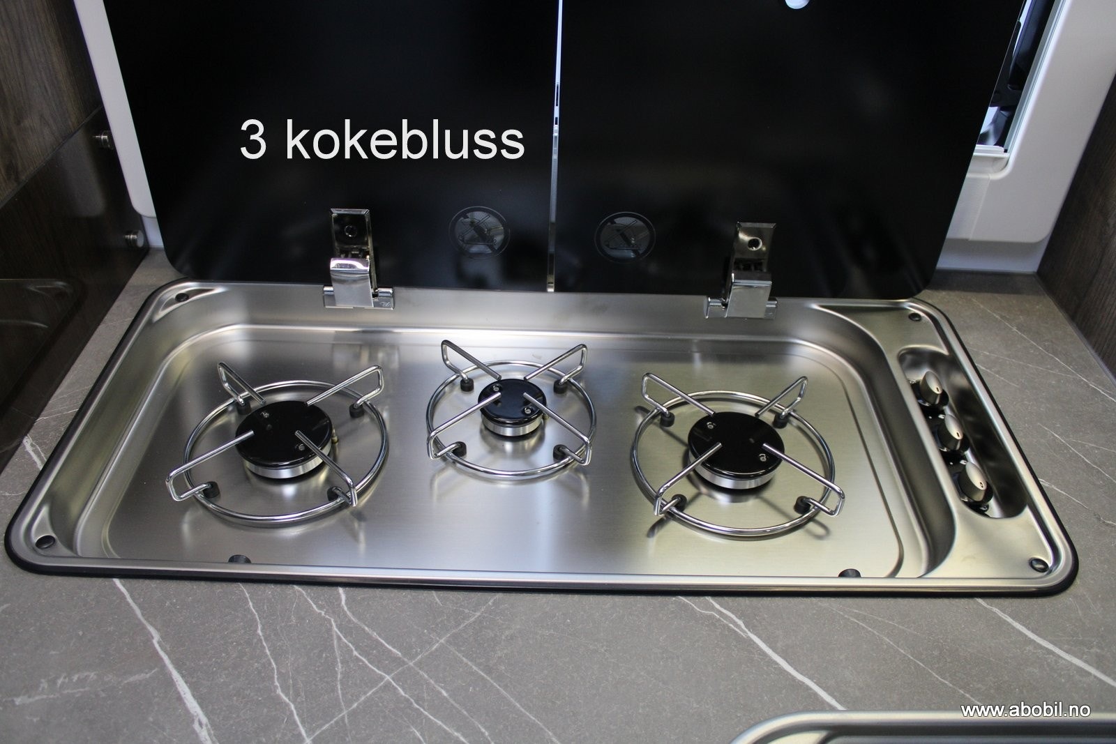 Tre gassbluss med elektrisk tenning og egen 2 delt glassplate som beskytter kokebluss + gir mer benkeplass.