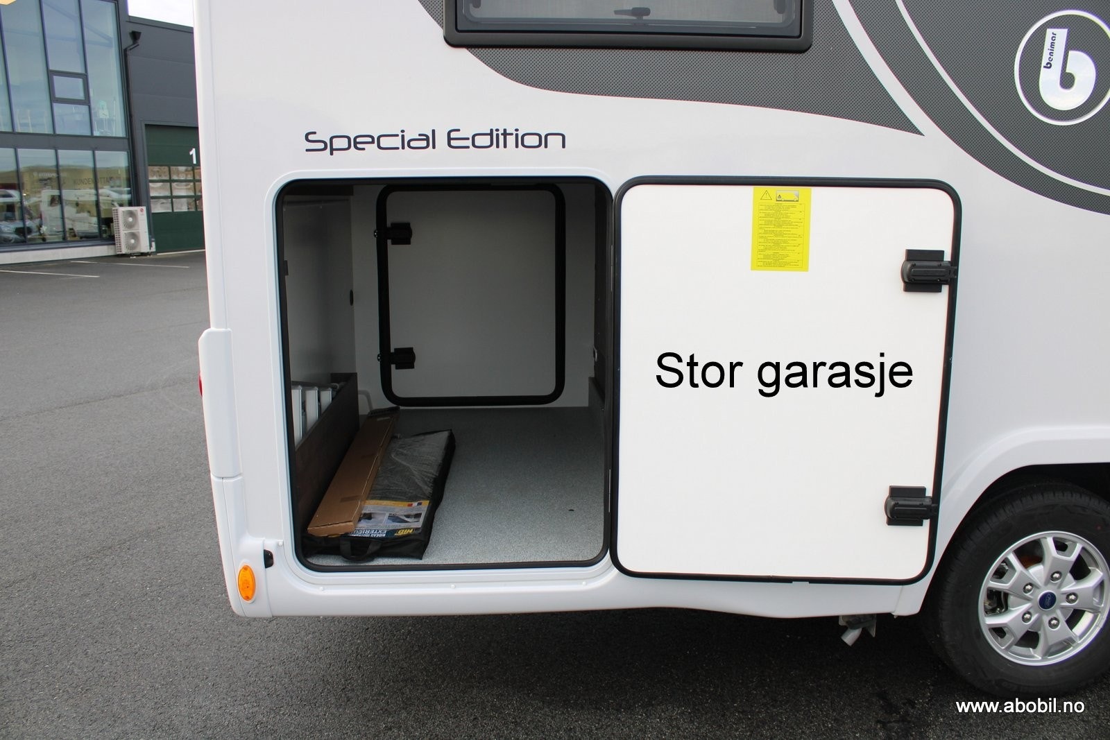 Benimar Tessoro 463 har stor garasje med tilgang på begge sider via store luker.