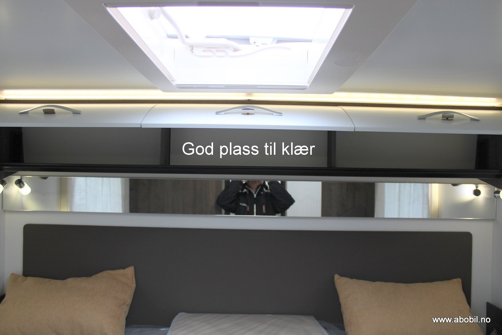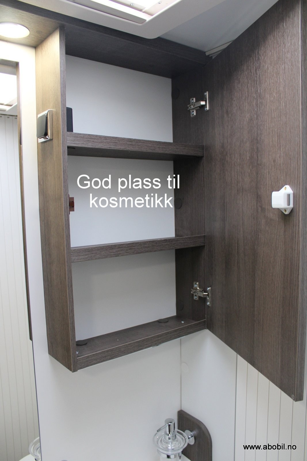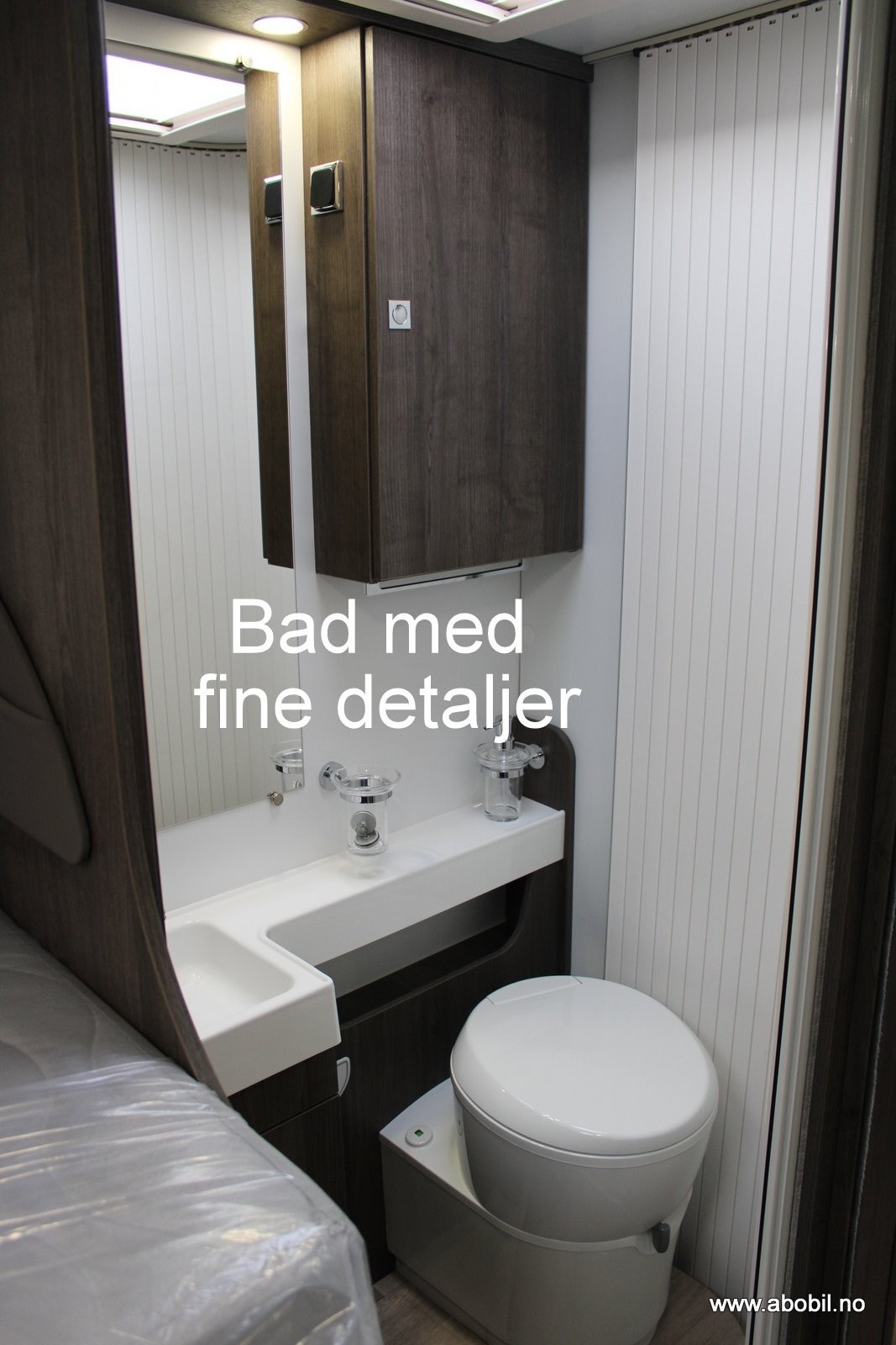 Baderommet er i eget separat rom med svingbart toalett og flotte detaljer som stort speil, såpeholdere, skapplass for toalettsaker og en egen takluke også her.