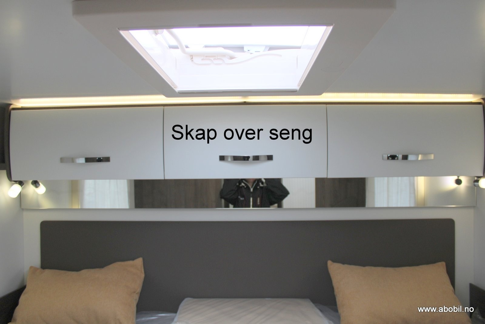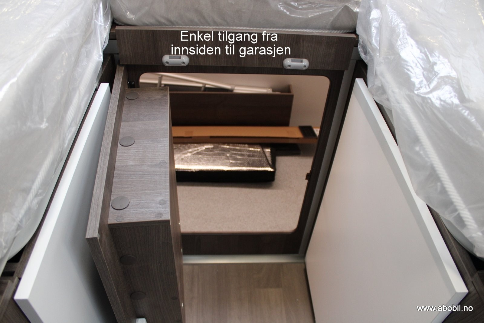 God oppbevaring over selve sengen samt leselys og garasjetilgang under sengen som gir rask og enkel tilgang til garasjen fra soverommet.