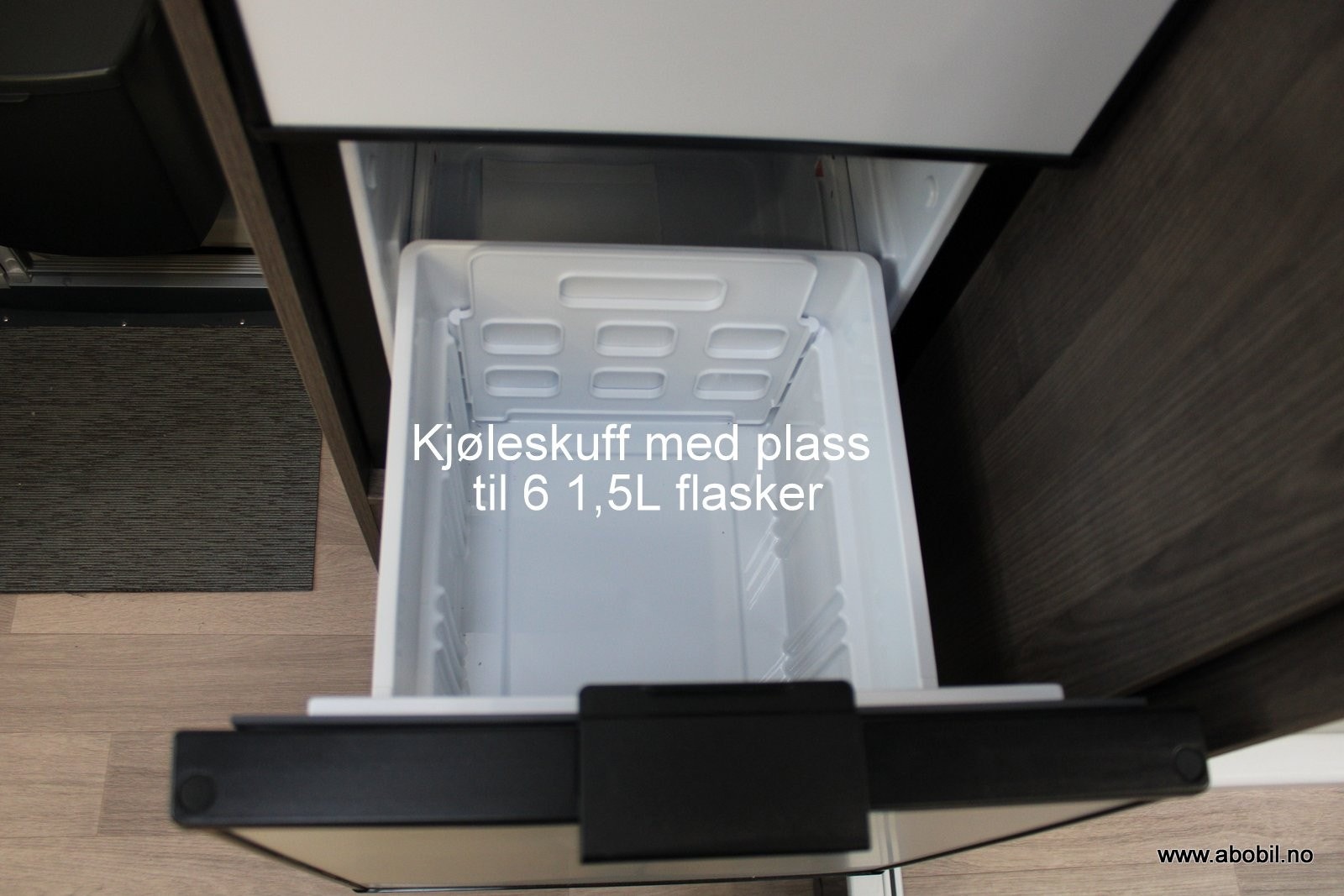 Stort automatisk kjøleskap (140 liter) med separat kjøleskuff til 9×1,5 l flasker og frysedel.