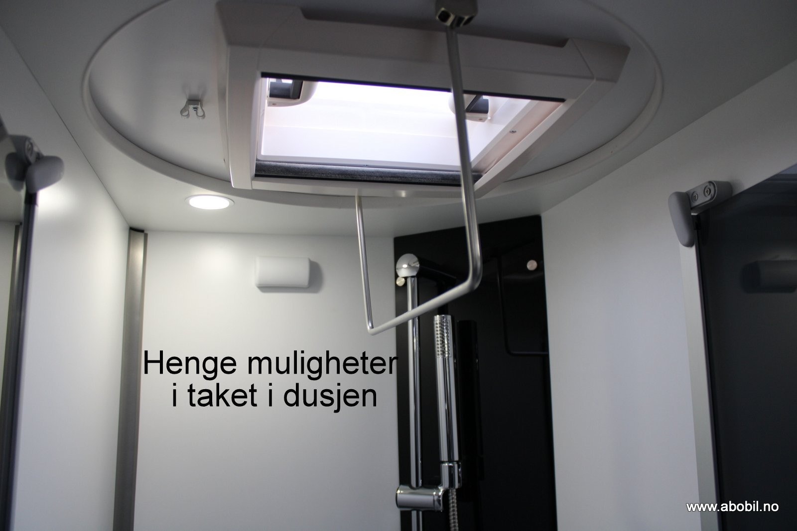 Separat dusj med takluke og nedtrekkbar stang for tørking av håndkle.