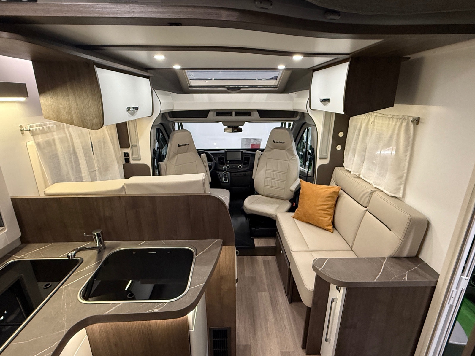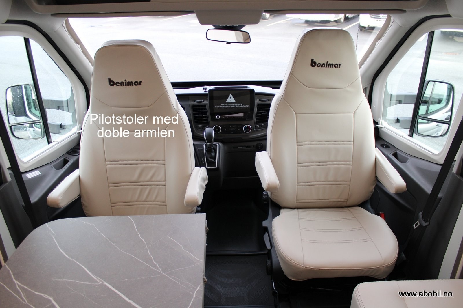 Førerdelen har også Ryggekamera, multifunksjonsratt i skinn, formørkning i alle vinduer, Regulerbare pilotstoler med armlene, cruisekontroll, varme i speil, varme i frontrute og det er også 4 veis regulerbart ratt. Denne bobilen oppleves nærmest som en flott personbil.