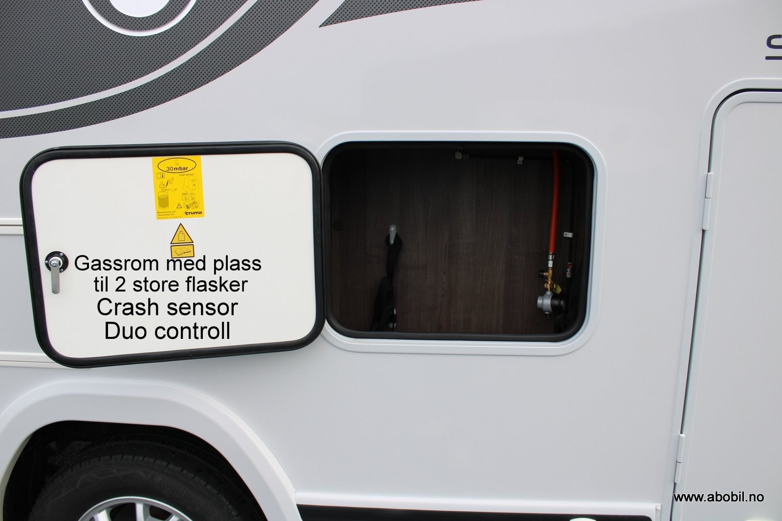 Bobilens kjøleskap, varmesystem, varmtvann og kokeblusstopper går på gass.