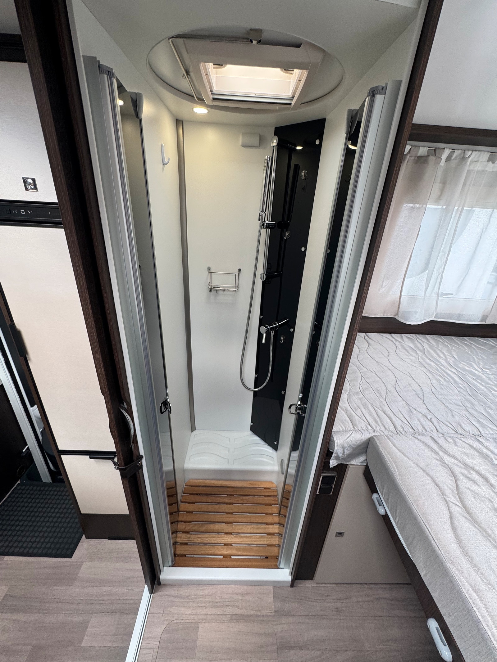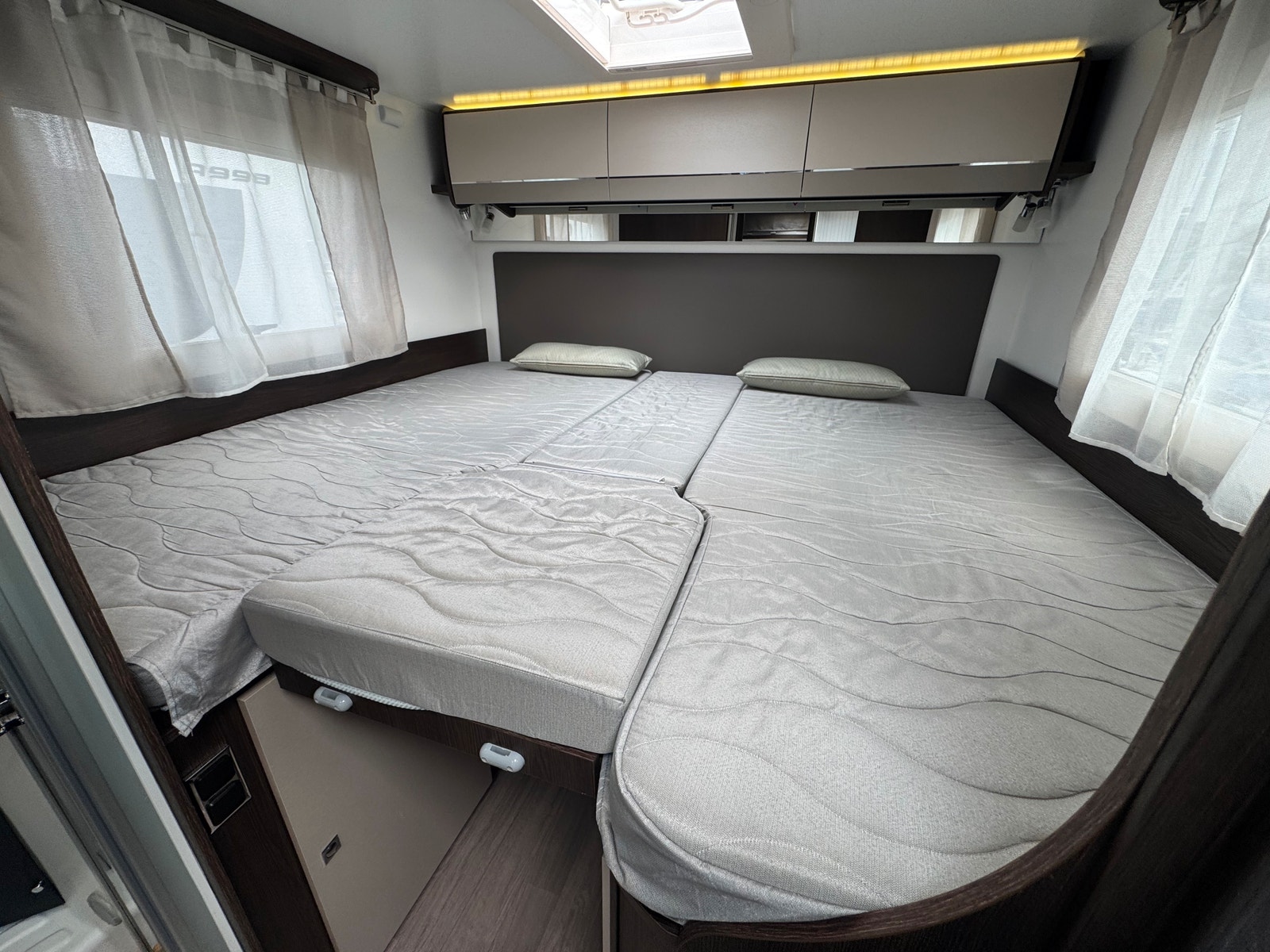 Tessoro 463 har altså to enkle senger bak, som lett kan gjøres om til en stor dobbelseng ved å trekke ut plate i midten. Det er også trapp opp til seng når ikke platen står ute.