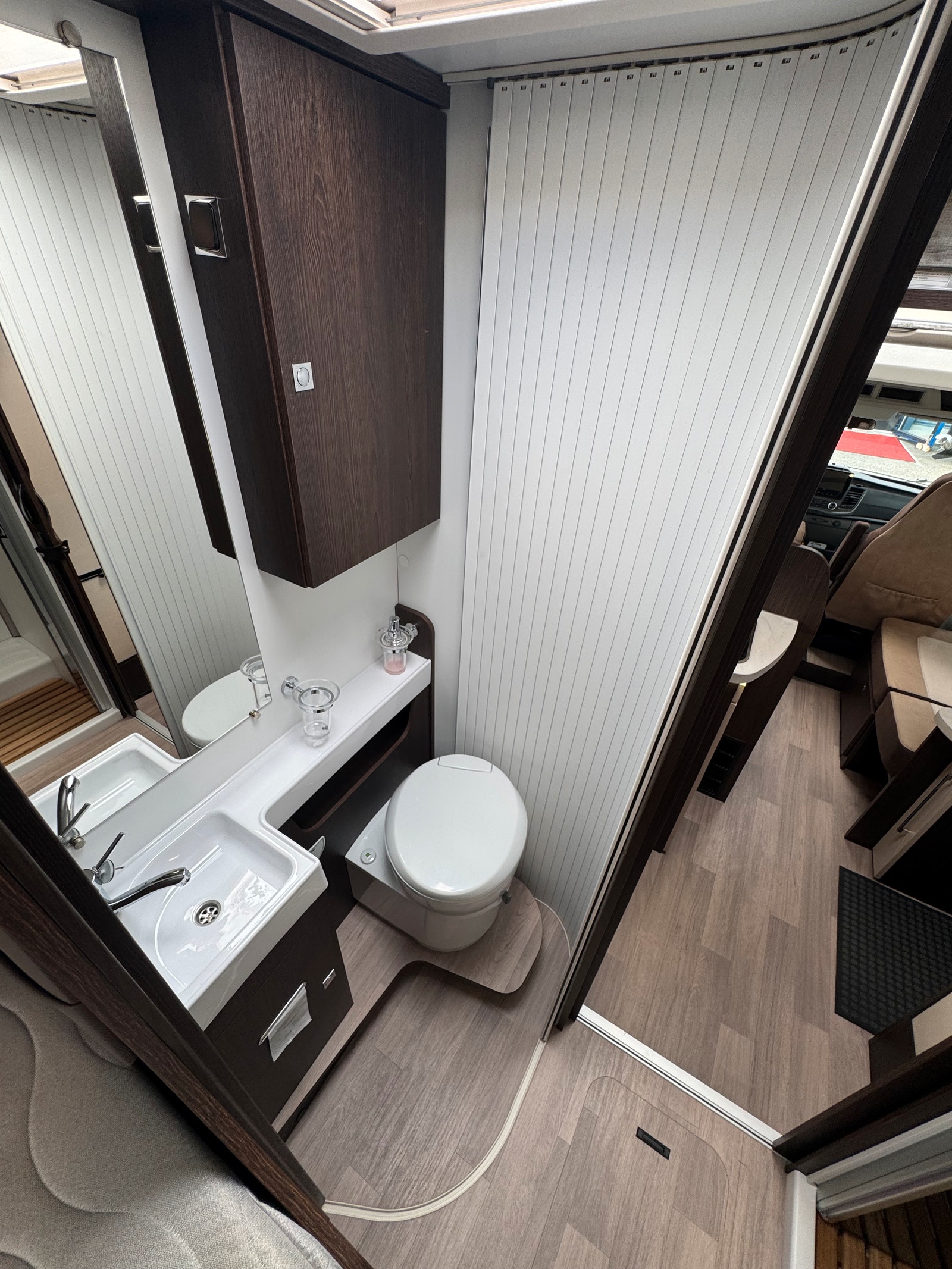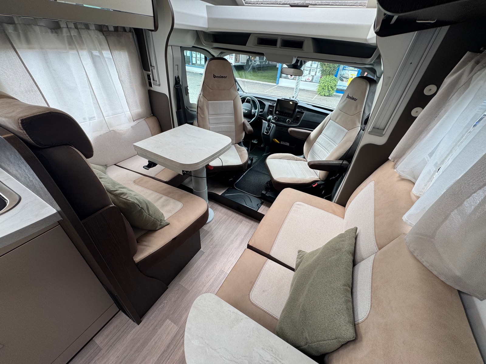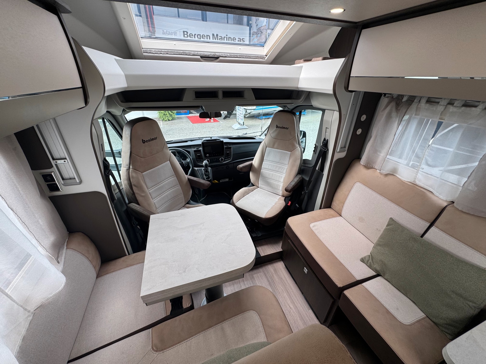 Bobilen er registrert for 4, salong er romslig og har 2 vendbare pilotstoler i front. Det er også en elektrisk takseng over salong, denne kan være nede uten at den står i veien for bodelsdør!