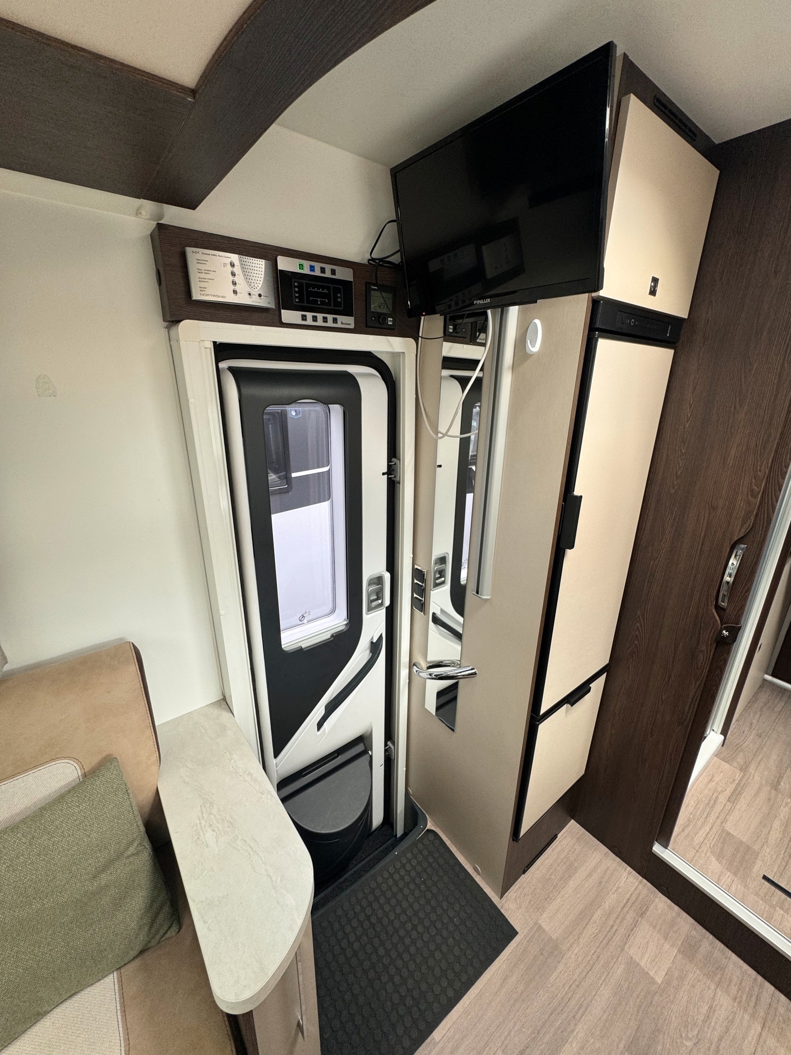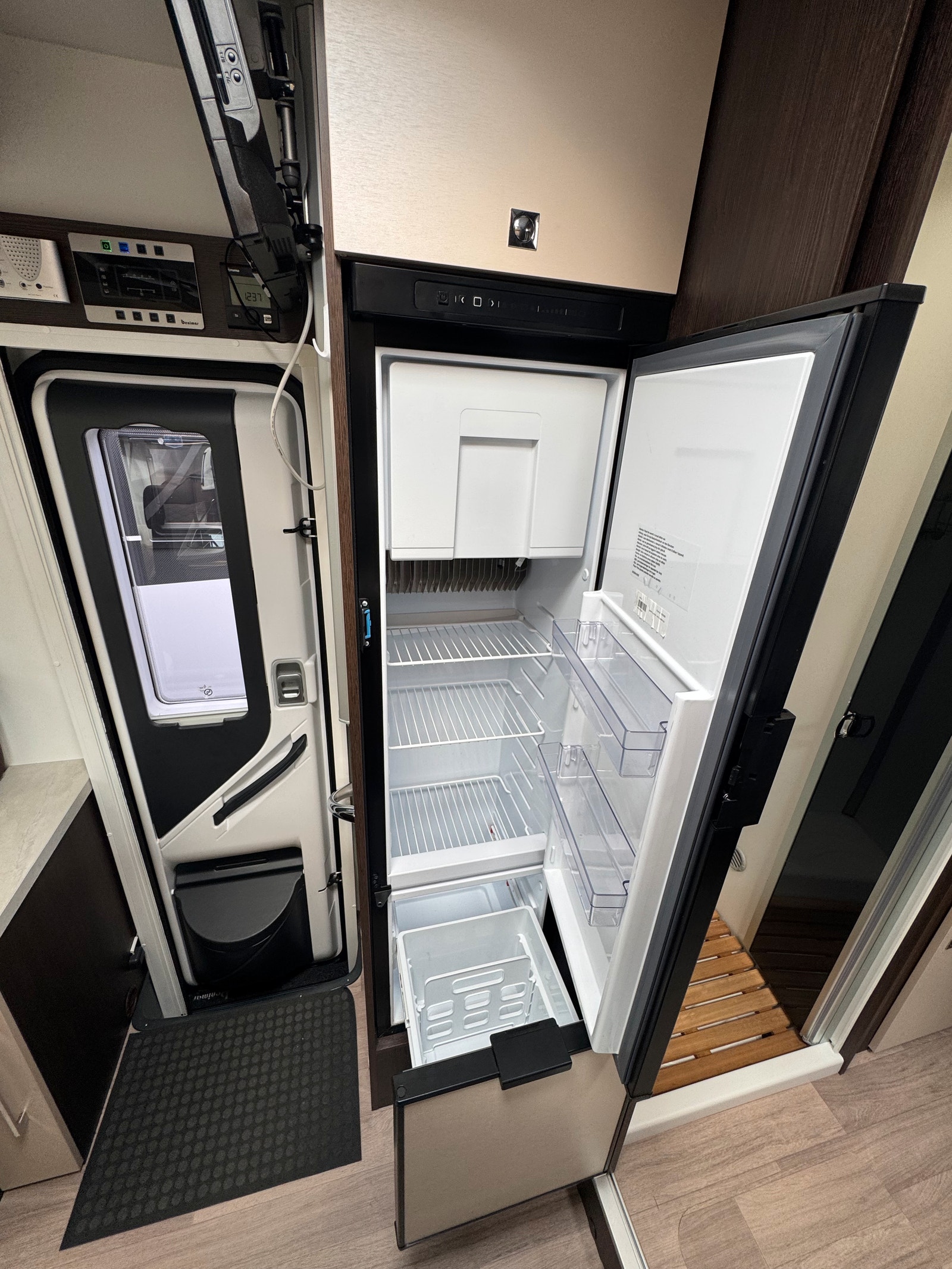 På kjøkken er det 3 gassbluss, stekeovn, stort kjøleskap med kjøleskuff og egen frys. Kraftig truma varmesystem som varmer opp vann på gass/strøm.