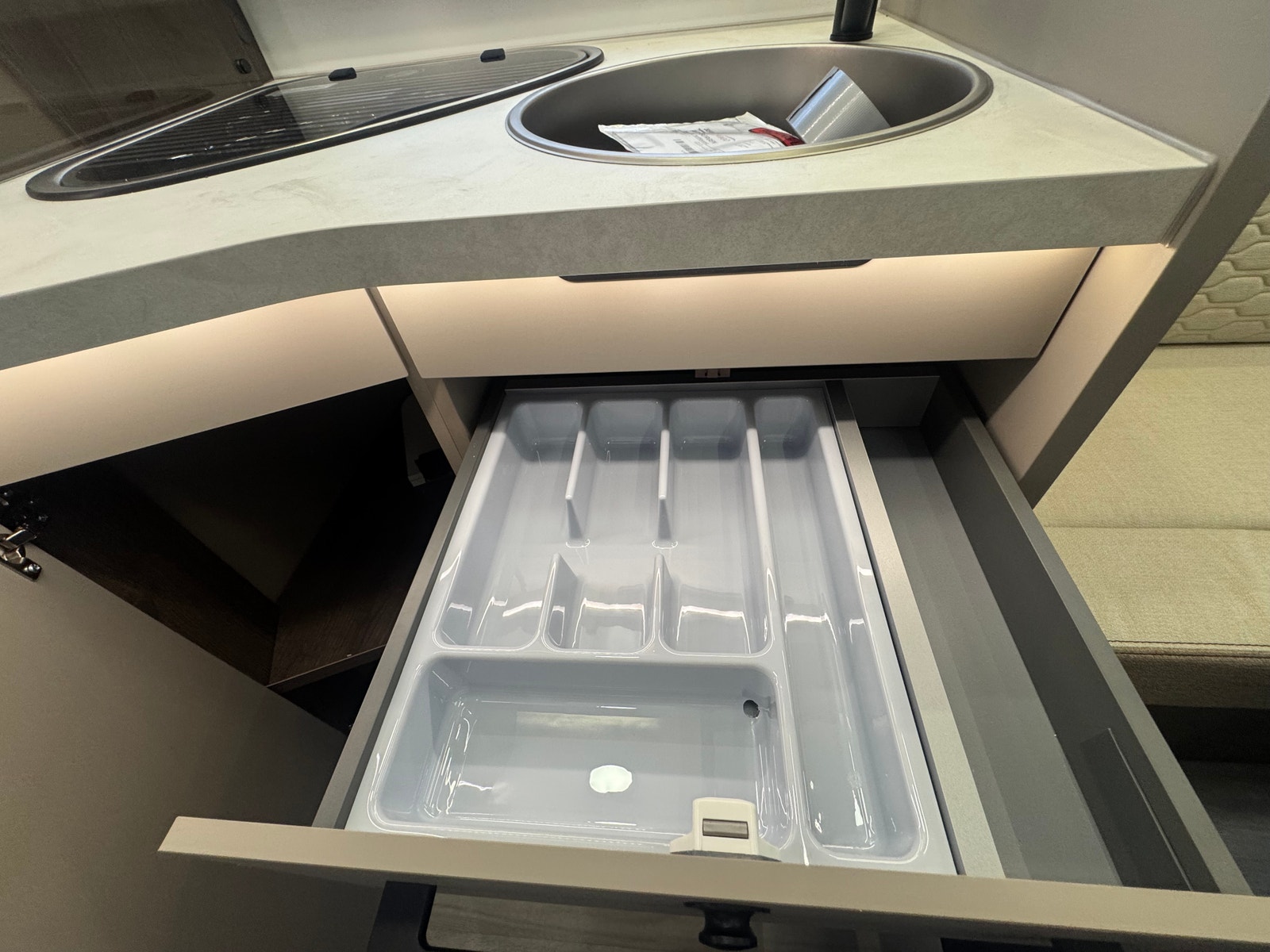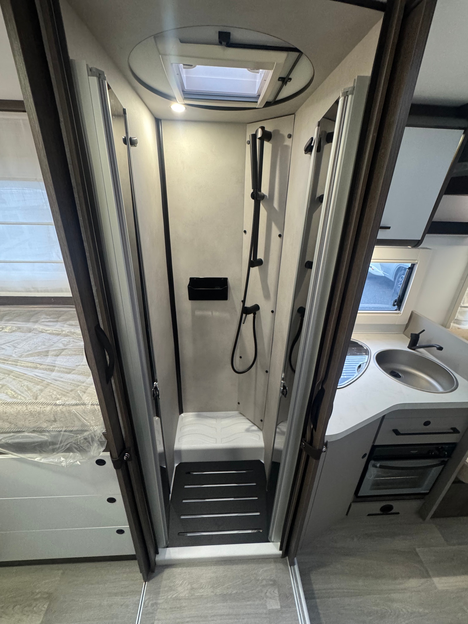 På kjøkken er det 3 gassbluss, stort kjøleskap med kjøleskuff og egen frys. Ekstra plate kan monteres ved behov for større plass. Kraftig truma varmesystem som varmer opp vann på gass/strøm.