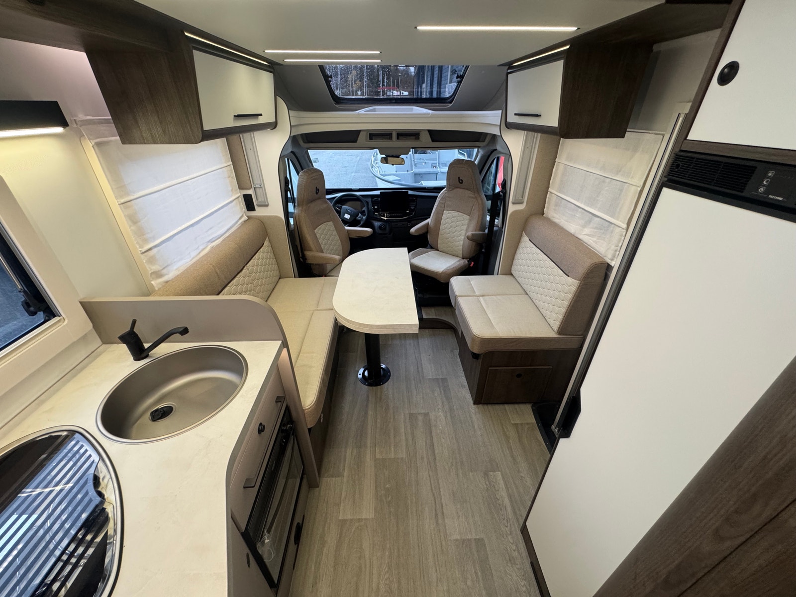 Bobilen er registrert for 4 og face-2-face salongen oppleves som meget romslig og har 2 vendbare pilotstoler i front. Det er også en elektrisk takseng over salong. Passasjerstoler ligger skjult i salong når de ikke er i bruk.