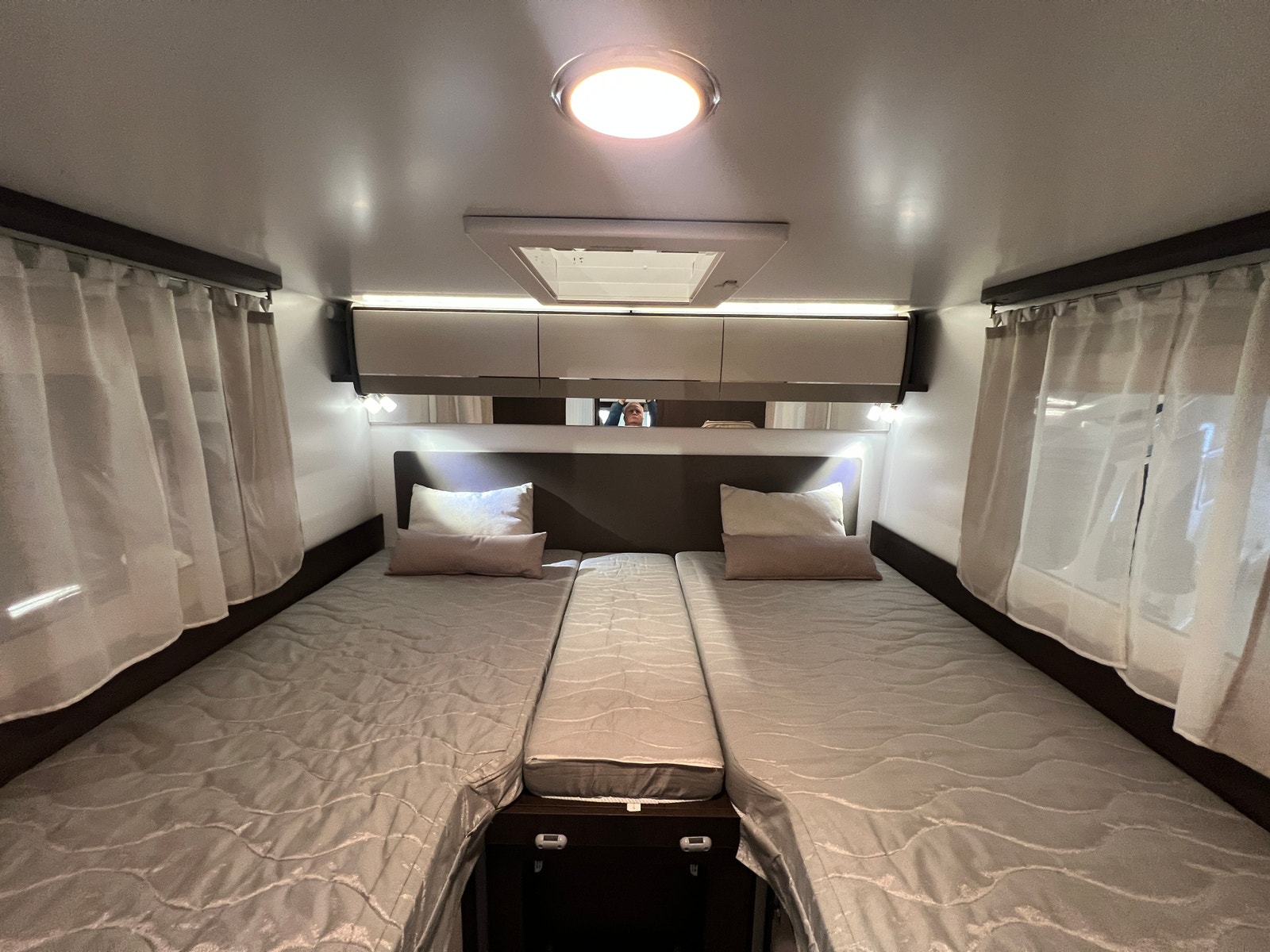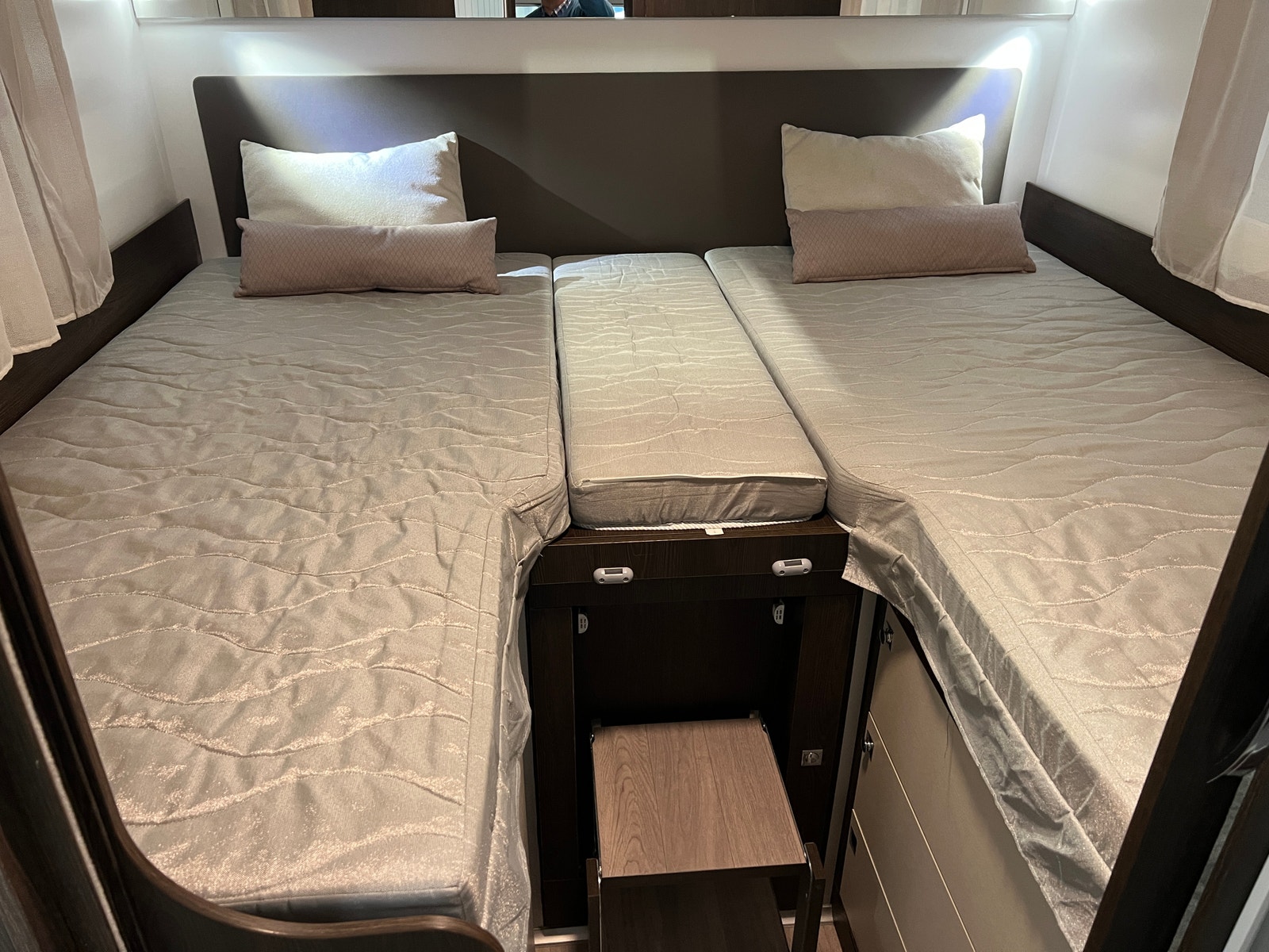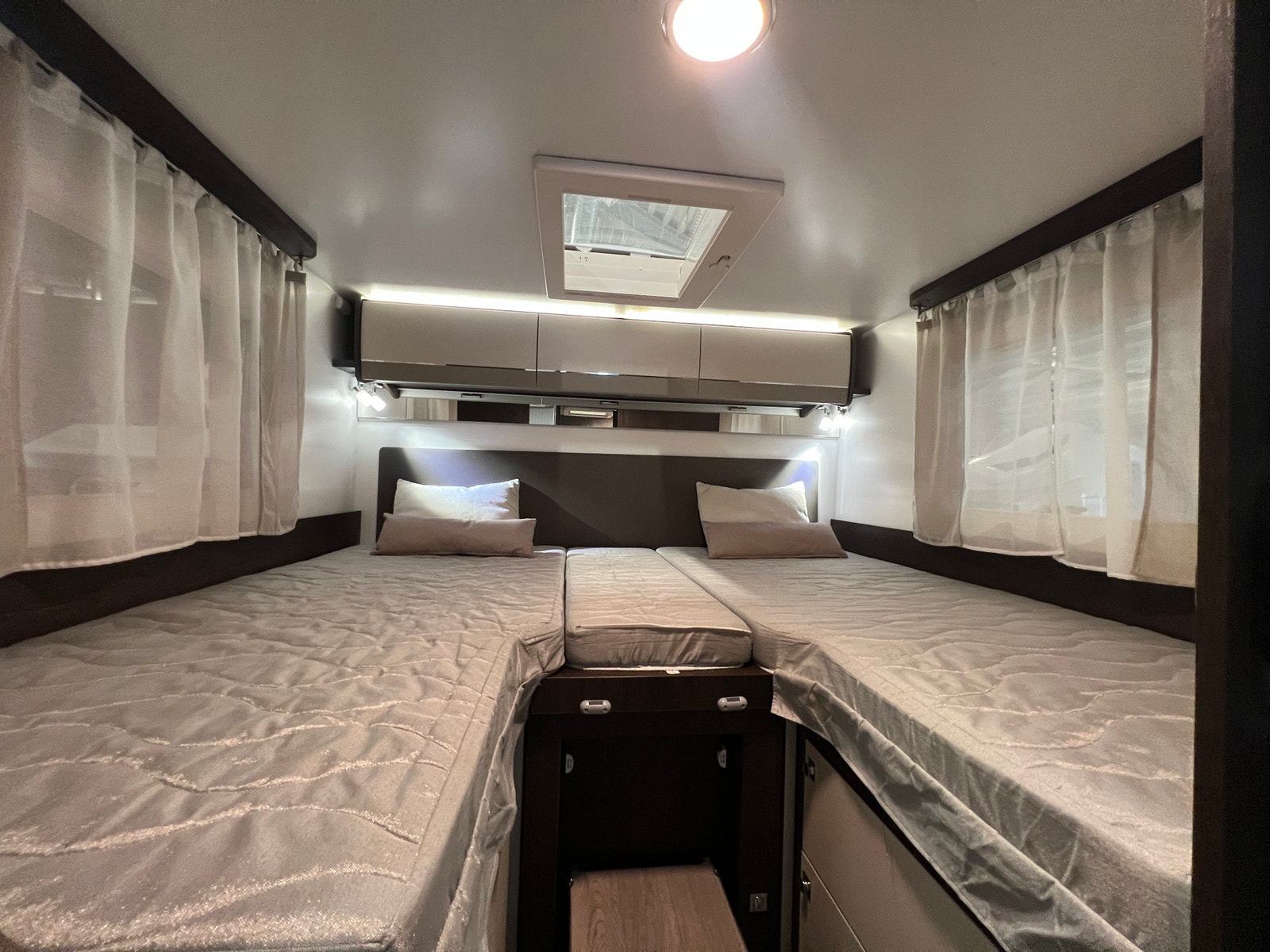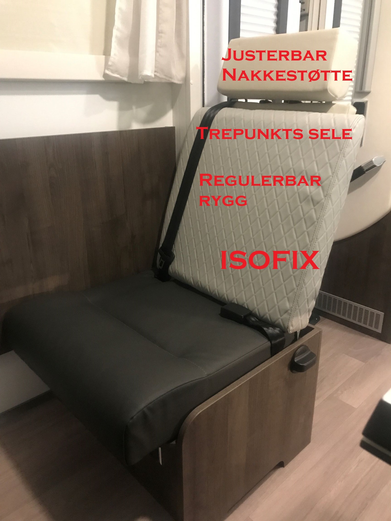 En meget populær planløsning med to enkle senger bak, som enkelt kan gjøres om til stor dobbelseng + elektrisk senkeseng over sittegruppe.