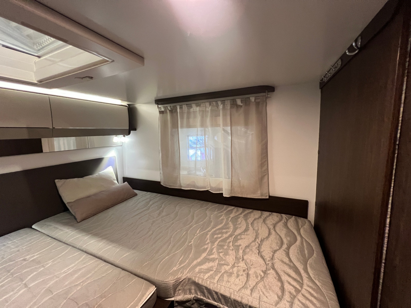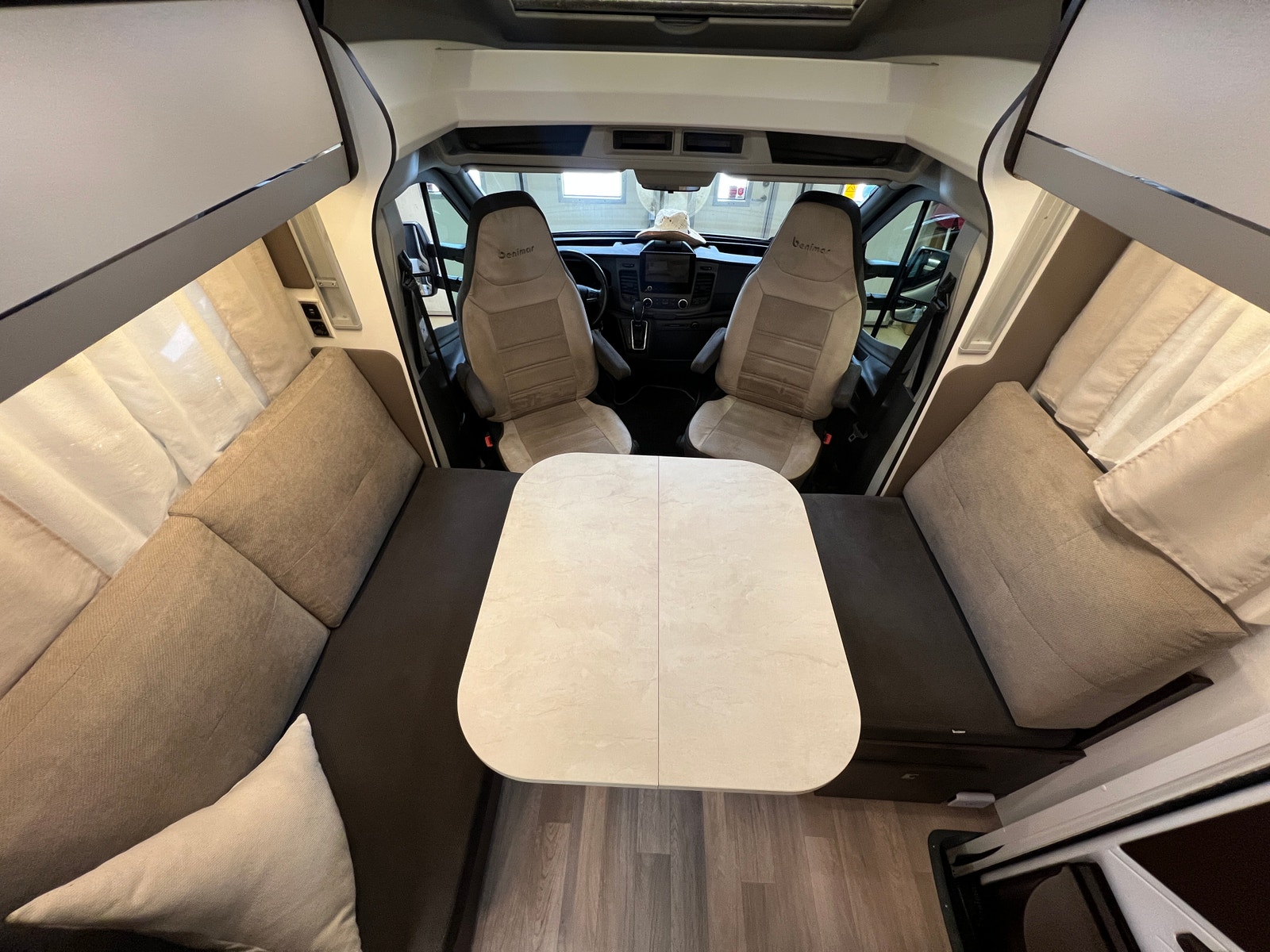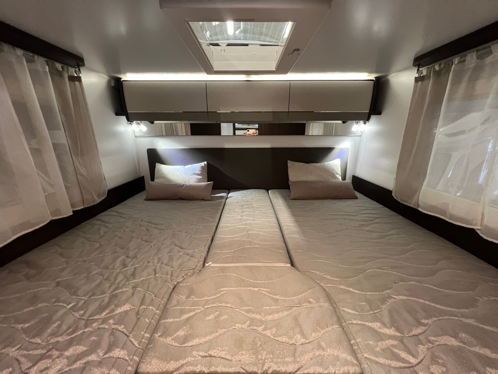 En meget populær planløsning med to enkle senger bak, som enkelt kan gjøres om til stor dobbelseng + elektrisk senkeseng over sittegruppe.
