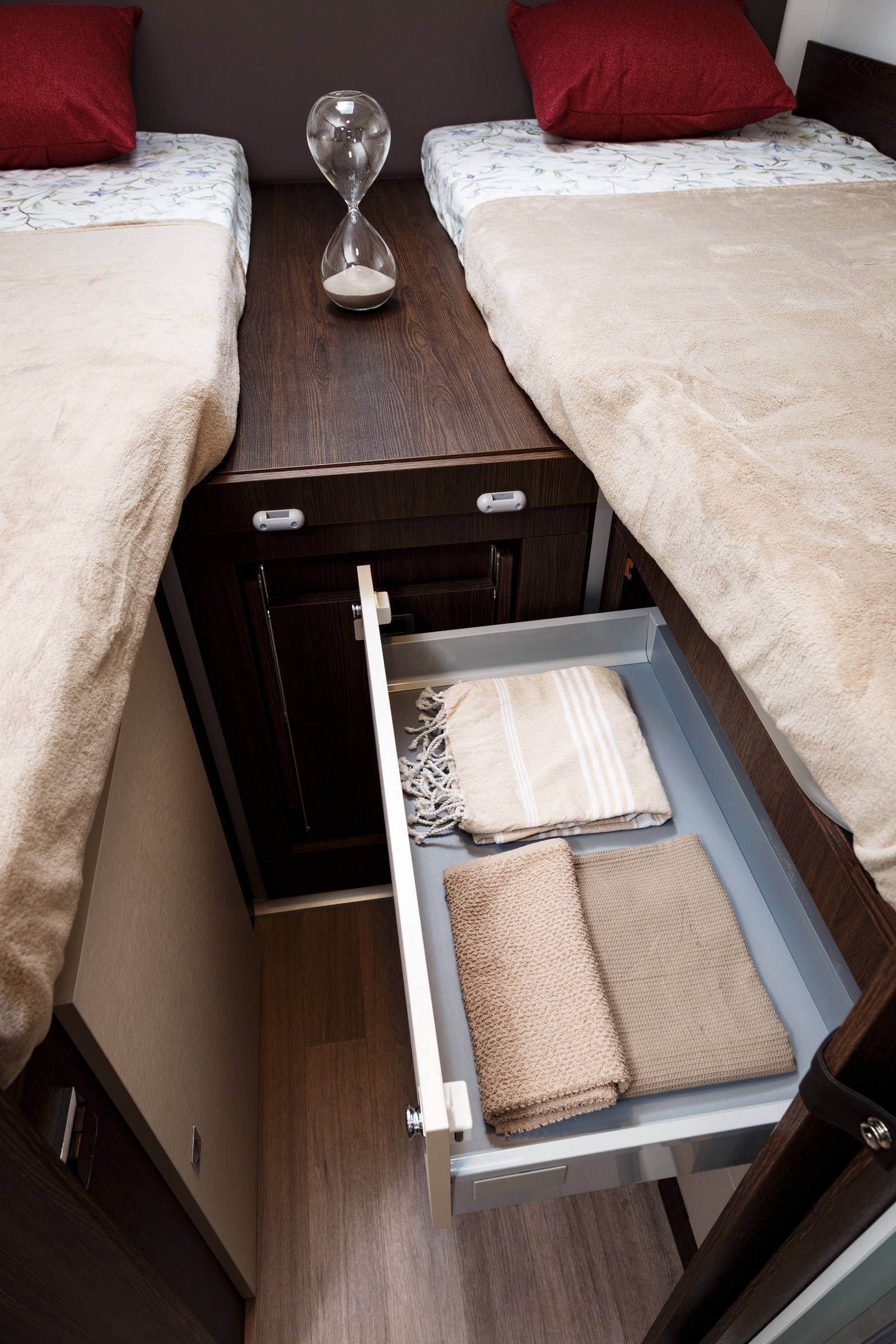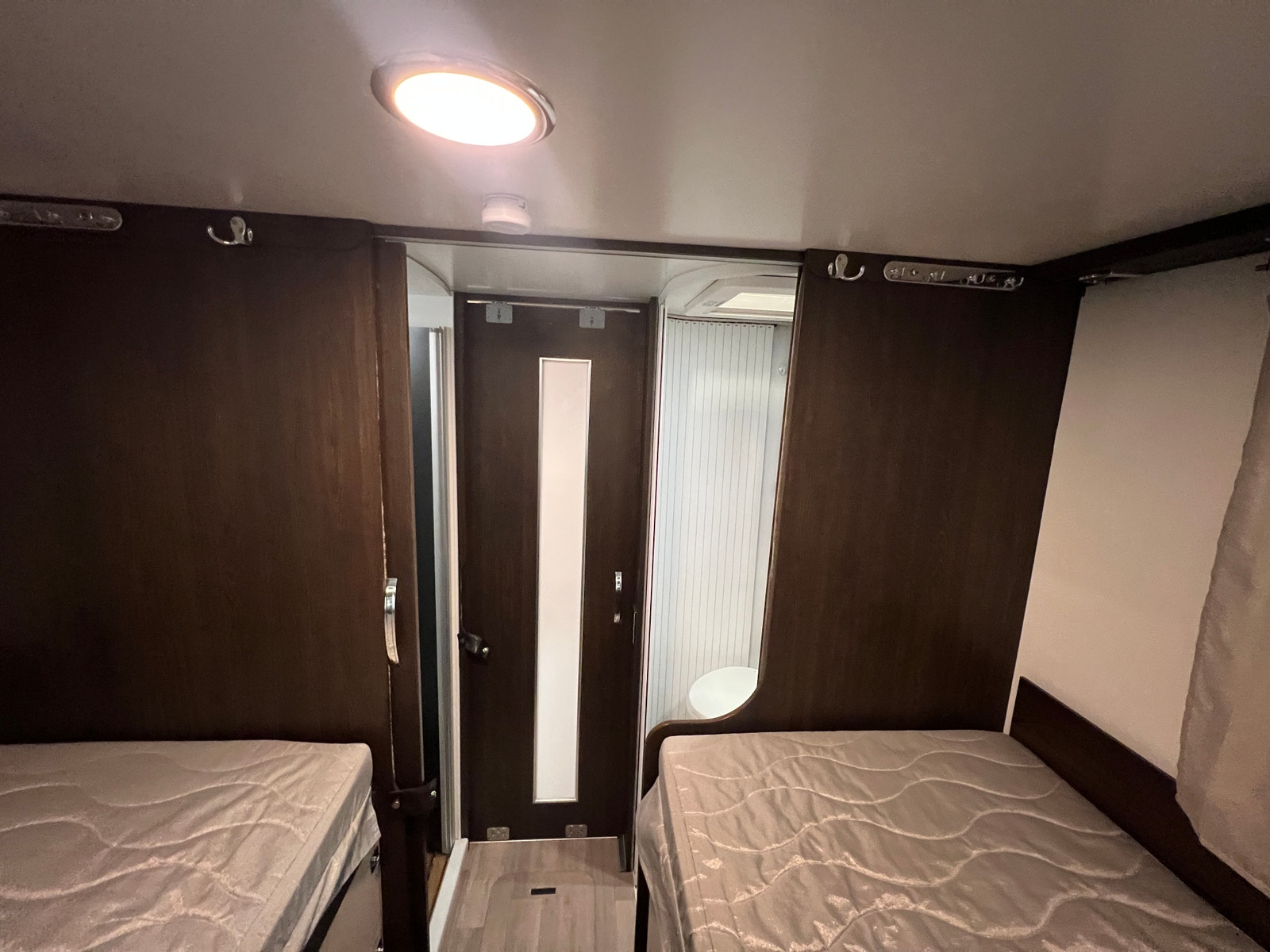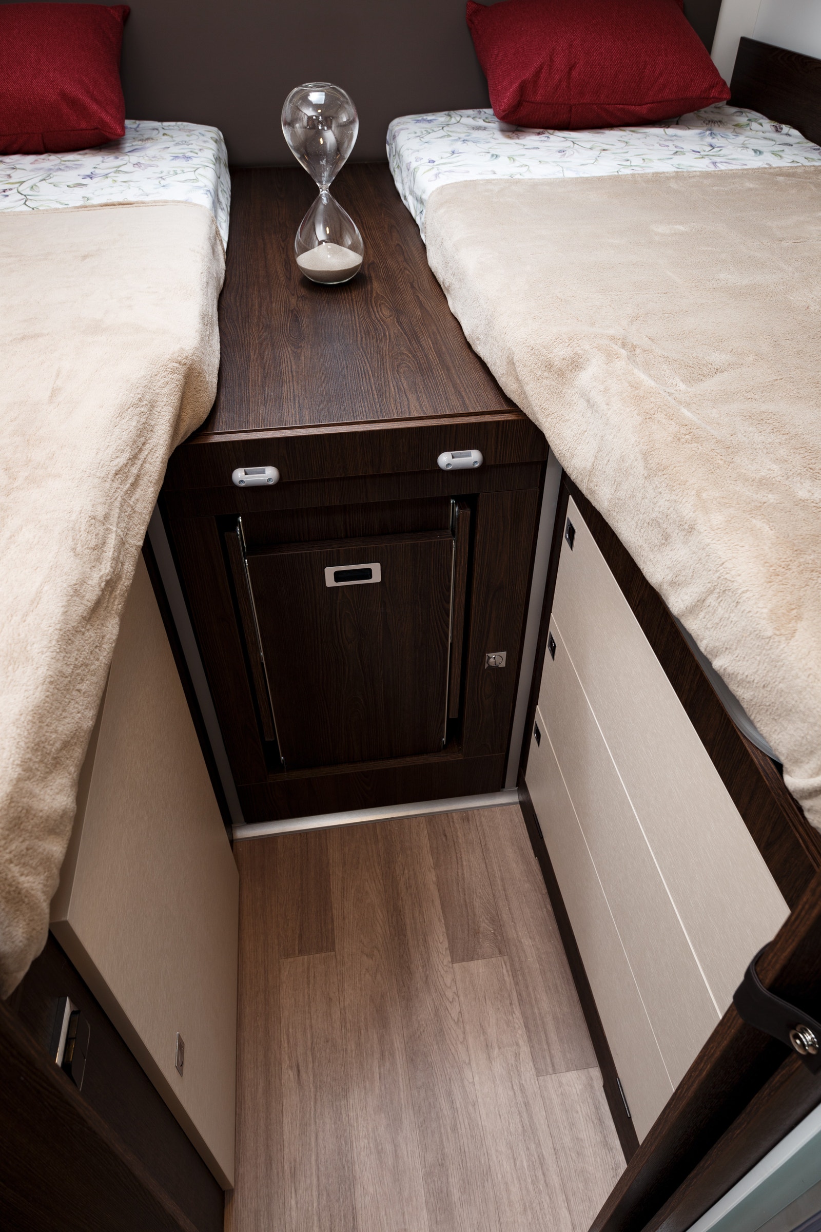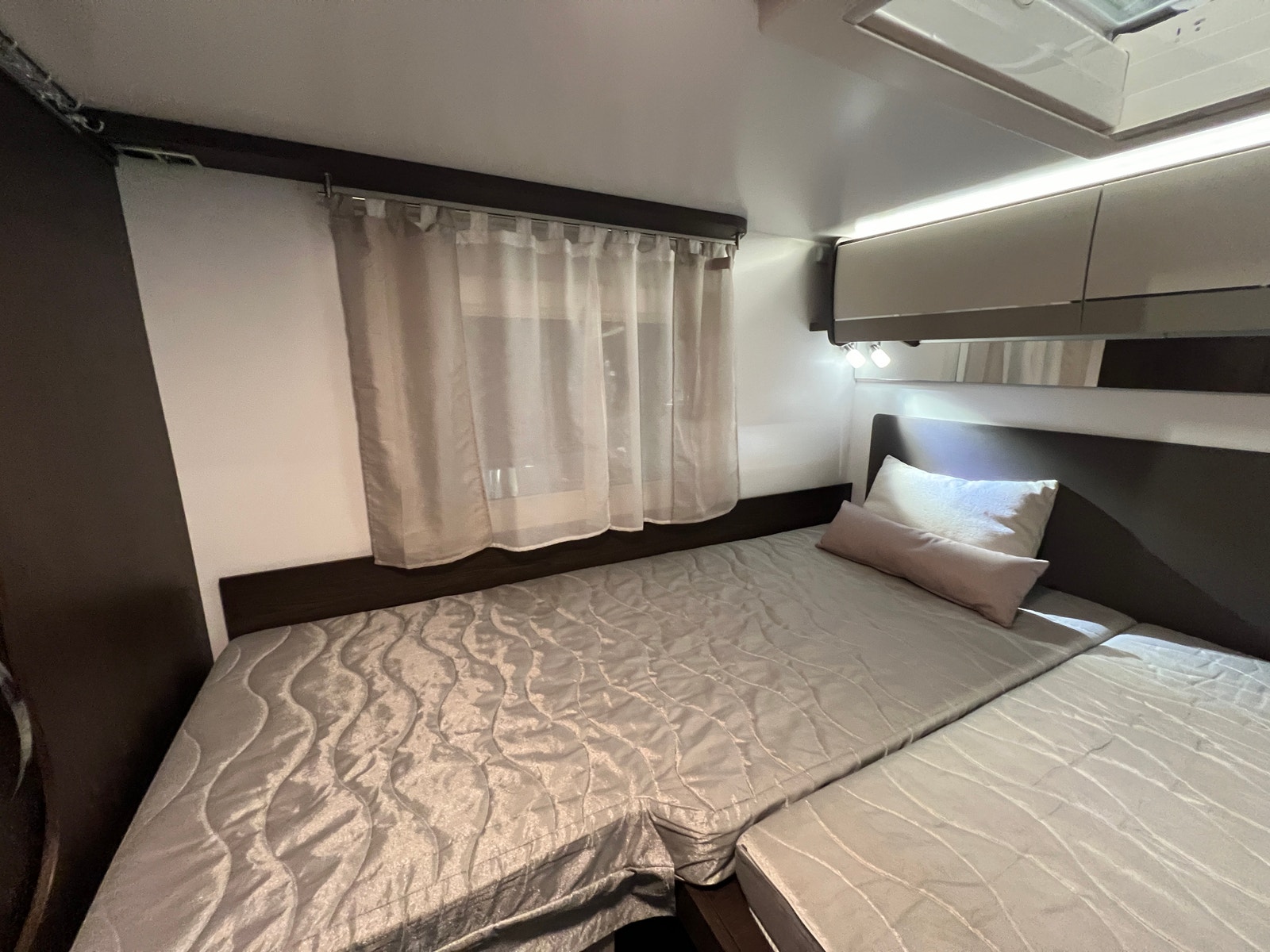 En meget populær planløsning med to enkle senger bak, som enkelt kan gjøres om til stor dobbelseng + elektrisk senkeseng over sittegruppe.
