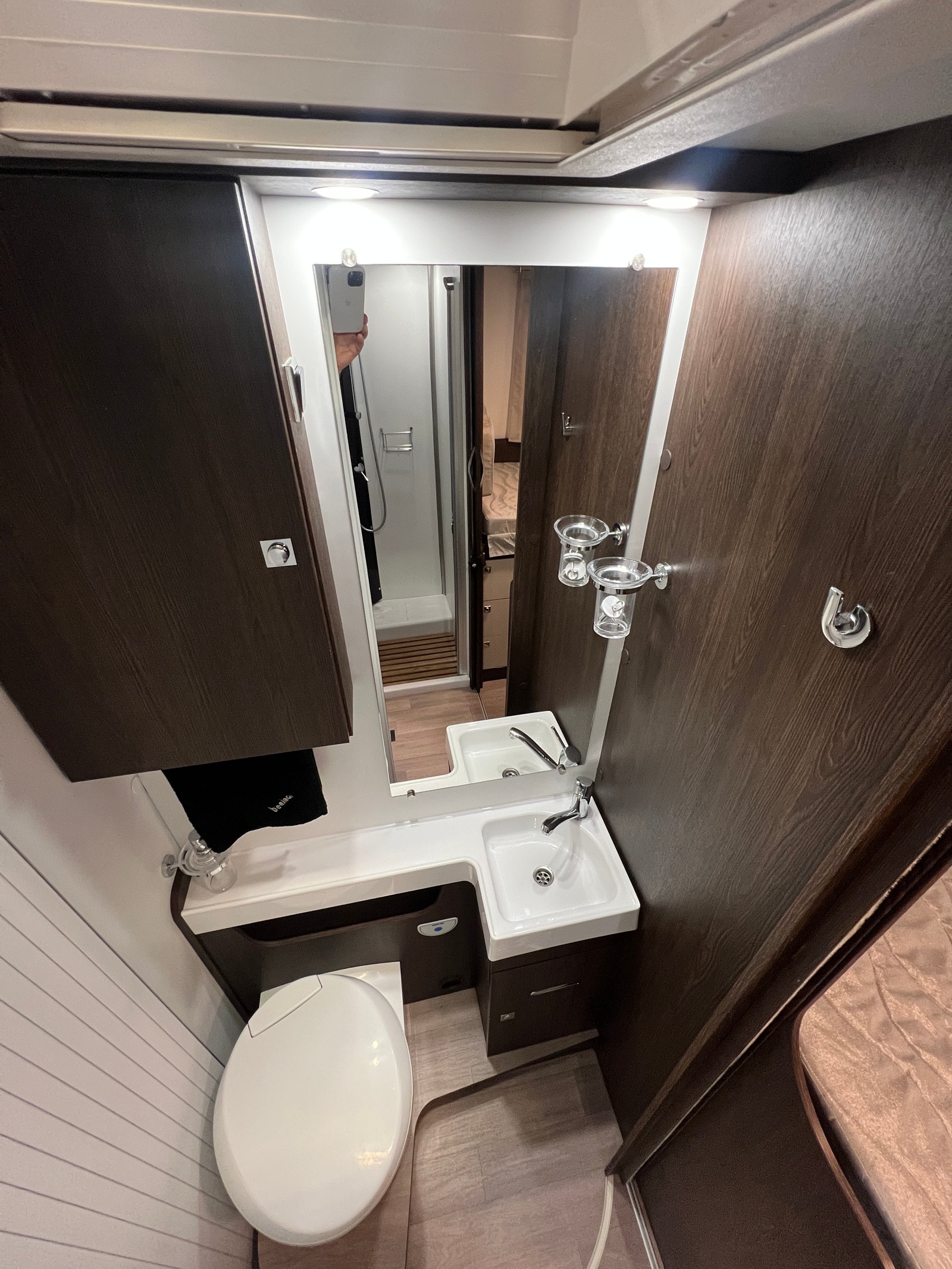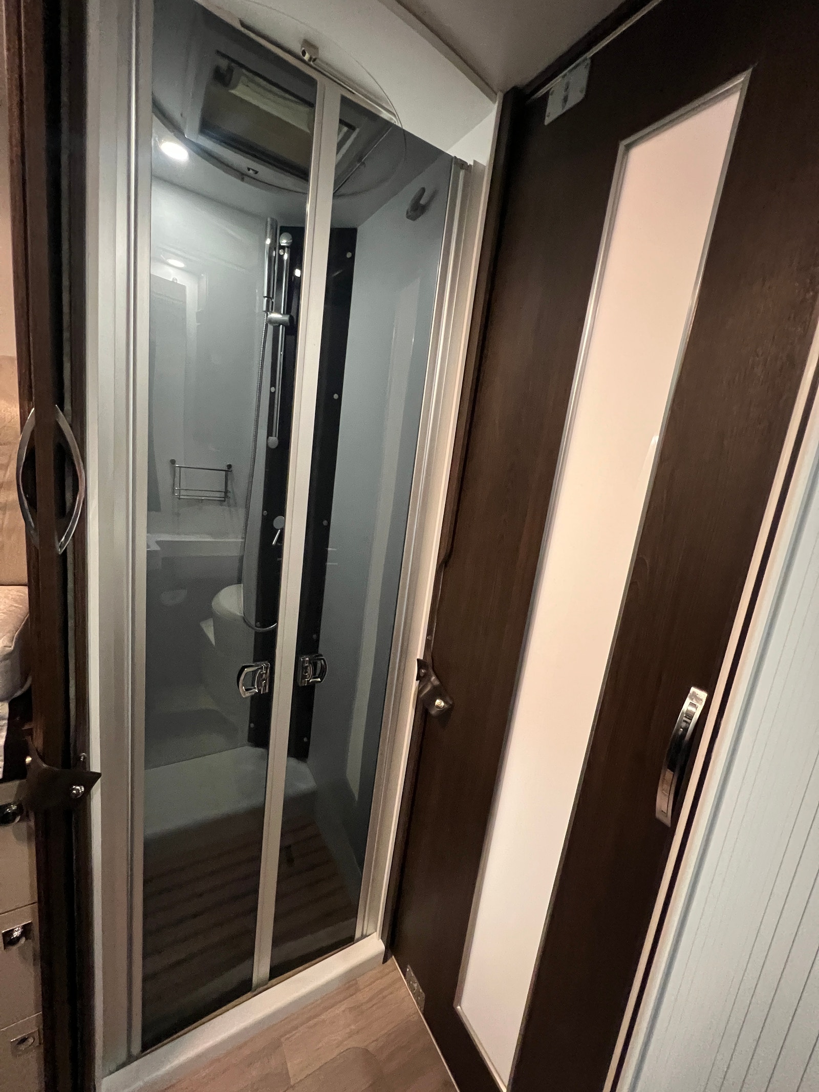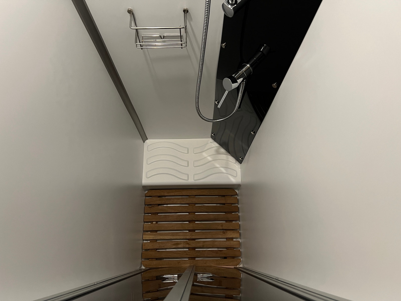 Egen dusj med dører og takluke, Egen WC med vask, takluke og dør.