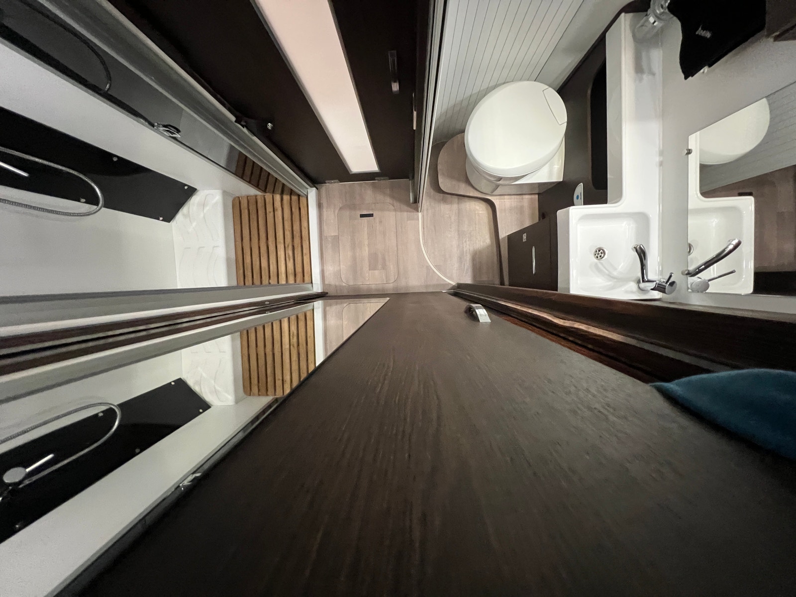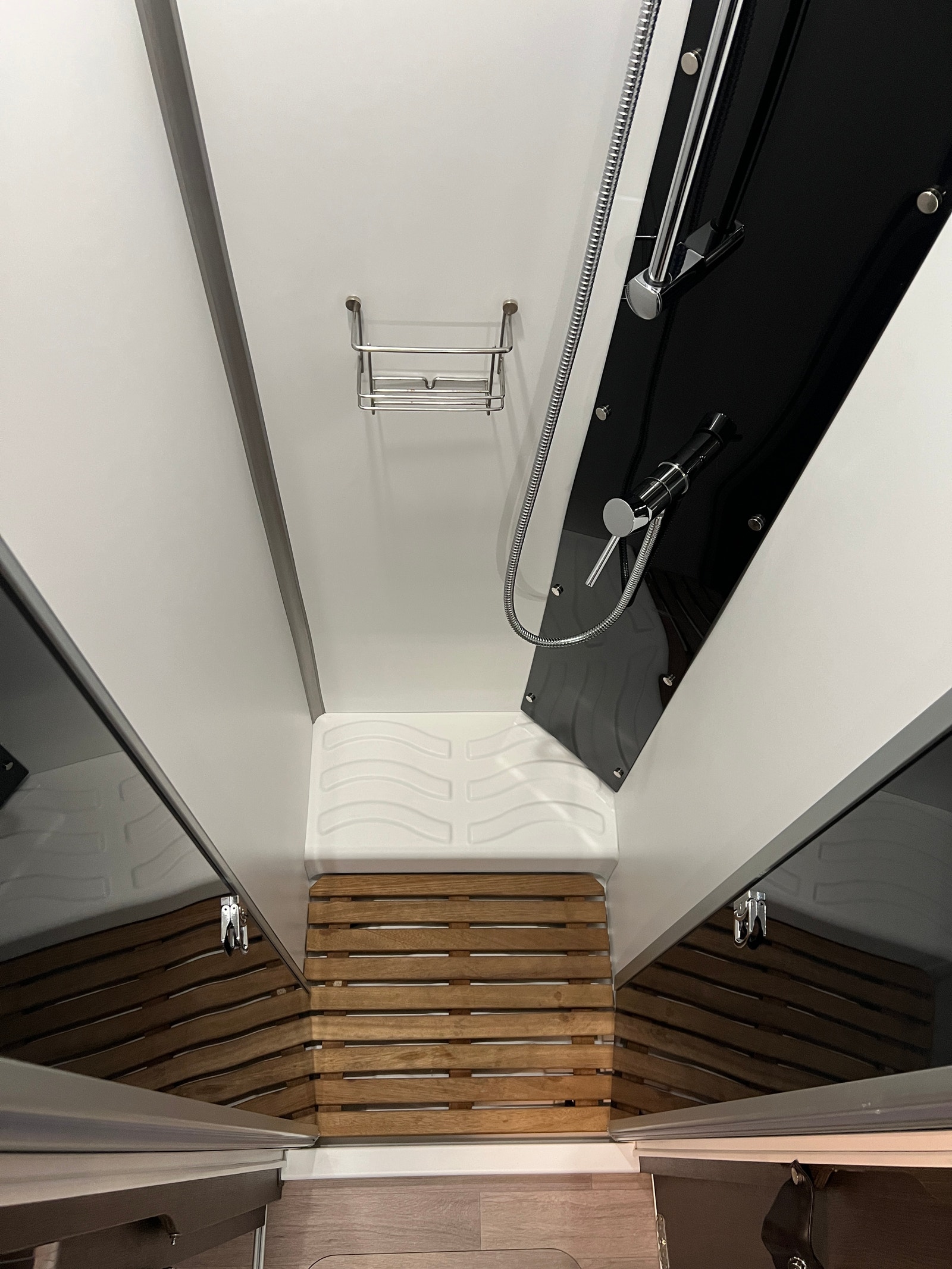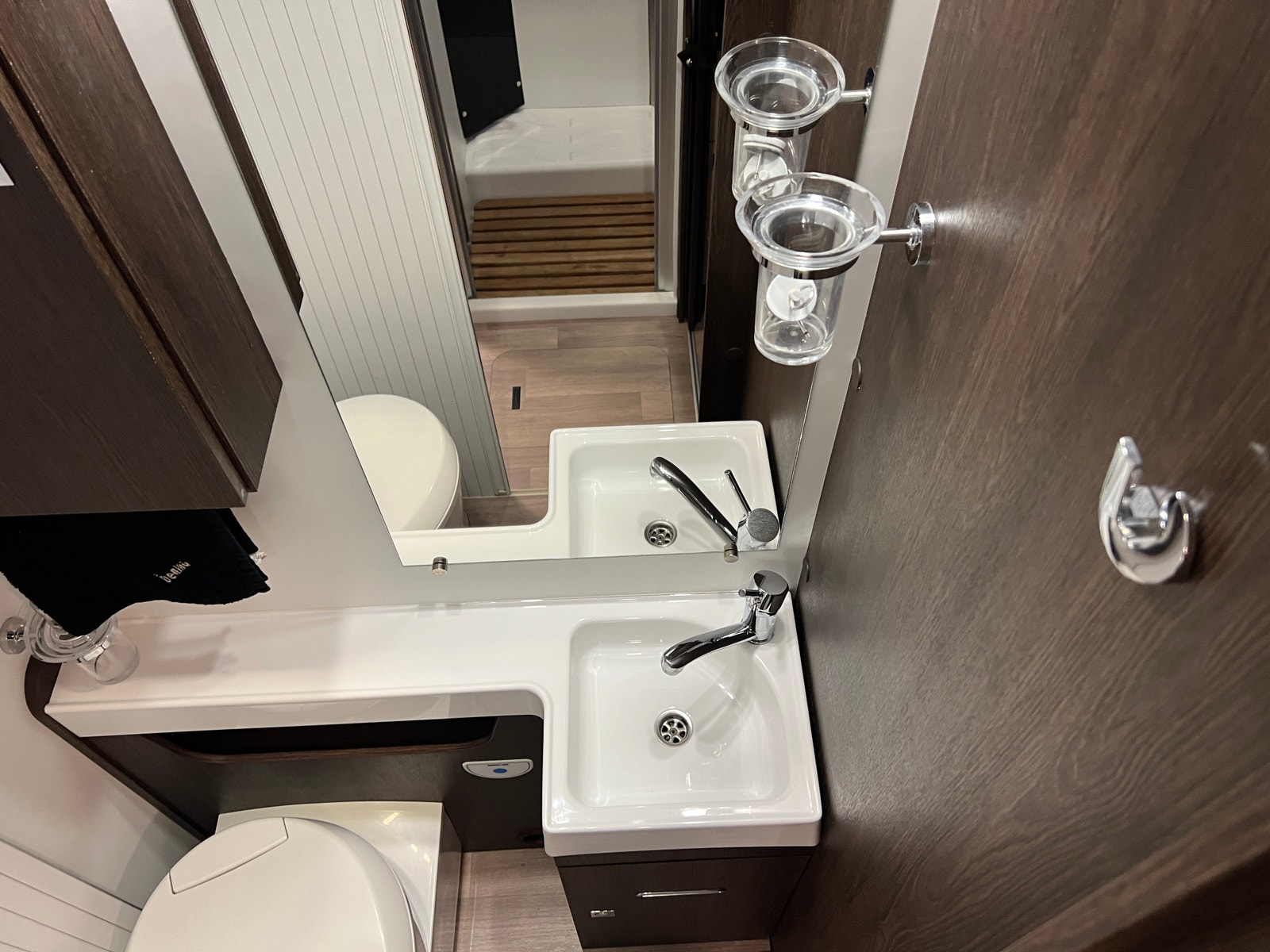 Egen dusj med dører og takluke, Egen WC med vask, takluke og dør.