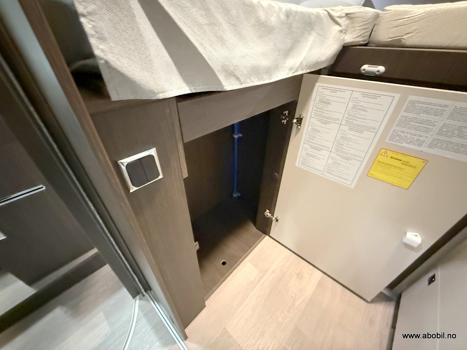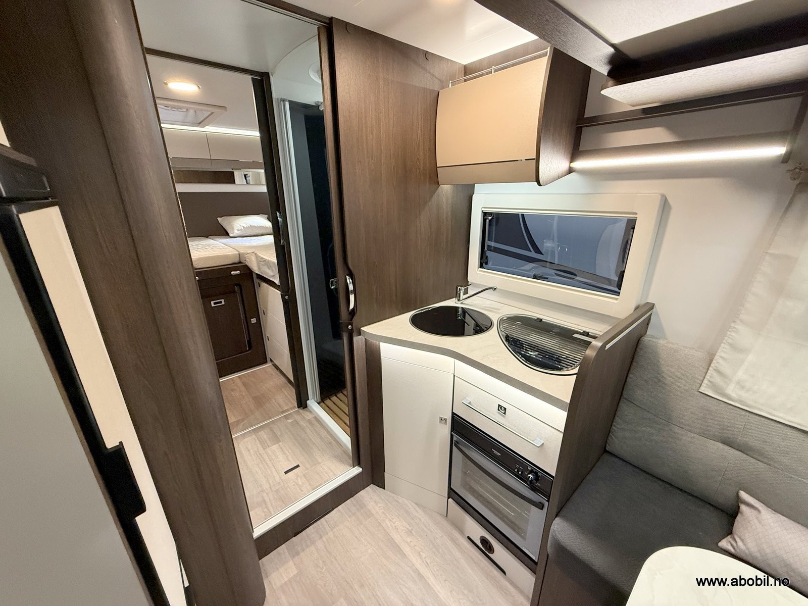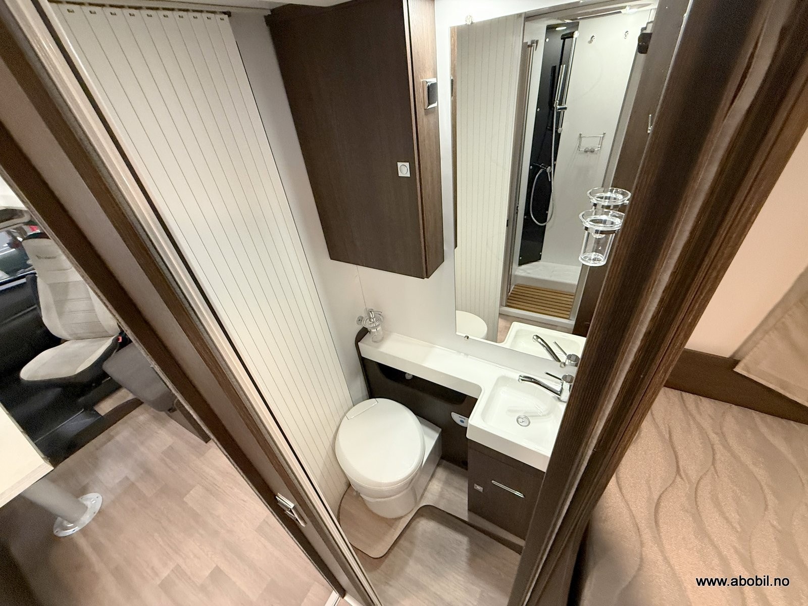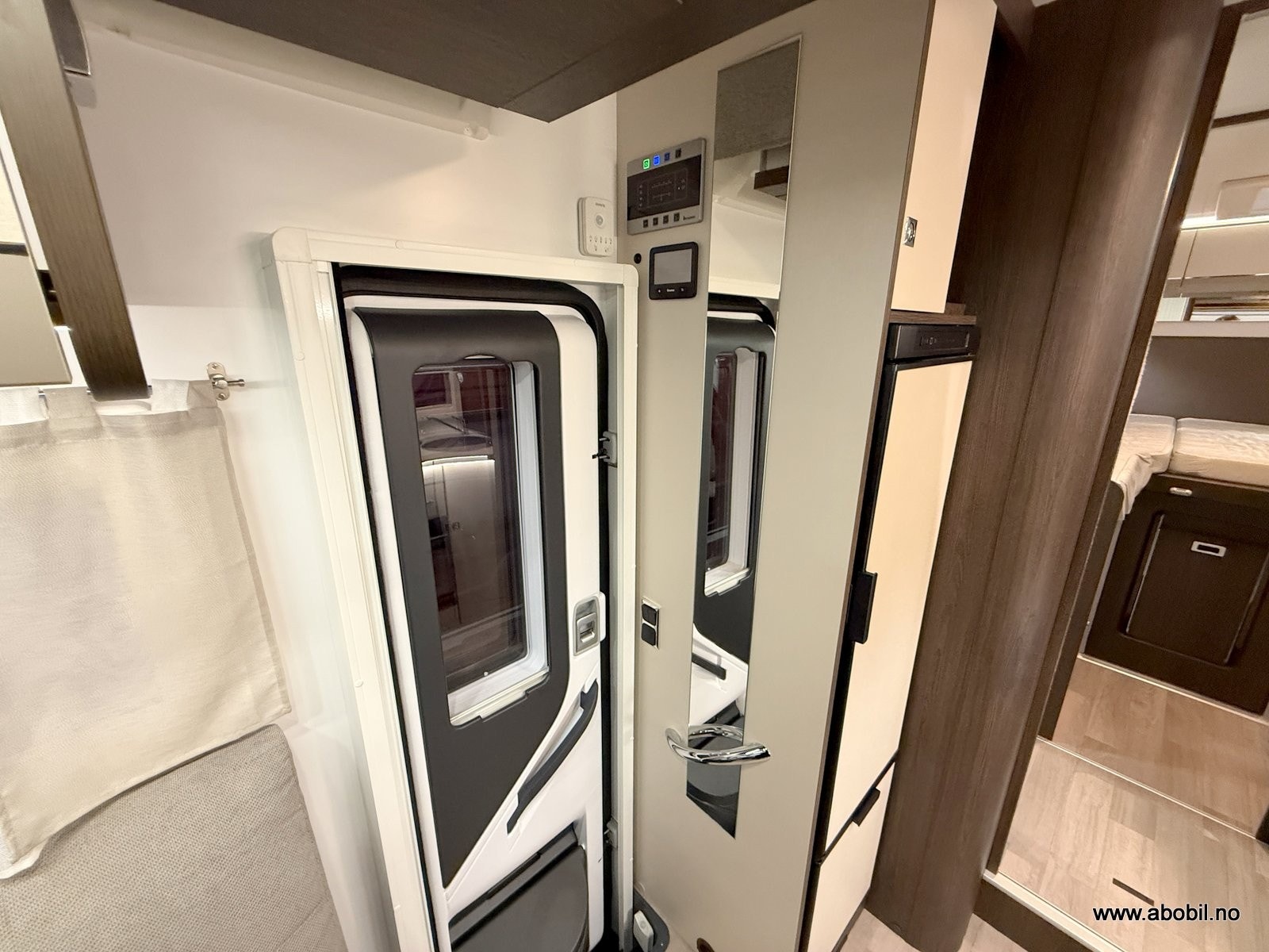 Her får du separat dusjkabinett med dør, eget toalettrom med Thetford svingbart WC, speil, skapplass og god belysning.