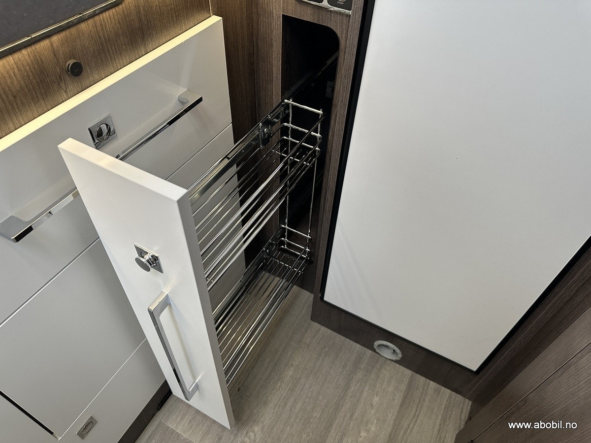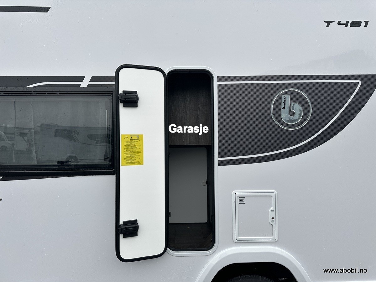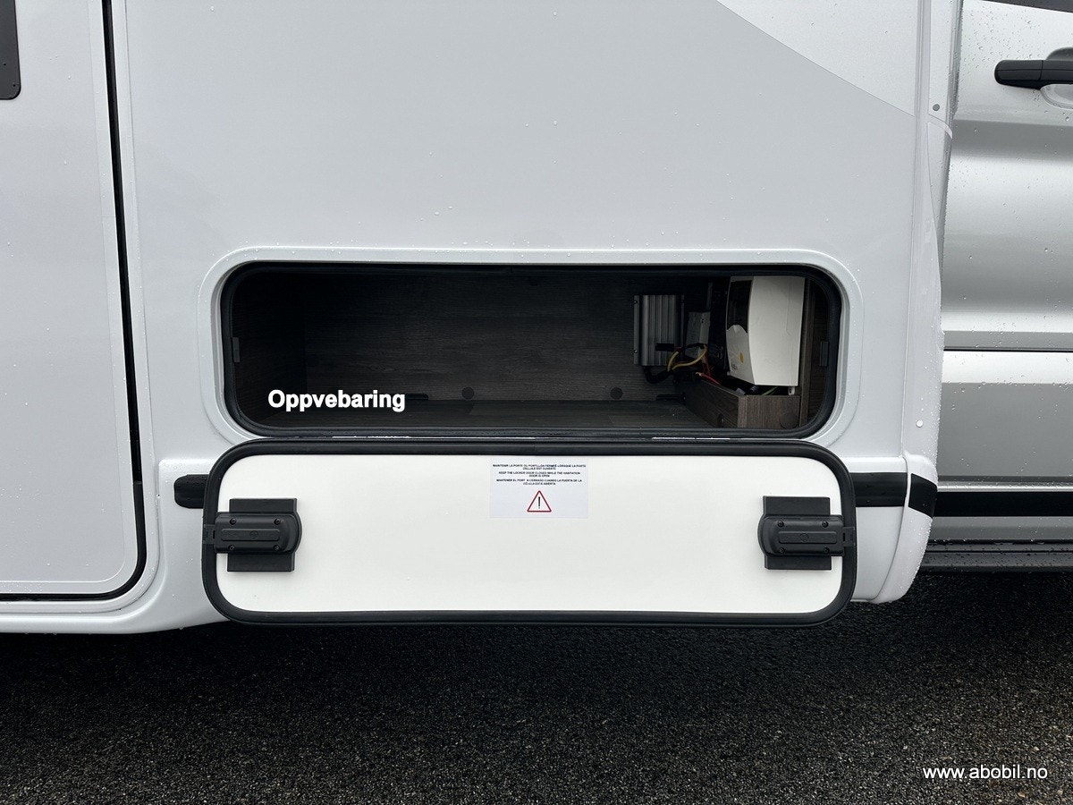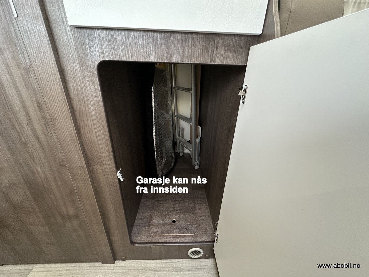 Oppbevaring: Garasjen er tilgjengelig fra begge sider og fra bodelen, med lys og varme. Perfekt for oppbevaring av sykler, campingutstyr og andre nødvendigheter. Ekstra oppbevaringsrom på passasjersiden gir enda mer fleksibilitet.