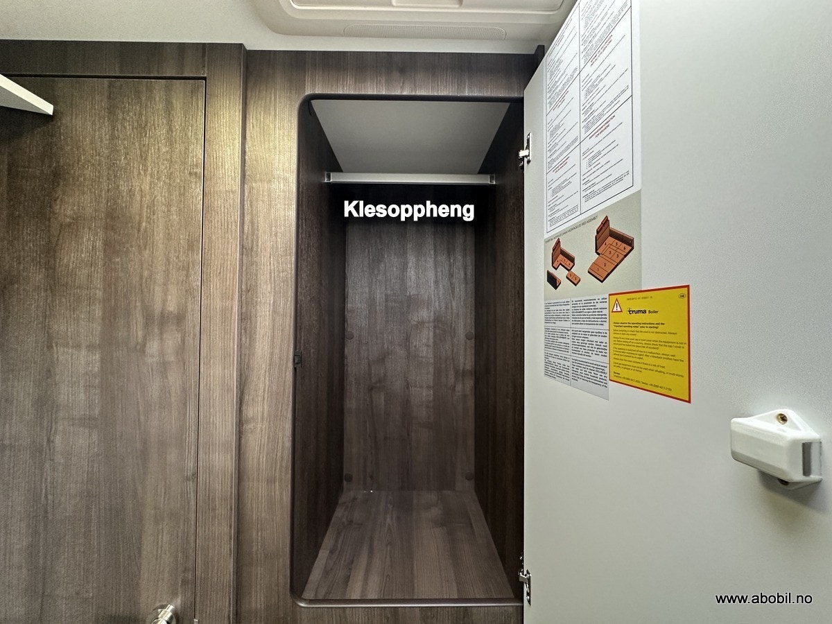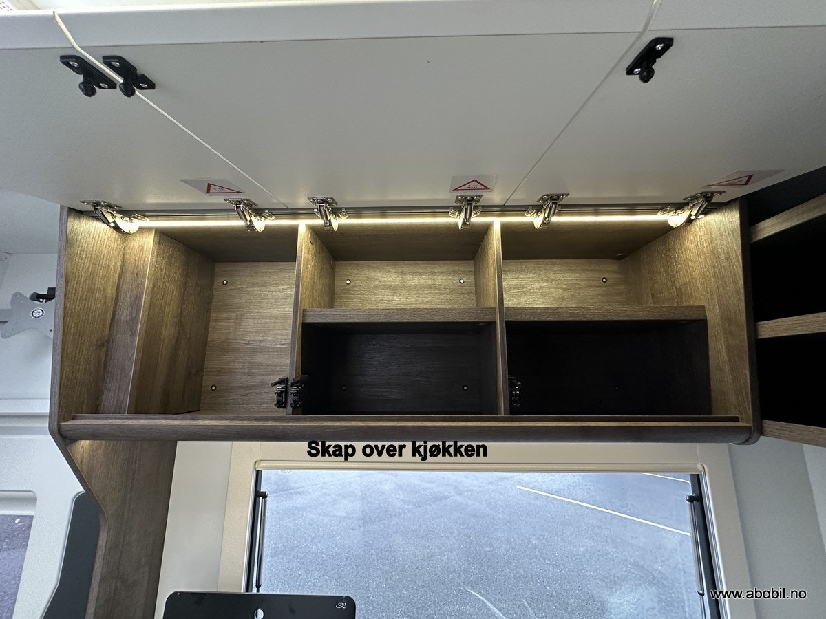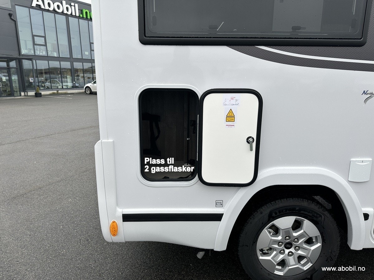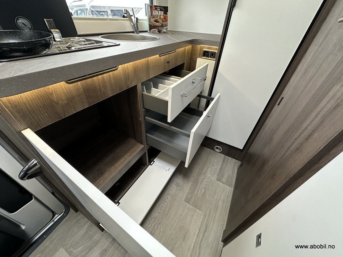Oppbevaring: Garasjen er tilgjengelig fra begge sider og fra bodelen, med lys og varme. Perfekt for oppbevaring av sykler, campingutstyr og andre nødvendigheter. Ekstra oppbevaringsrom på passasjersiden gir enda mer fleksibilitet.
