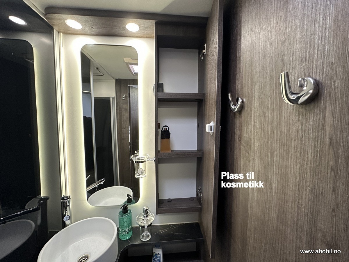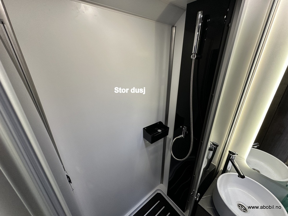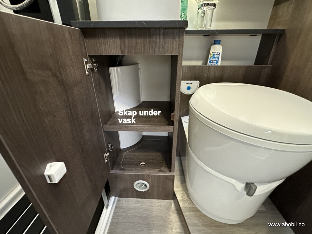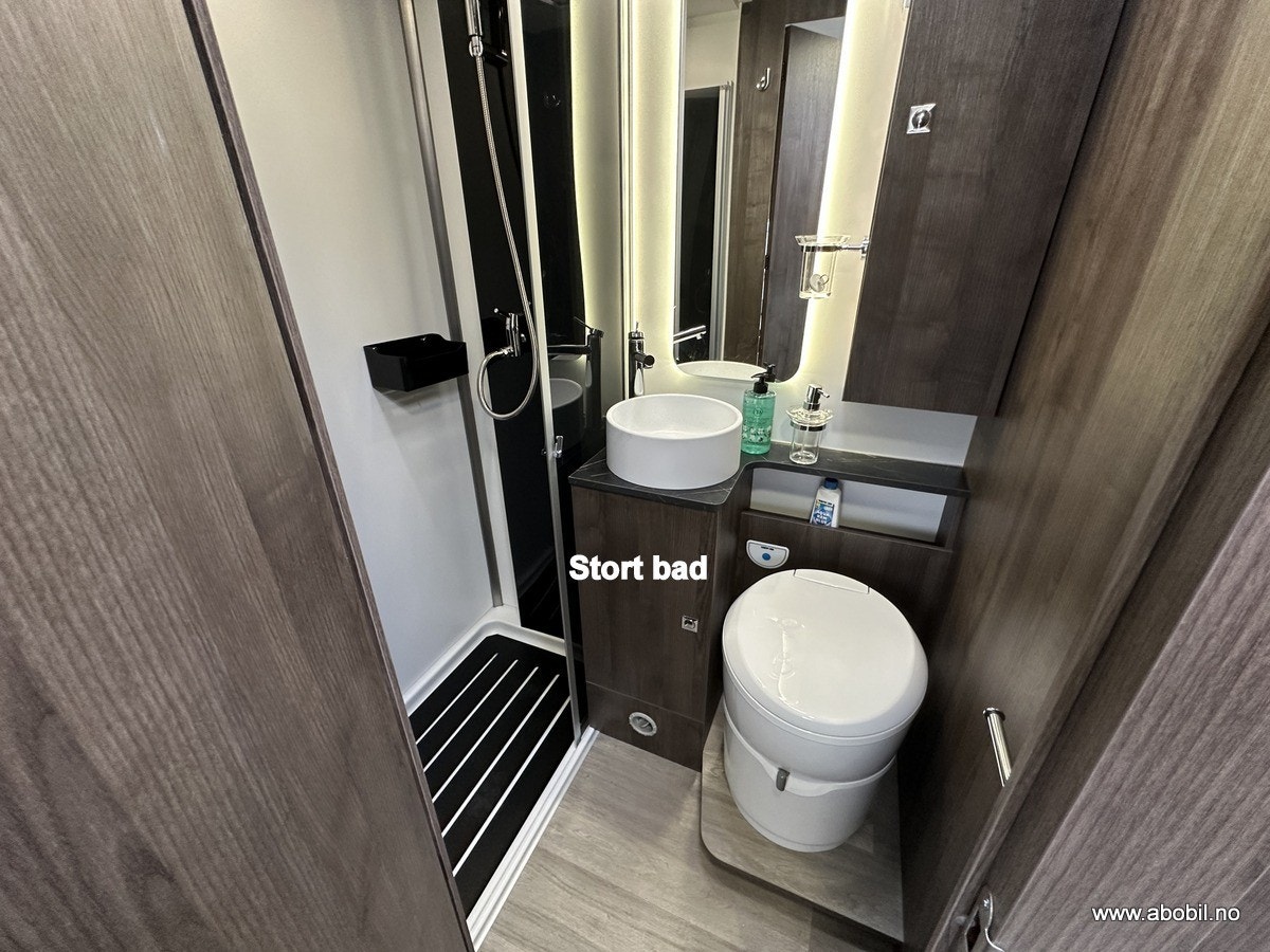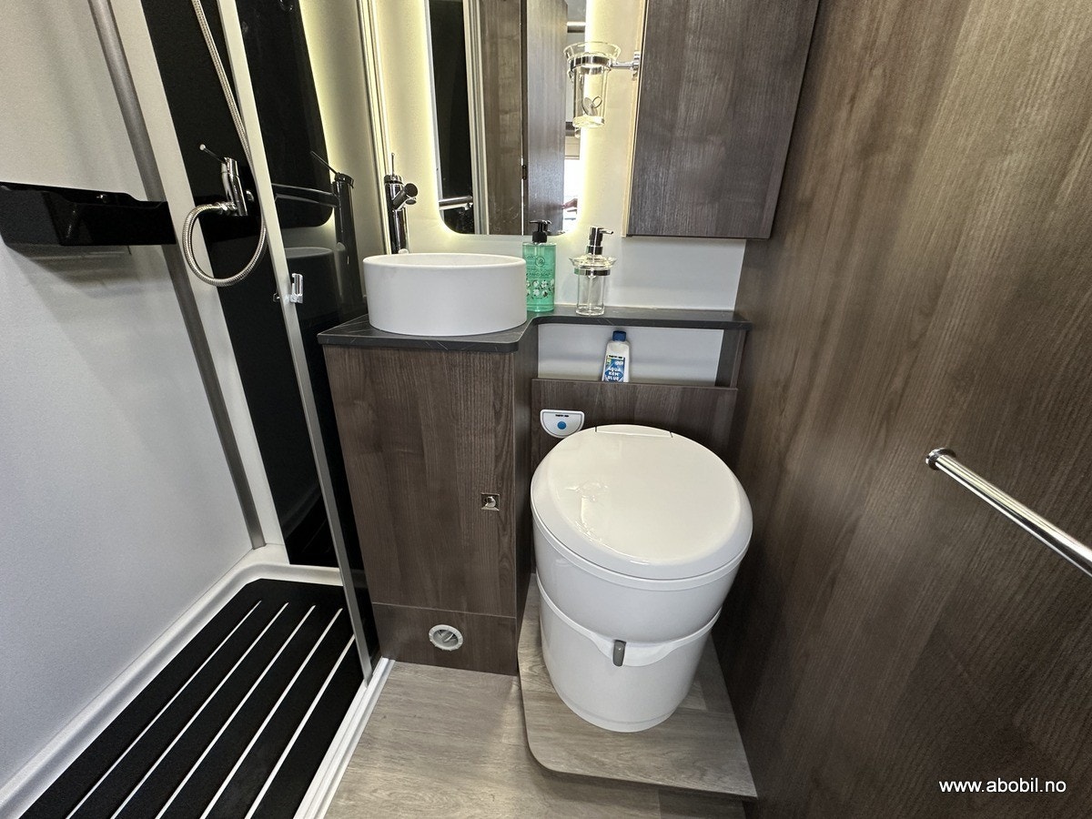 Separat dusj med nedtrekkbar stang for tørking av håndklær og vått tøy. Bobilens trykkpumpe-system gir godt vanntrykk, og badet er utstyrt med svingbart toalett, stort speil, såpeholdere og god skapplass. Takluke med myggnetting og formørkningsgardiner sikrer god ventilasjon og privatliv.