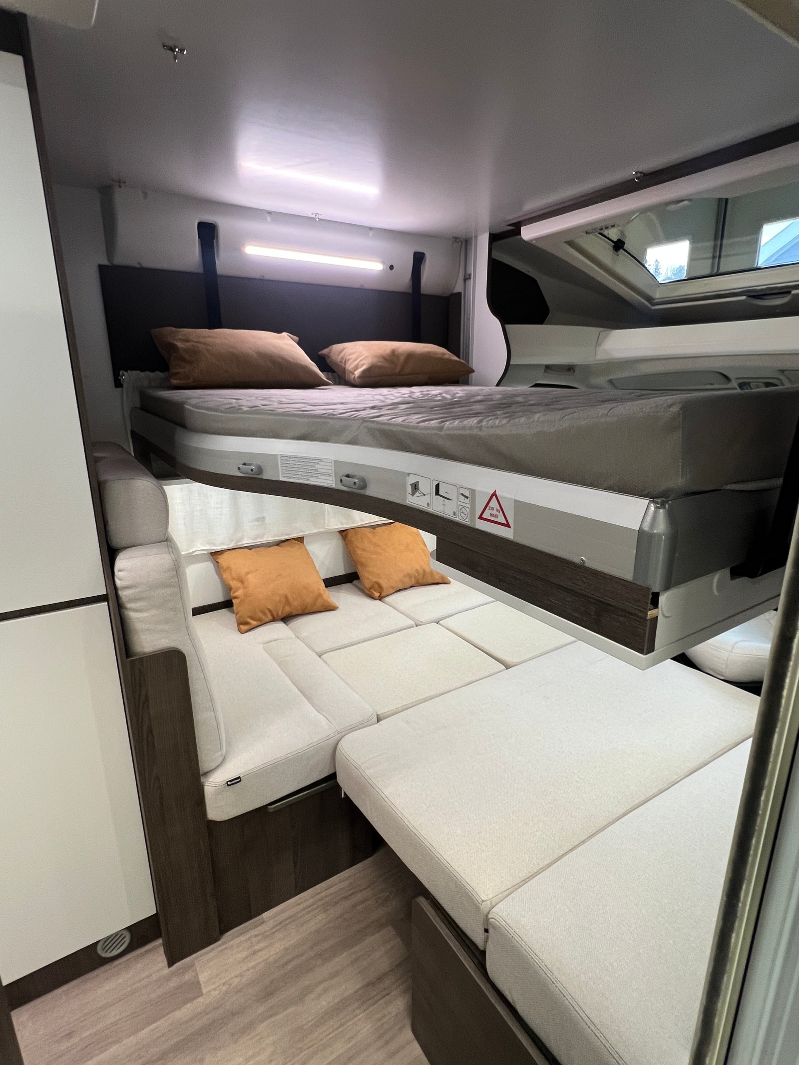 Man kan velge å kjøre senkesengen halvveis ned slik at man kan re opp for to ekstra liggeplasser i sittegruppen, eller man senker den helt ned for bruk uten stige.