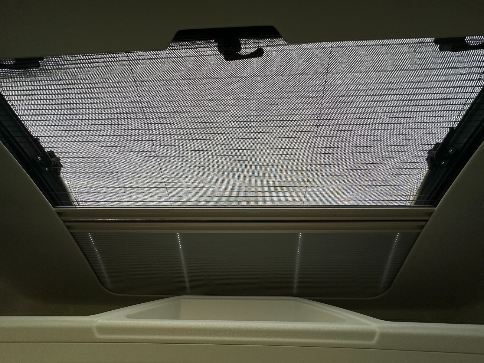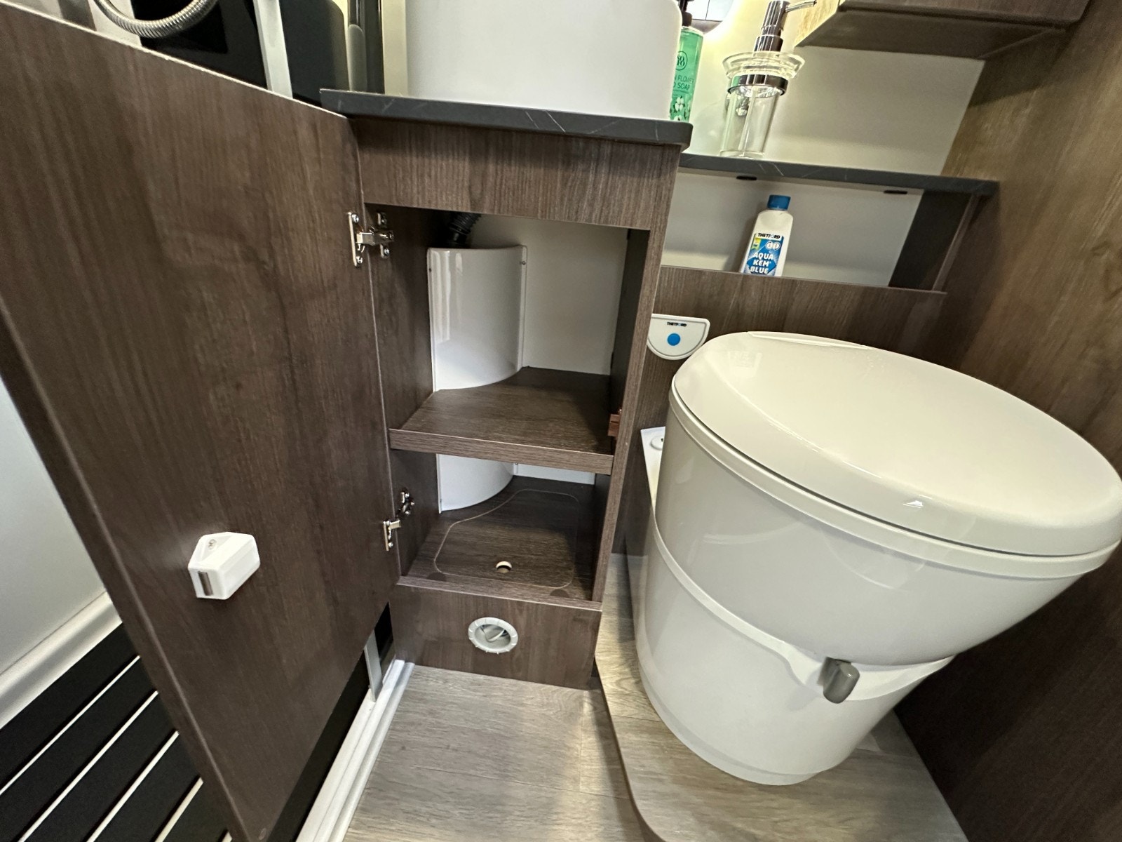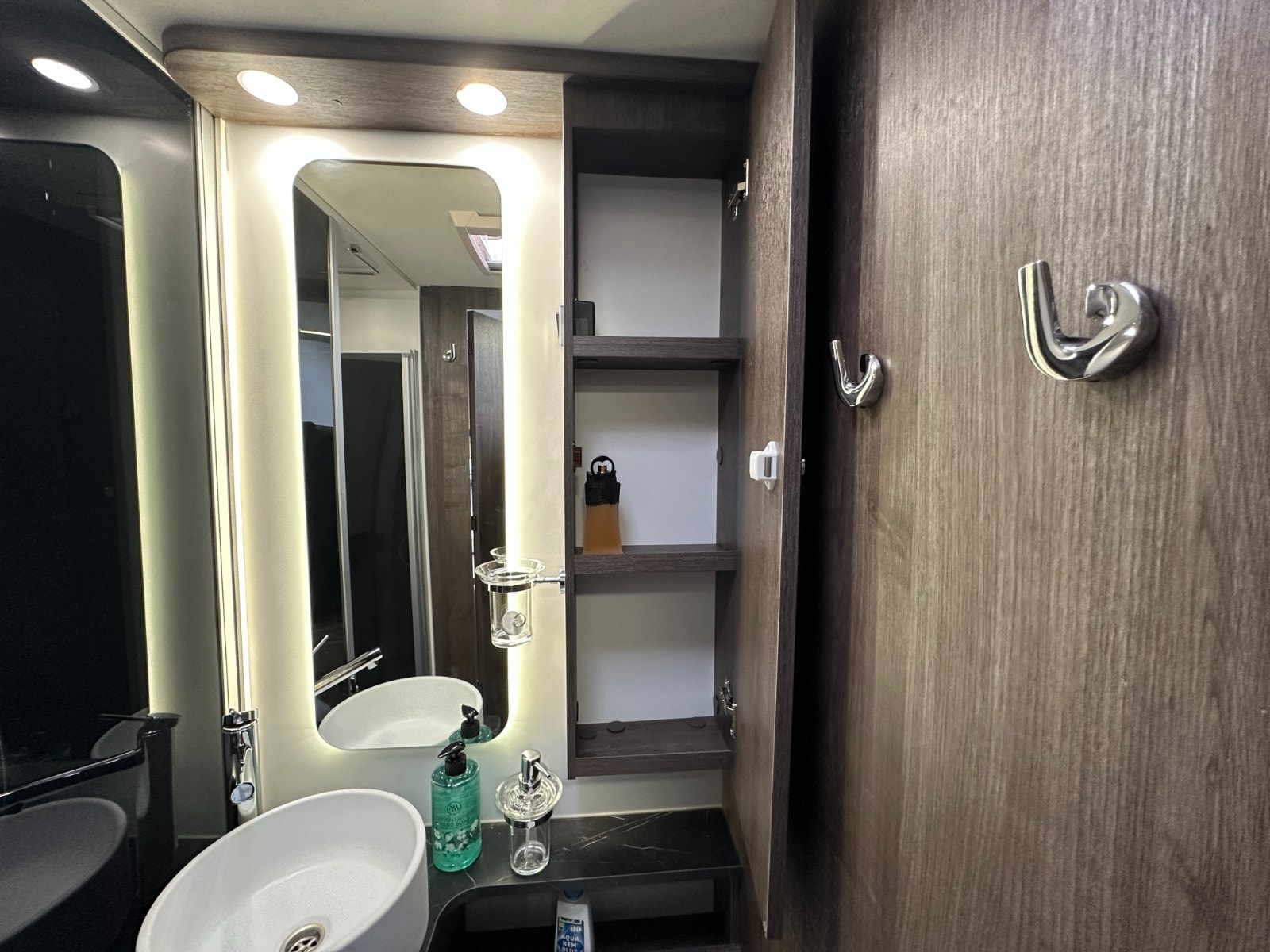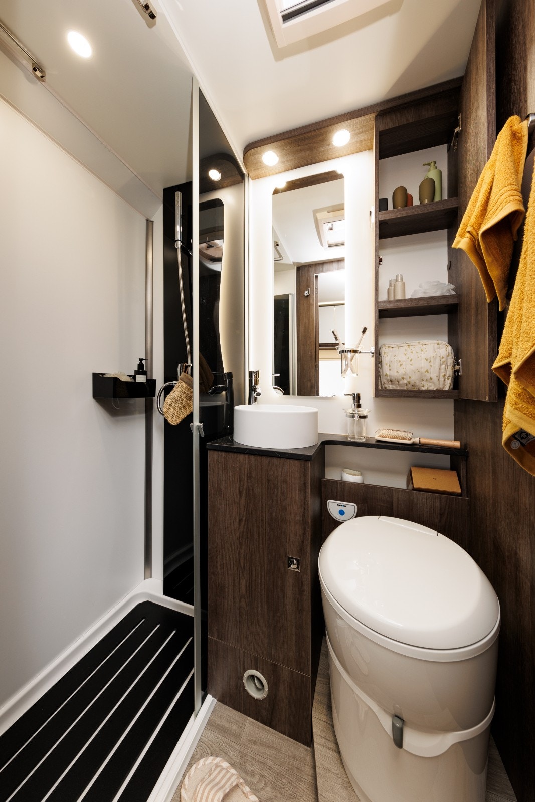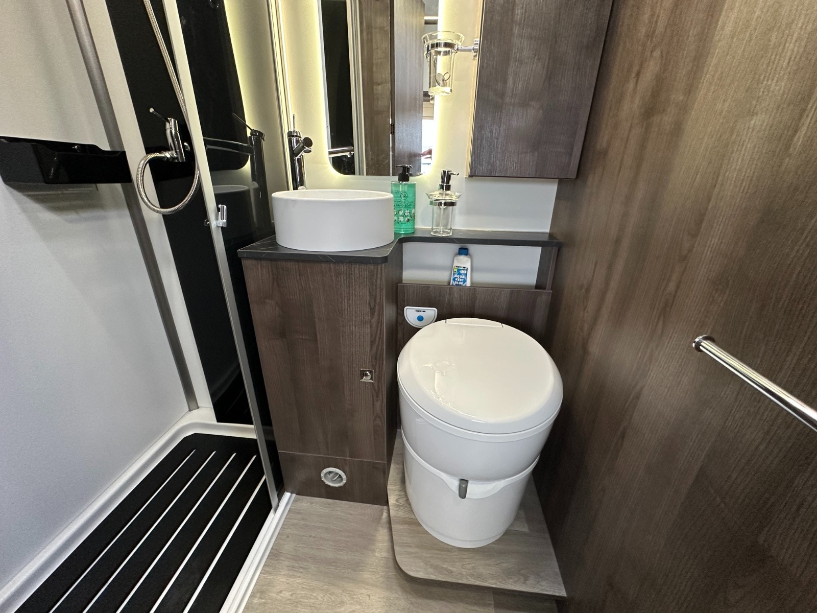 Separat dusj med nedtrekkbar stang for tørking av håndklær og vått tøy. Bobilens trykkpumpe-system gir godt vanntrykk, og badet er utstyrt med svingbart toalett, stort speil, såpeholdere og god skapplass. Takluke med myggnetting og formørkningsgardiner sikrer god ventilasjon og privatliv.