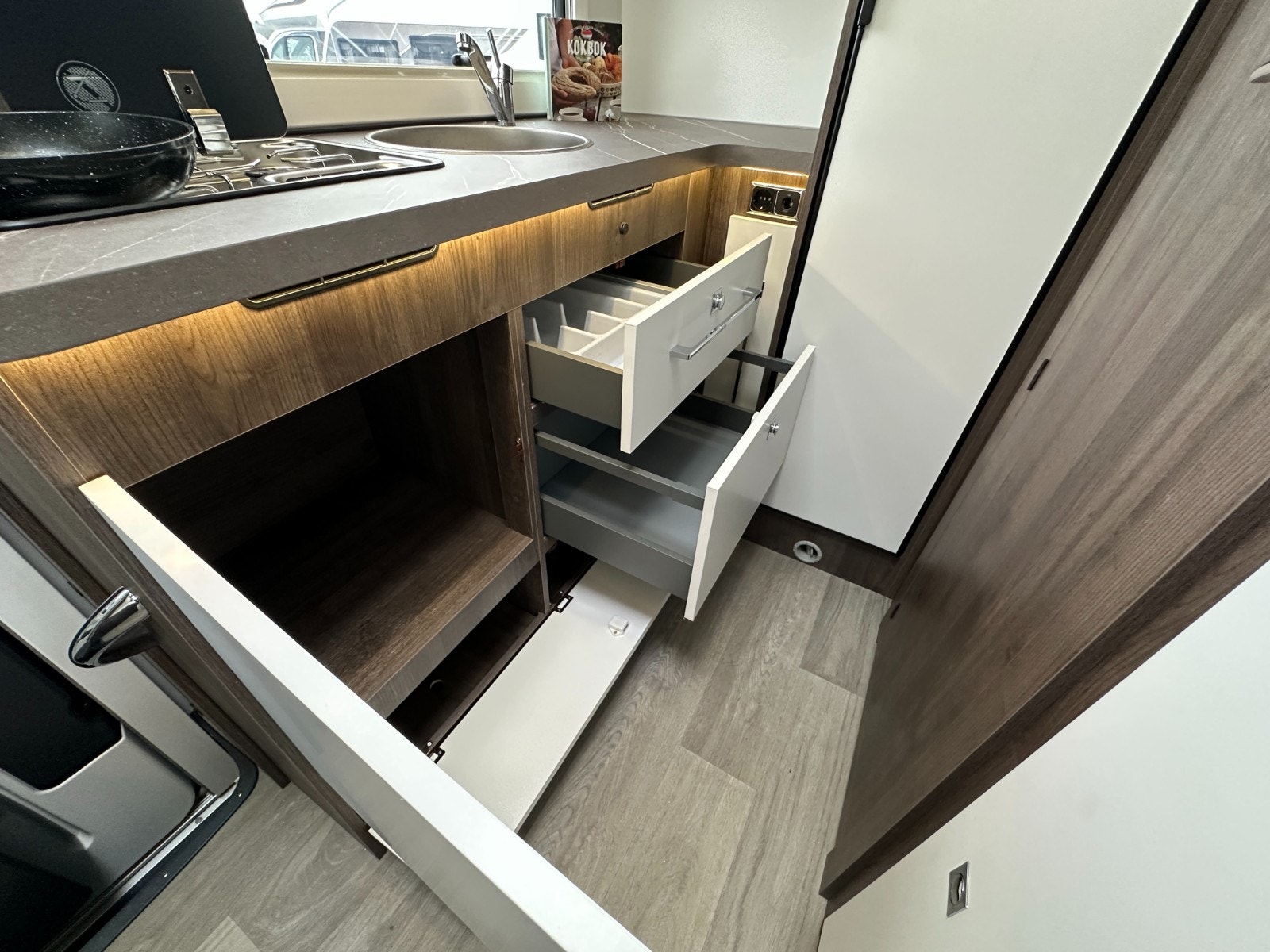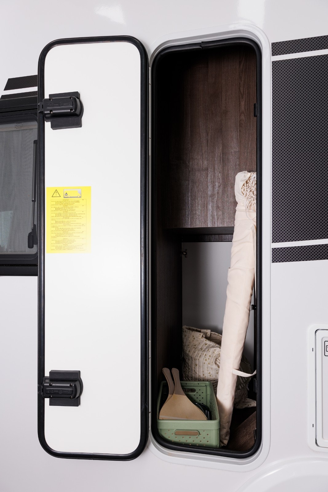 Oppbevaring: Garasjen er tilgjengelig fra begge sider og fra bodelen, med lys og varme. Perfekt for oppbevaring av sykler, campingutstyr og andre nødvendigheter. Ekstra oppbevaringsrom på passasjersiden gir enda mer fleksibilitet.