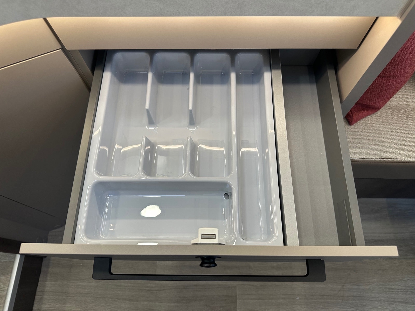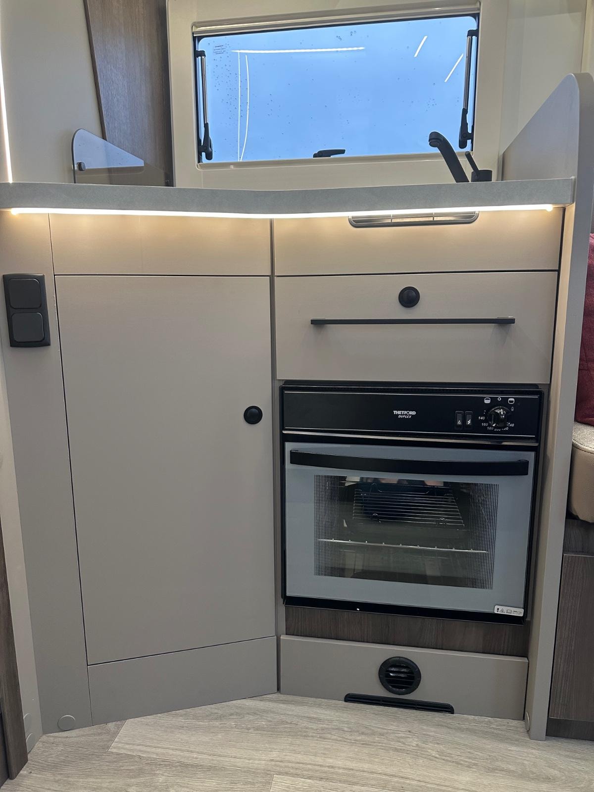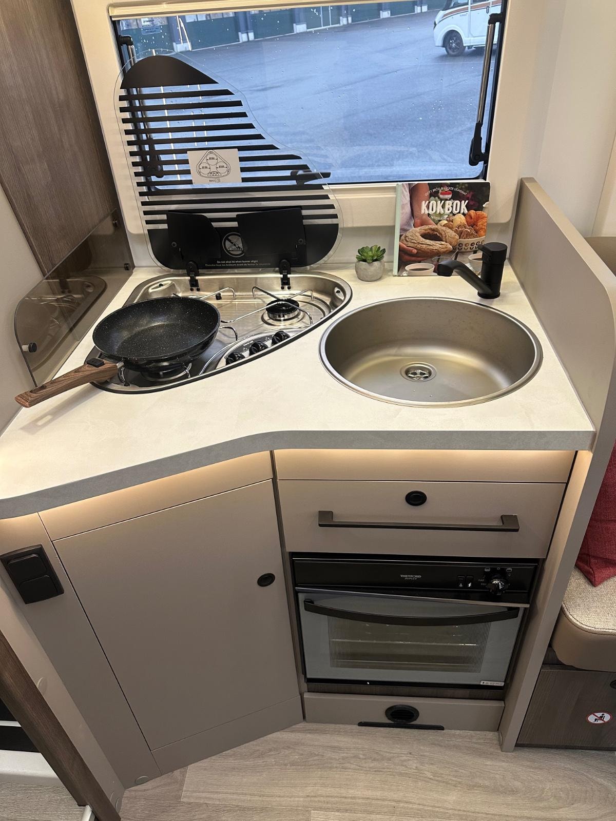 Romslig kjøkken med gode skuffer og et praktisk avlastningsbord som gir mer benkeplass. Tre gassbluss med elektrisk tenning og en to-delt glassplate som beskytter kokebluss og gir ekstra benkeplass. Rikelig med skapplass for kasseroller, kjøkkenredskaper, kopper og kar. Takluke med myggnetting og formørknings plissé/rollo-gardiner. Kjøkkenet er også utstyrt med stekeovn.