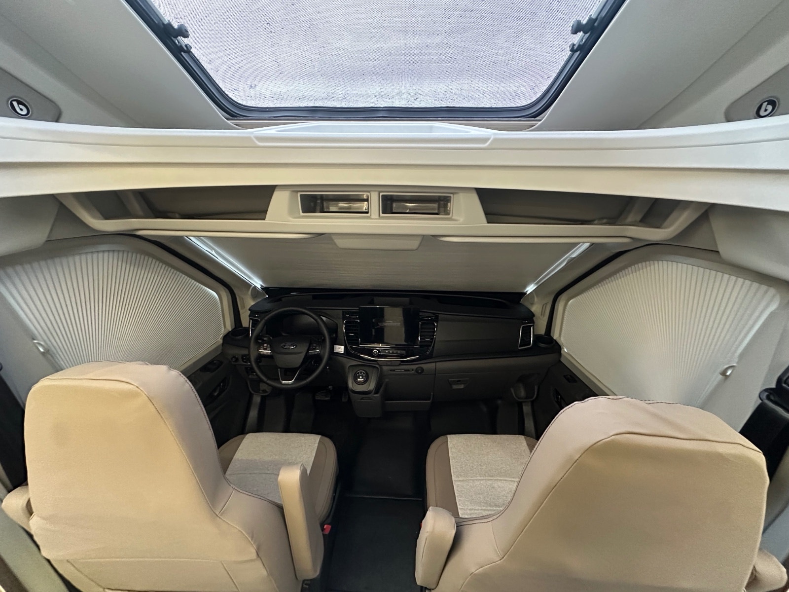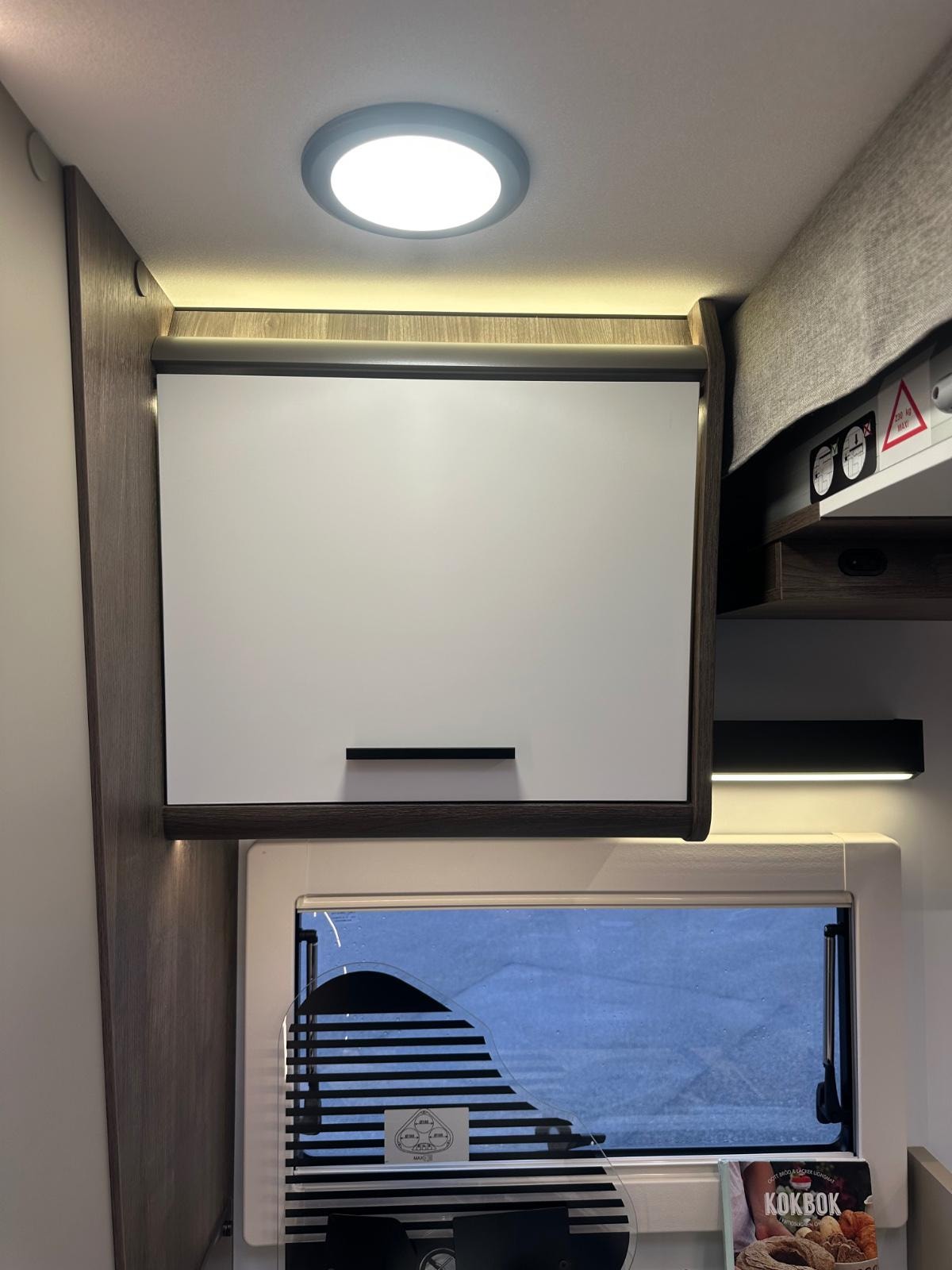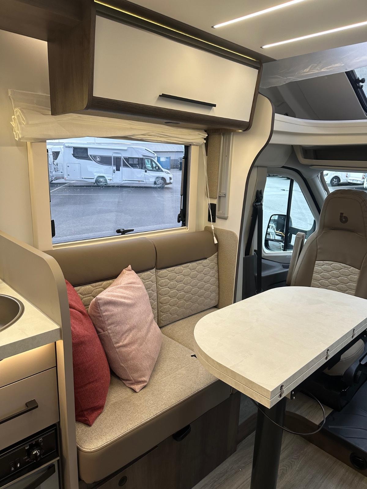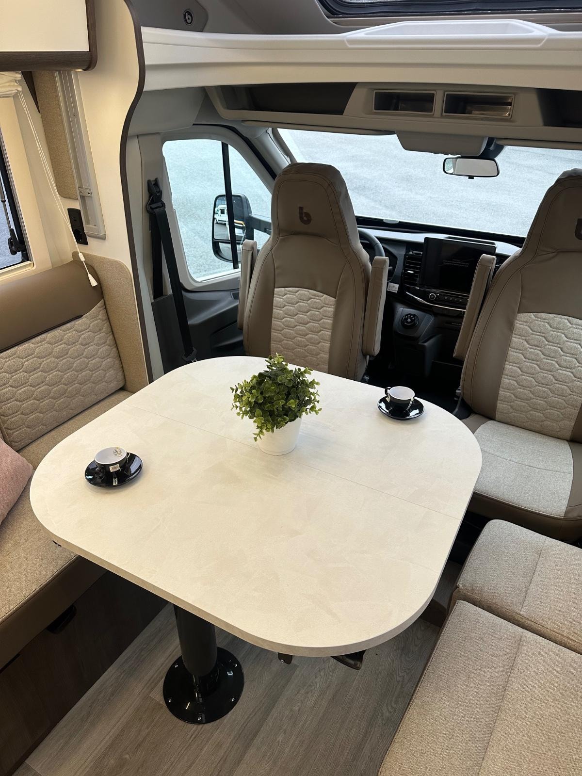 Romslig og lys sittegruppe med en nydelig Face-to-face løsning og et multiregulerbart bord. LED-belysning i hele bodelen. Store vinduer samt panoramatakluke som enkelt kan åpnes. Alle vinduer og takluker har myggnetting og formørknings plissé/rollo-gardiner. Flere ladepunkter for mobil, nettbrett osv.
