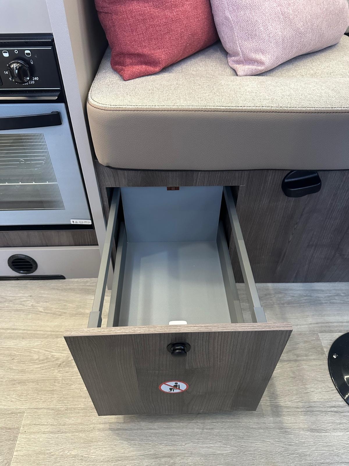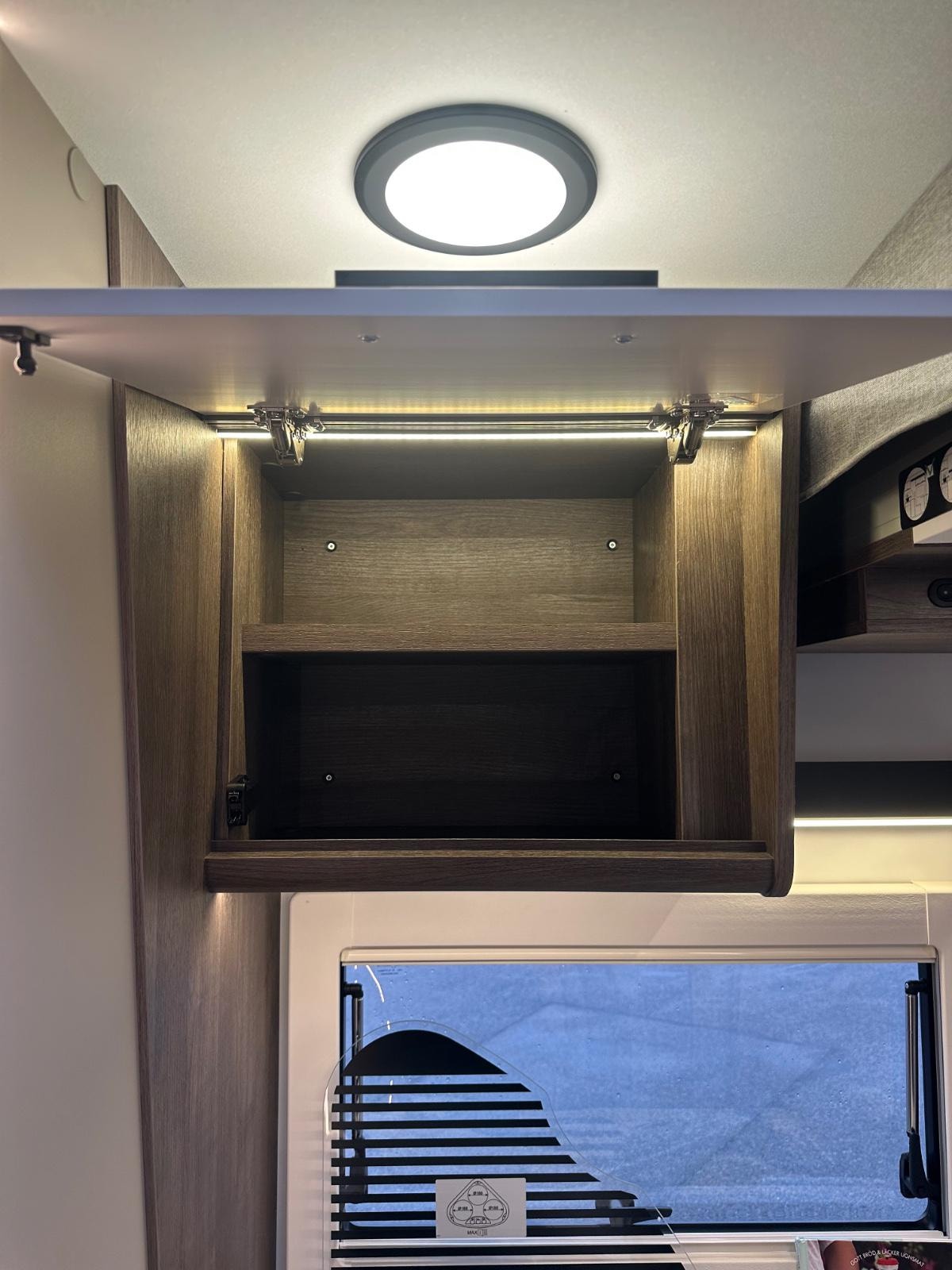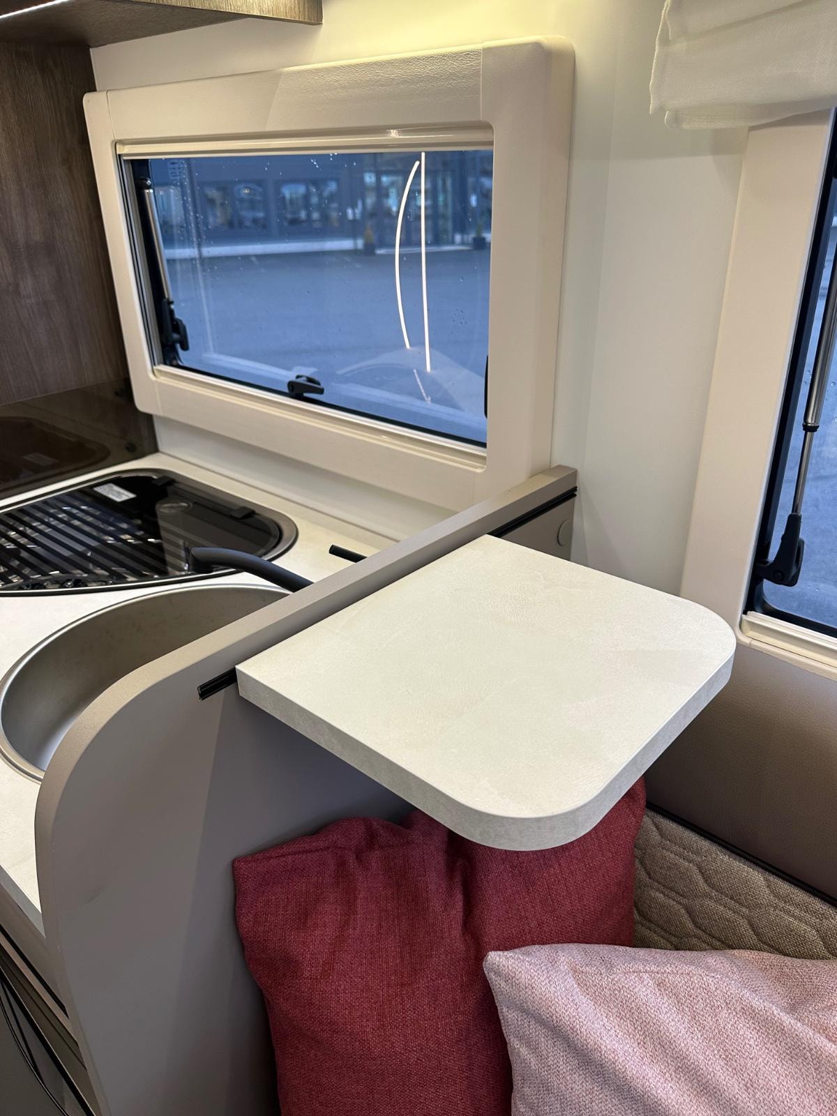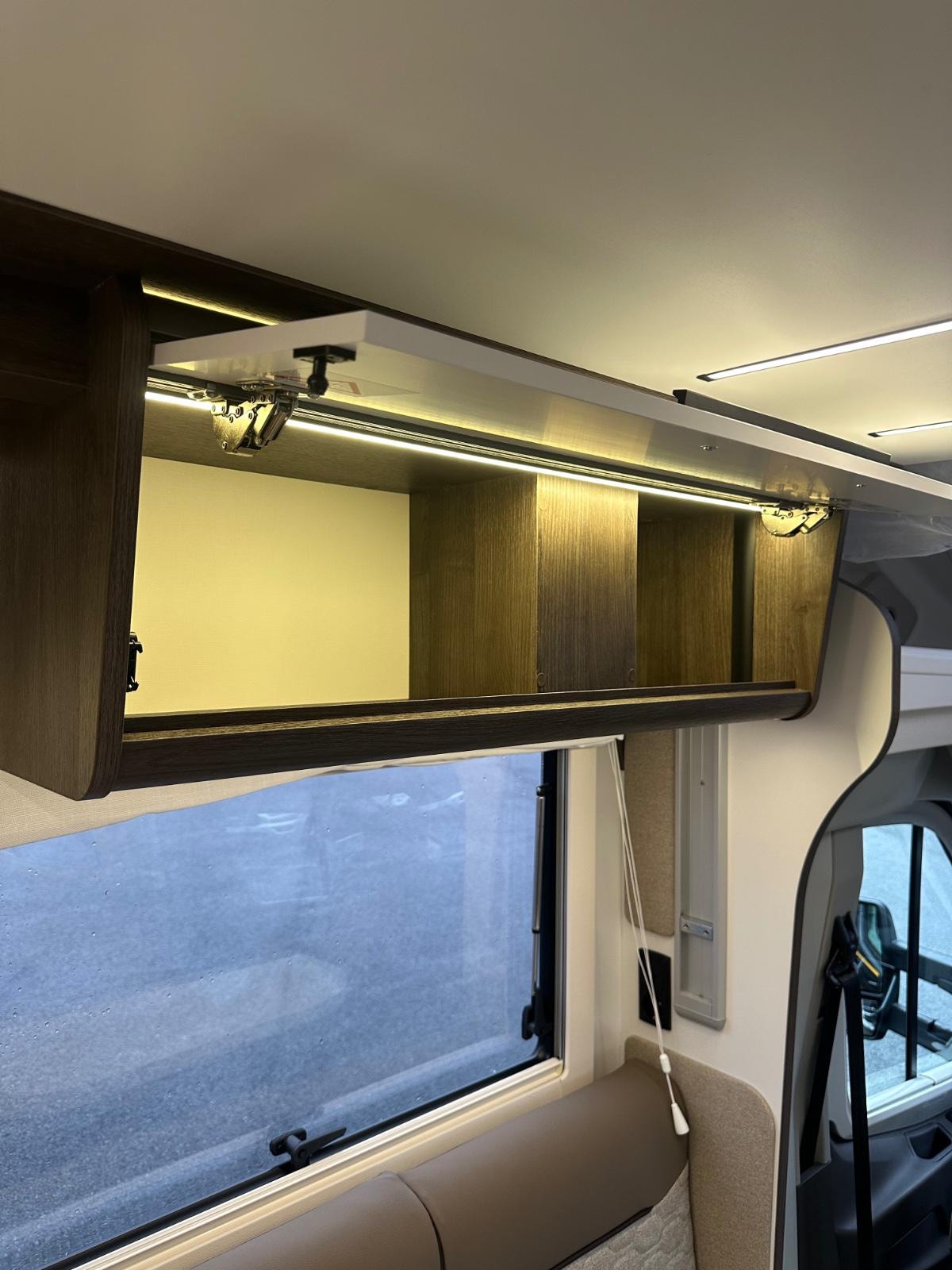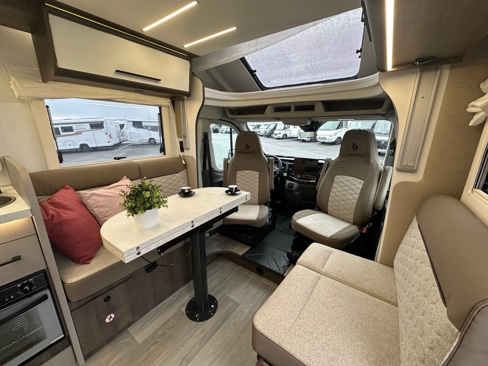 Romslig og lys sittegruppe med en nydelig Face-to-face løsning og et multiregulerbart bord. LED-belysning i hele bodelen. Store vinduer samt panoramatakluke som enkelt kan åpnes. Alle vinduer og takluker har myggnetting og formørknings plissé/rollo-gardiner. Flere ladepunkter for mobil, nettbrett osv.