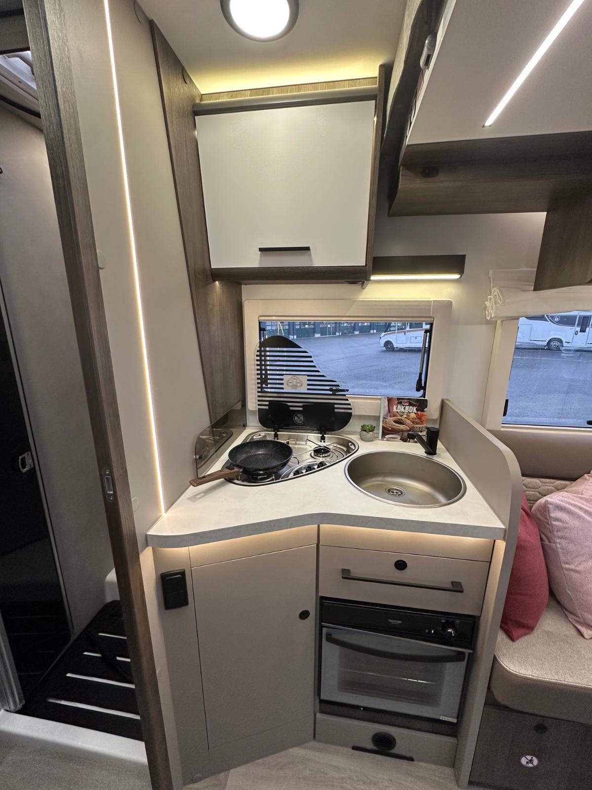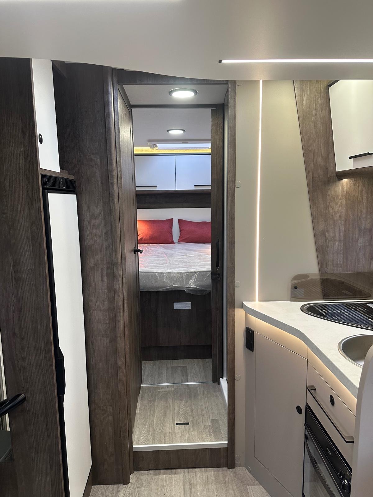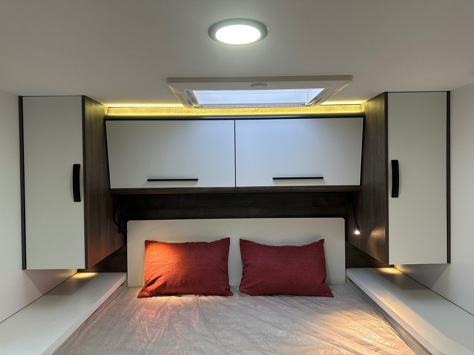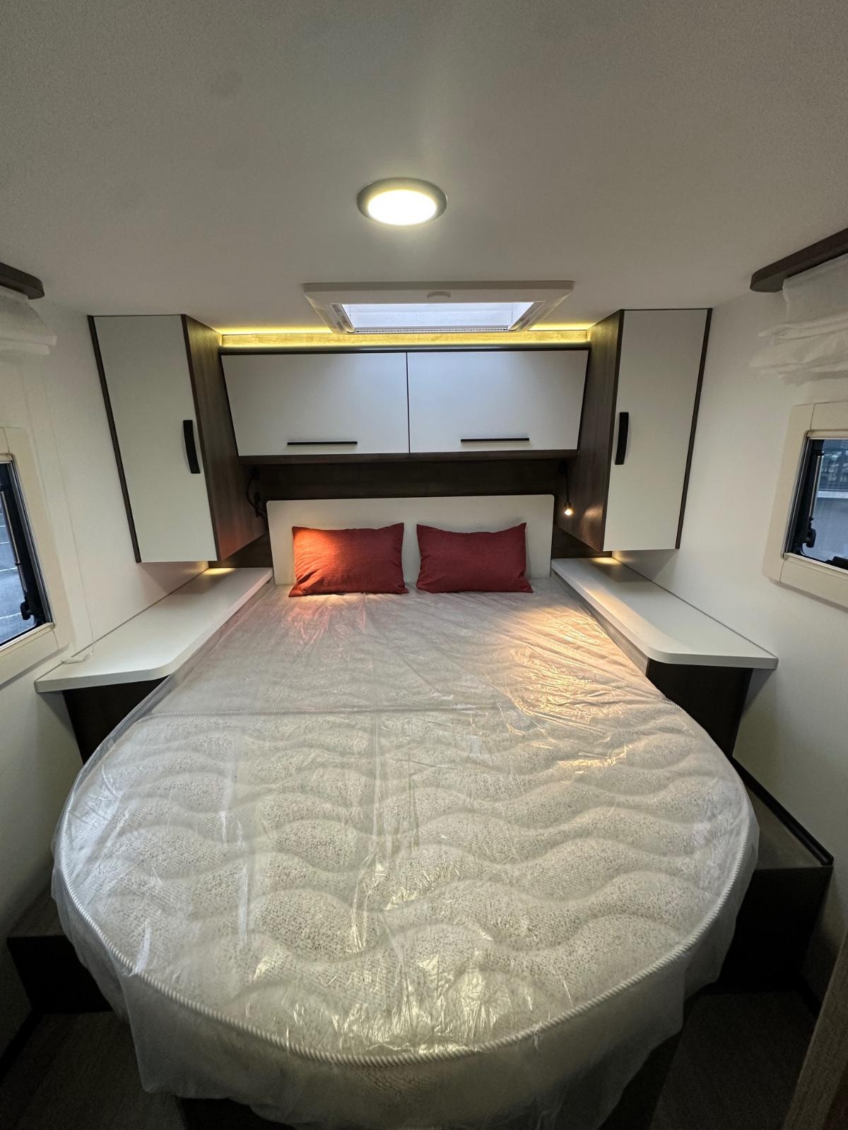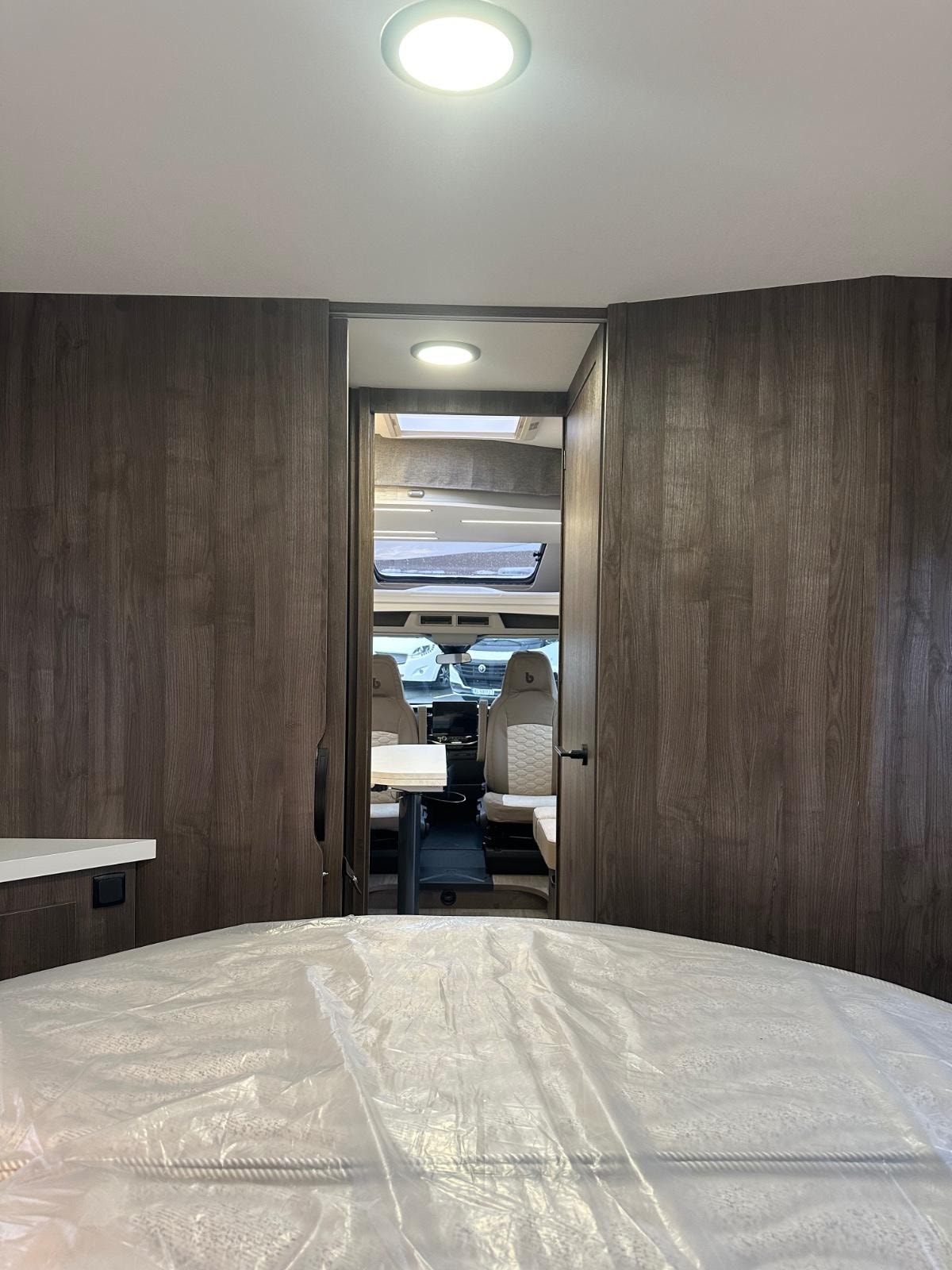 Denne bobilen leveres med en romslig queenbed bak. Soverommet har god plass til to voksne og er utstyrt med en egen skyvedør for ekstra fred og ro. I tillegg finner du en stor senkeseng foran i bilen, plassert over sittegruppen.