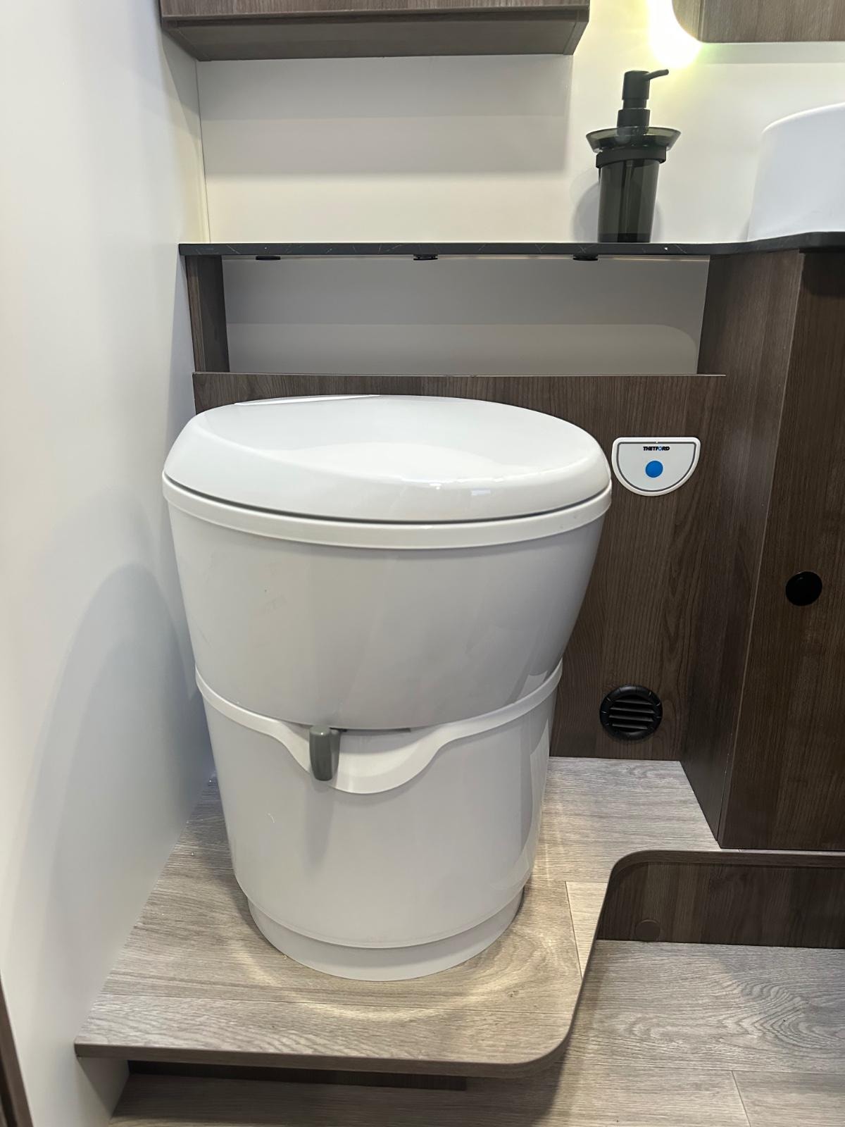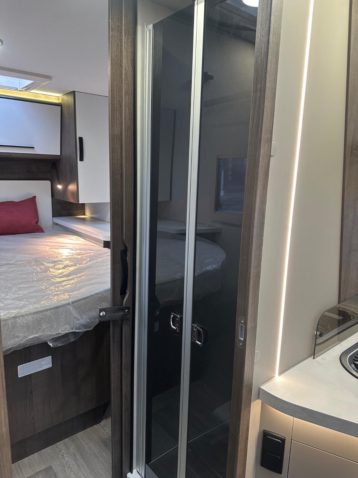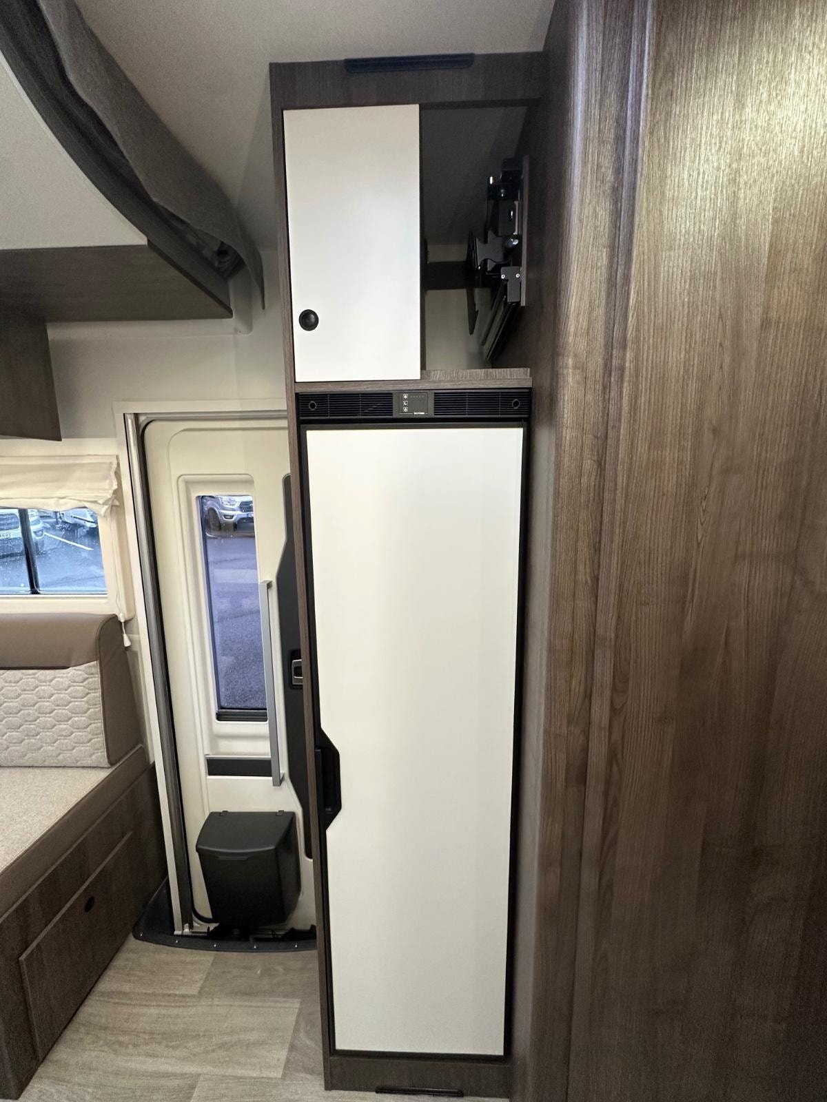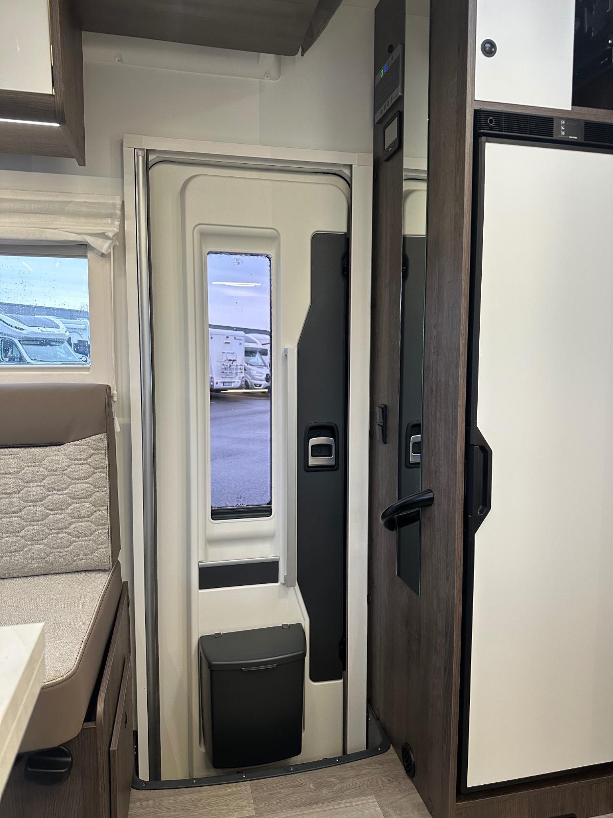 Denne bobilen leveres med en romslig queenbed bak. Soverommet har god plass til to voksne og er utstyrt med en egen skyvedør for ekstra fred og ro. I tillegg finner du en stor senkeseng foran i bilen, plassert over sittegruppen.