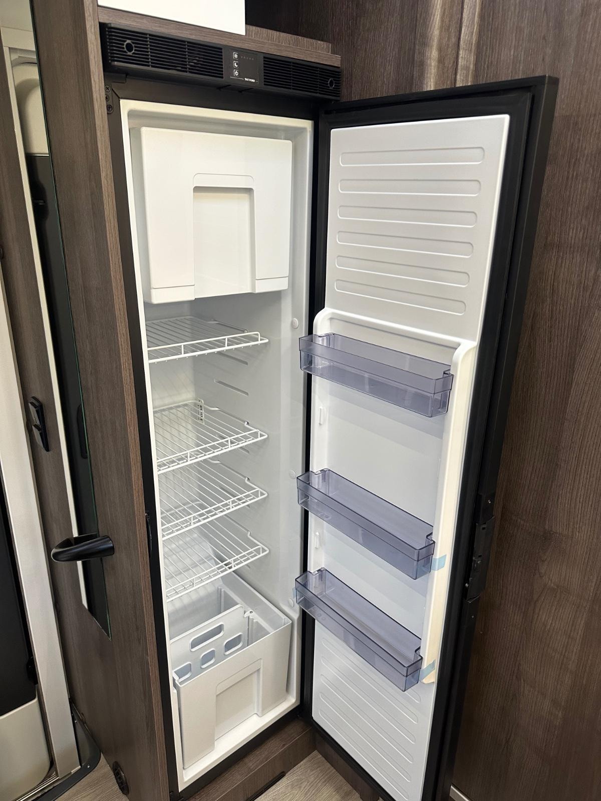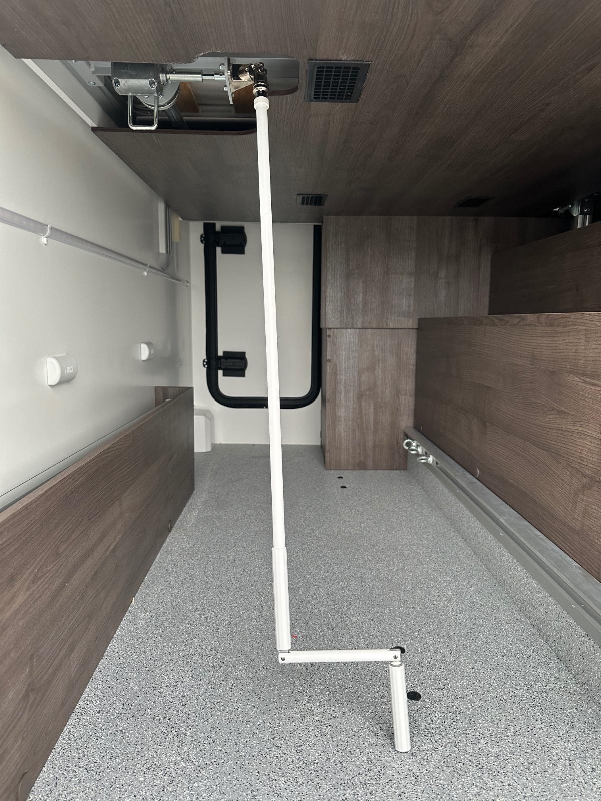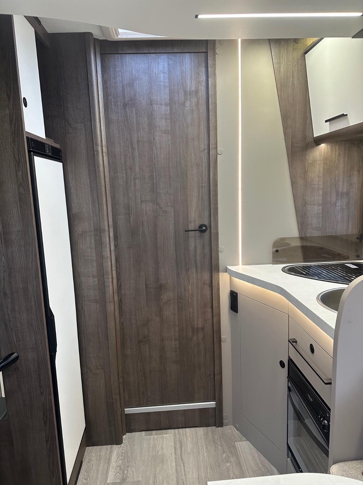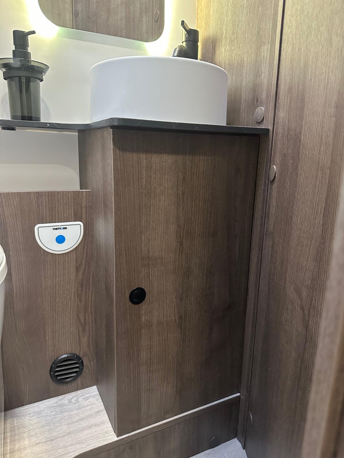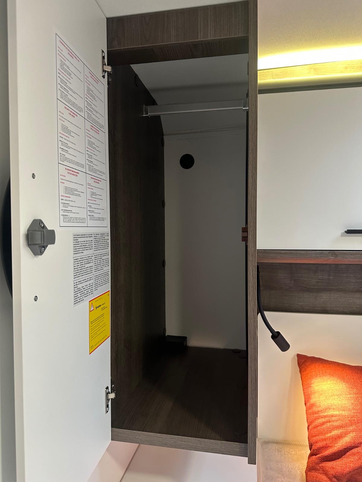 Denne bobilen leveres med en romslig queenbed bak. Soverommet har god plass til to voksne og er utstyrt med en egen skyvedør for ekstra fred og ro. I tillegg finner du en stor senkeseng foran i bilen, plassert over sittegruppen.