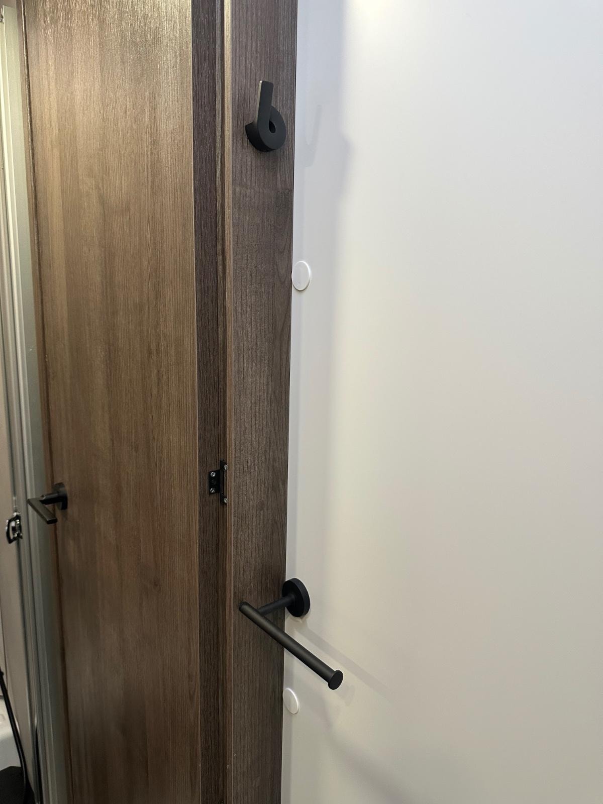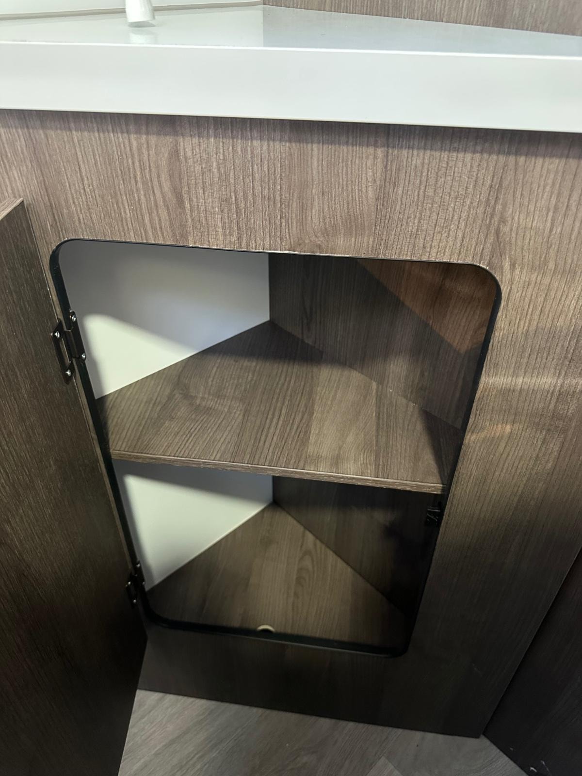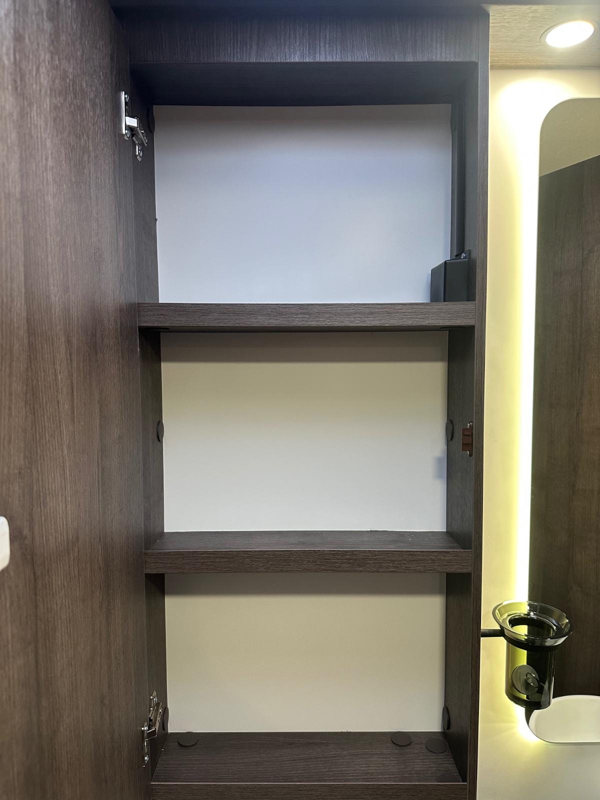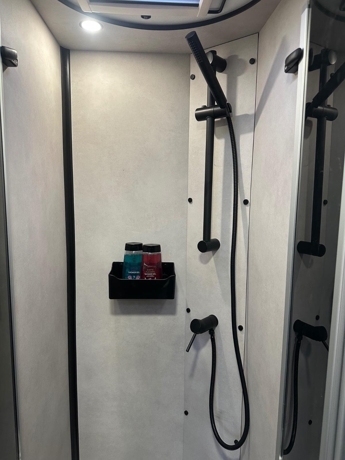 Praktisk baderom med separat dusj. Dusjen har takluke for god utlufting og nedtrekkbar stang for håndkle. To avløp i dusjen for ekstra god drenering. Baderommet er i eget separat rom med svingbart toalett for å frigjøre mer plass. Flotte detaljer som stort speil, såpeholdere, skapplass for toalettsaker og en egen takluke.