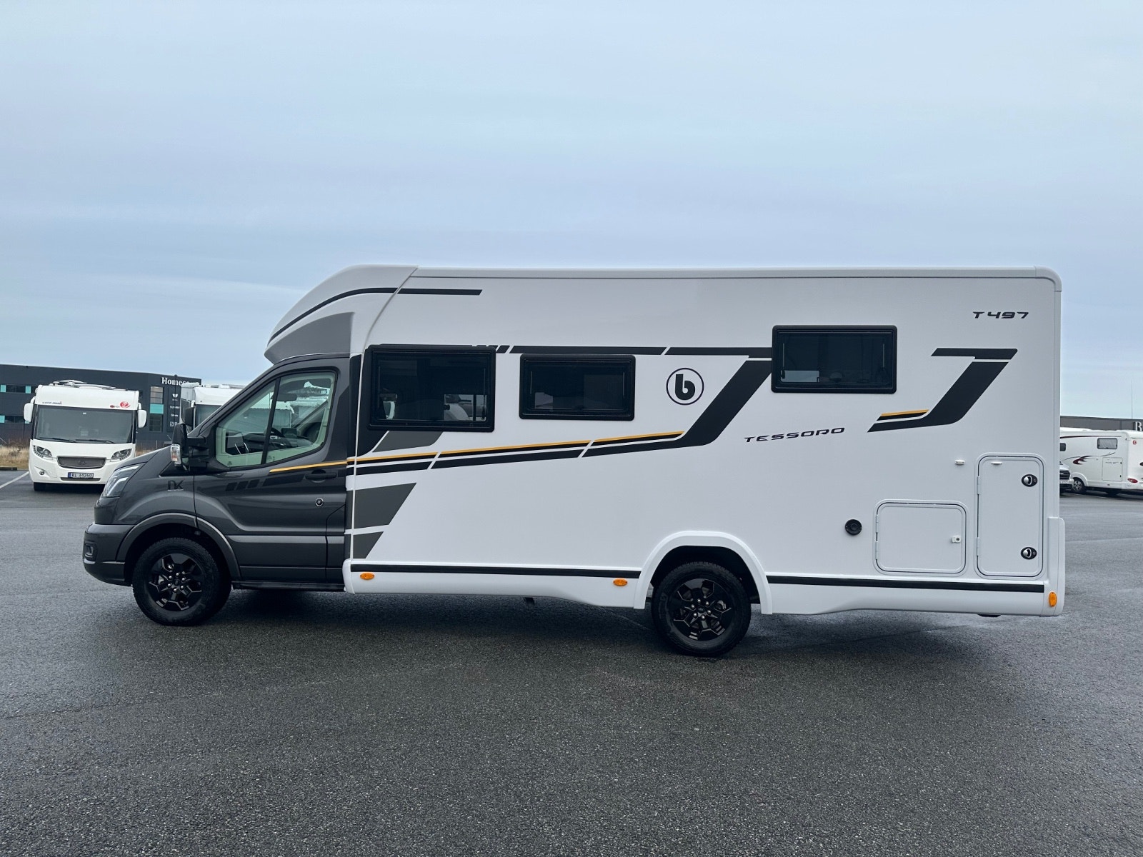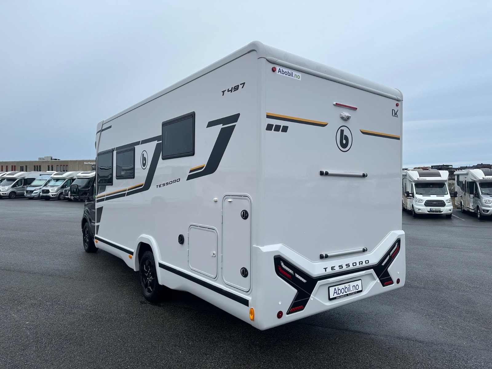 Vi har fått en nydelig 2026 Benimar Tessoro 497 på lager med stilig del-skinn interiør. Denne bobilen kommer på Ford chassis, 2,0L 165HK, 8-trinns automatgir.