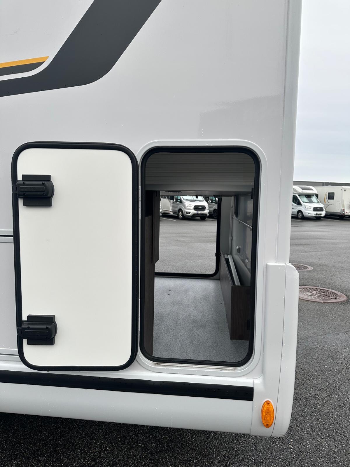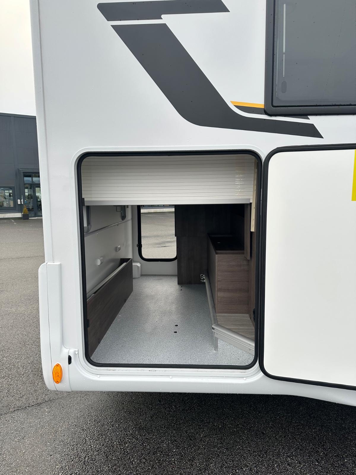 Benimar Tessoro 497 har stor garasje med tilgang fra begge sider via store luker. Lys og varme i garasjen. Det er også mulig å justere sengens høyde fra garasjen bak.
