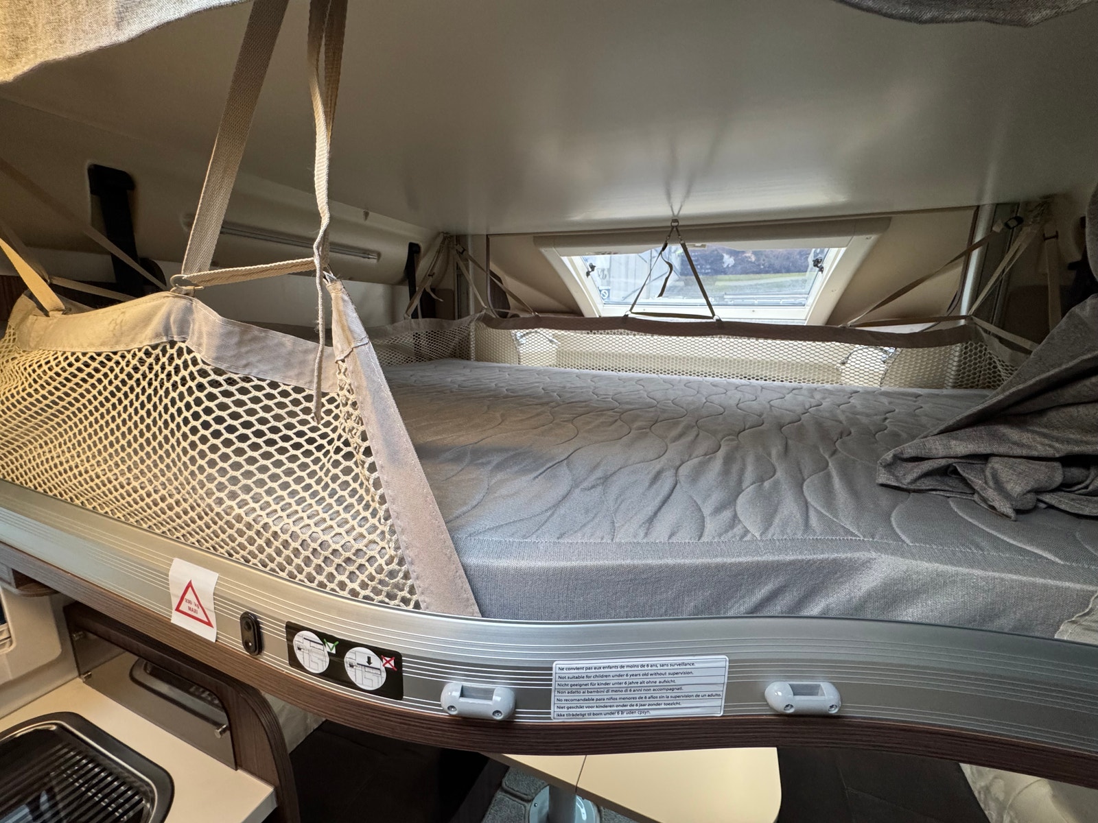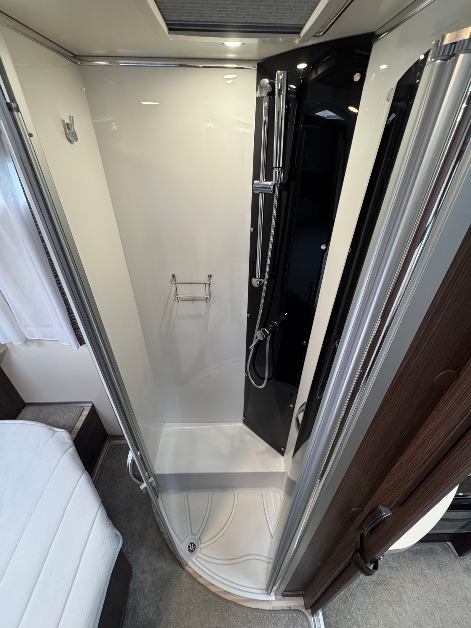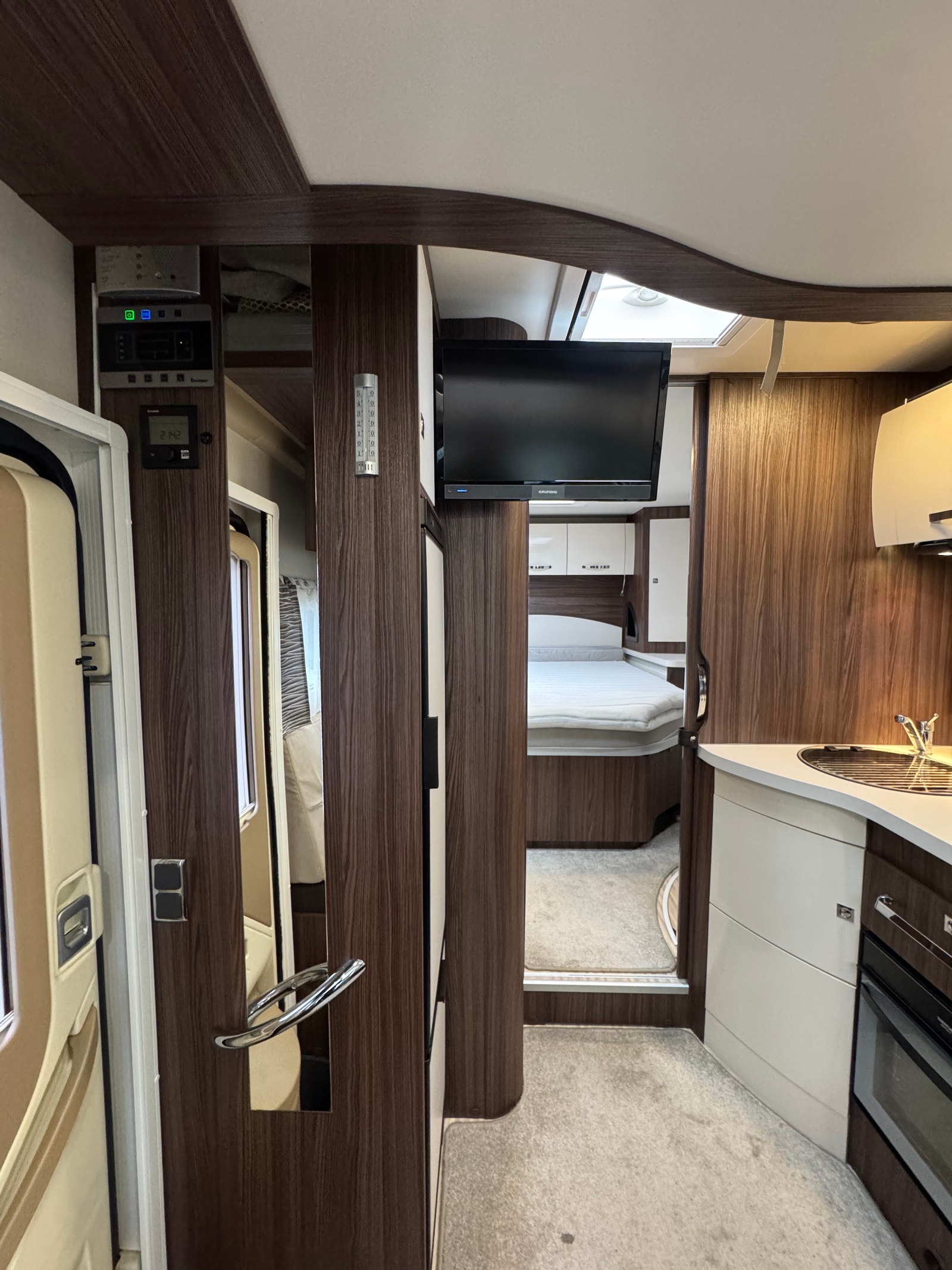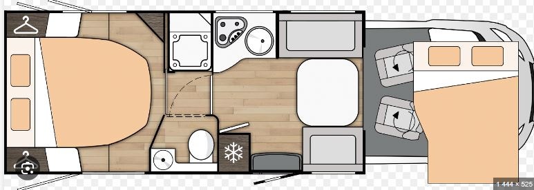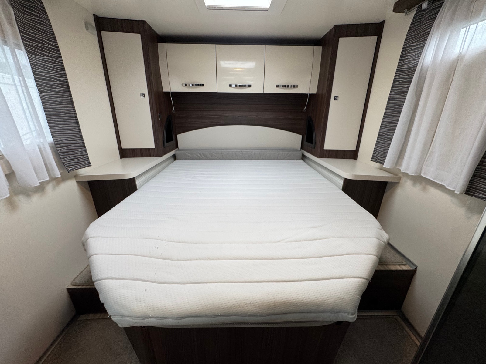 Bak er det midtstilt dobbelseng og godt med skapplass. Det er separert toalett og dusj og mulighet for å lukke igjen dør frem mot kjøkken. Det er også skyvedør fra soverom og inn mot bad/toalett. Perfekt bil for opptil 4 personer.