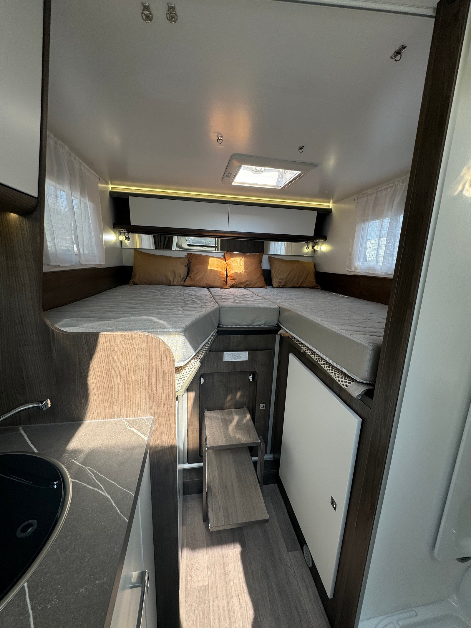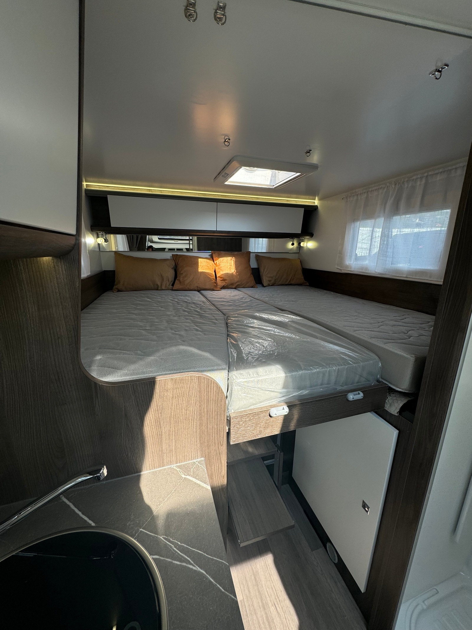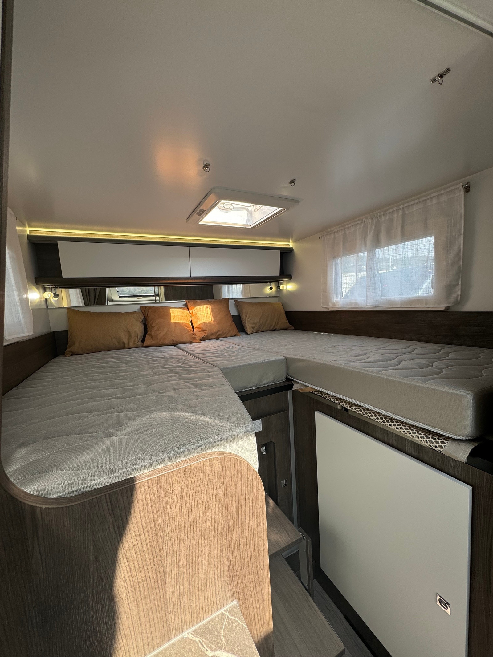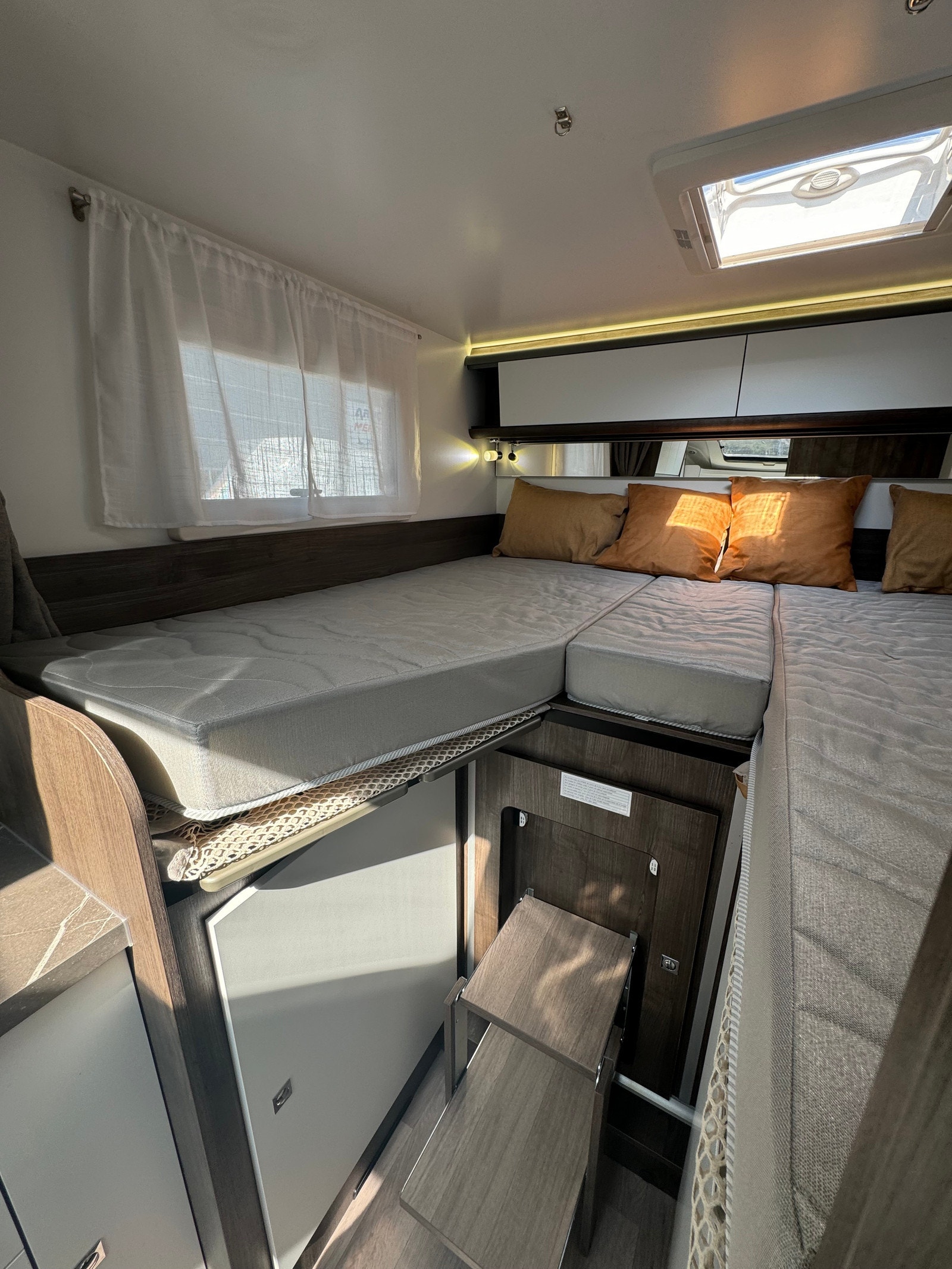 Bobilen har to enkle senger, med mulighet for å lage om til stor dobbelseng. Stor garasje, her er det plass til sykler om ønskelig. Det er tilgang til garasjen fra innsiden av bilen.