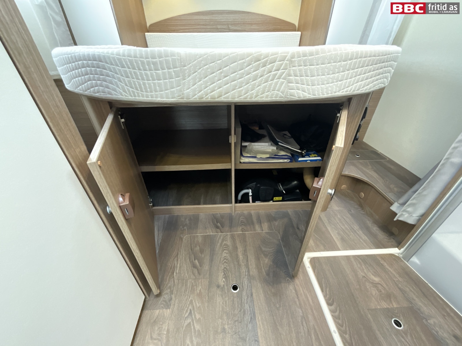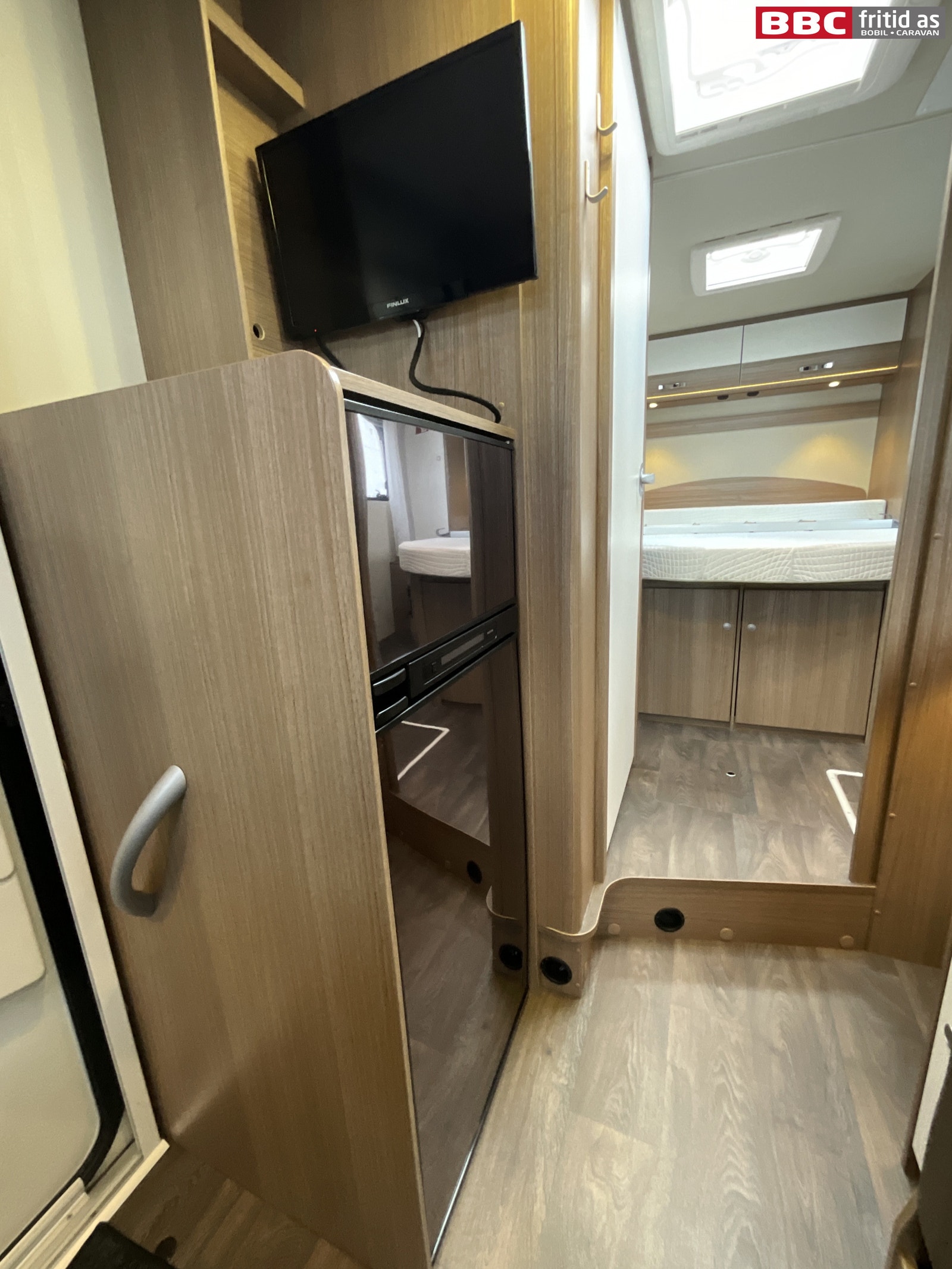Her er det en rett-salong + sidesitter på 45 cm rett innenfor bodelsdøren. Bordet kan tas av ved behov. Totalt 5 personer kan sitte i salongen samtidig når fremsetene vendes bakover. Ellers er det 2 overskap med lys under, 4 taklys, 2 stk USB-uttak ved bordet, 230V-uttak og myggdør i bodelsdøren. Senkesengen i taket måler 140/110 x 200 cm. Original stige følger med for lettere adkomst opp til sengen. En Finlux 22" TV er montert på eget veggfeste, og koblet opp mot en digital antenne på taket.