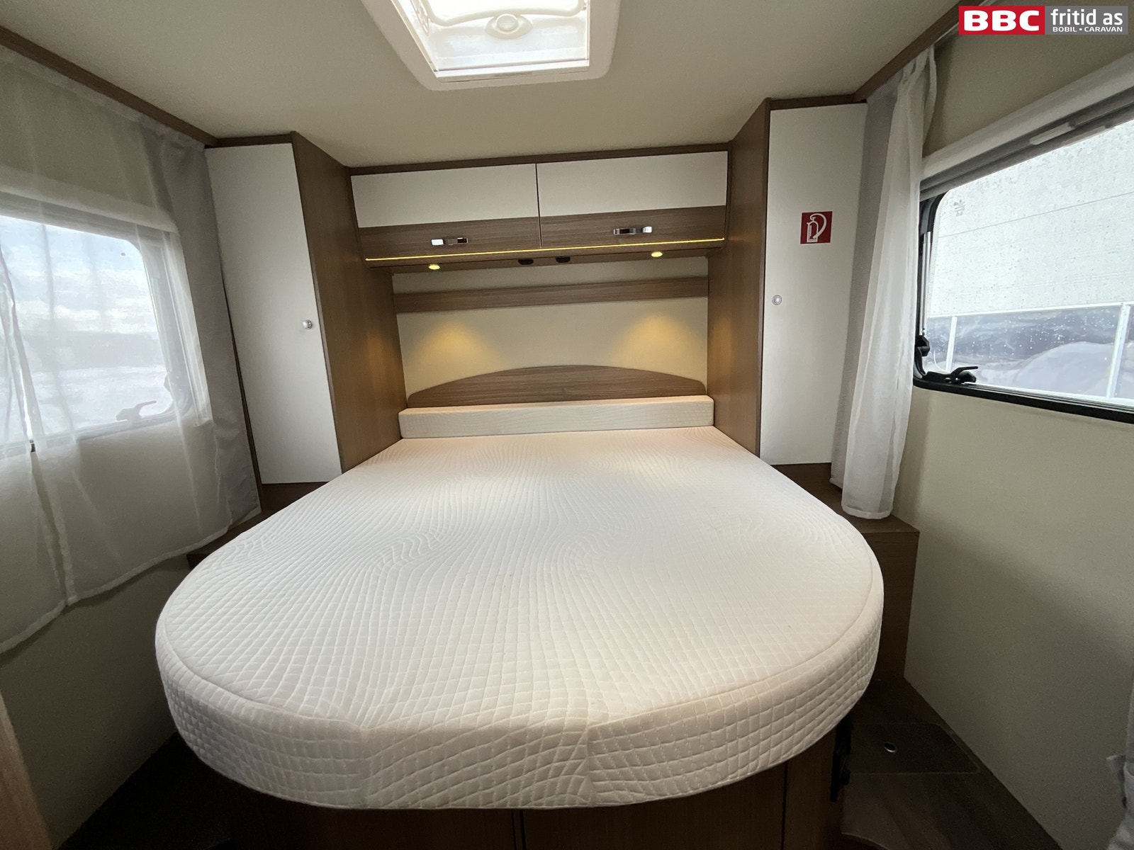Bakerst i bilen er det en midtstilt dobbeltseng (Queenbed) på 180/190 x 140 cm. Sideskap på begge sider i hodeenden på 120 x 32 cm egner seg som praktiske garderobeskap. Under sengen er det også 2 skap under fotenden. Gulvluke er det også. Belysningen i soverommet er både ledstriper og leselys. Takluke på 40 x 40 cm, 2 vinduer og pene farger.