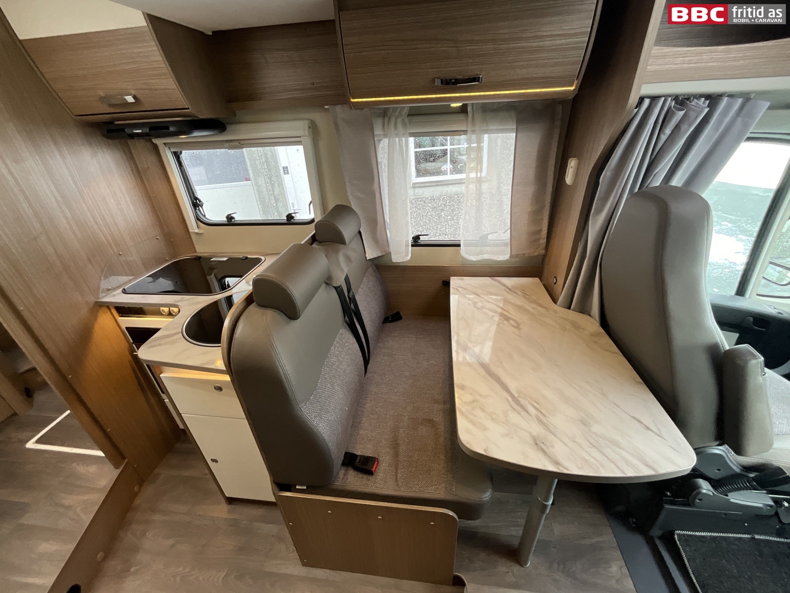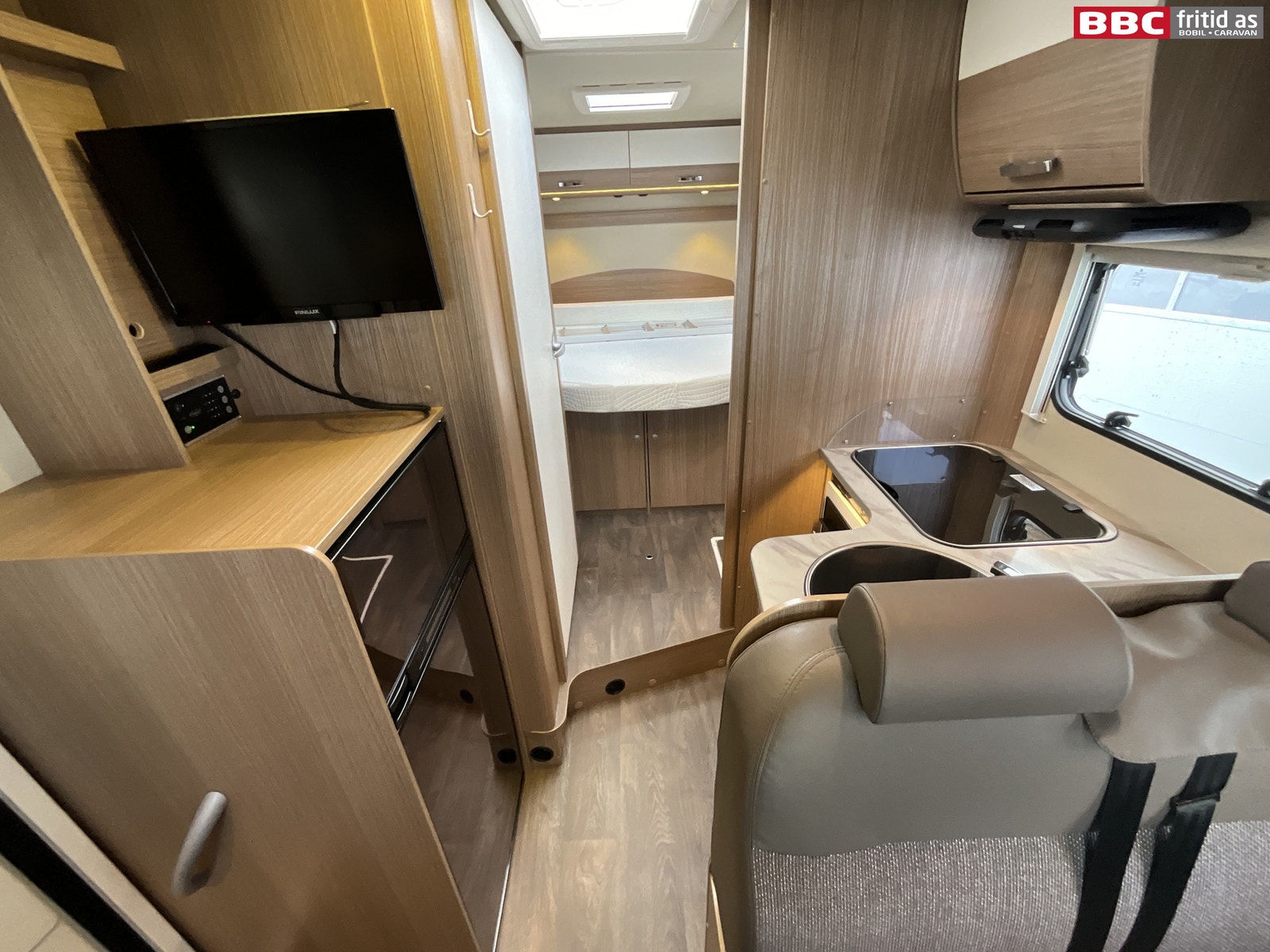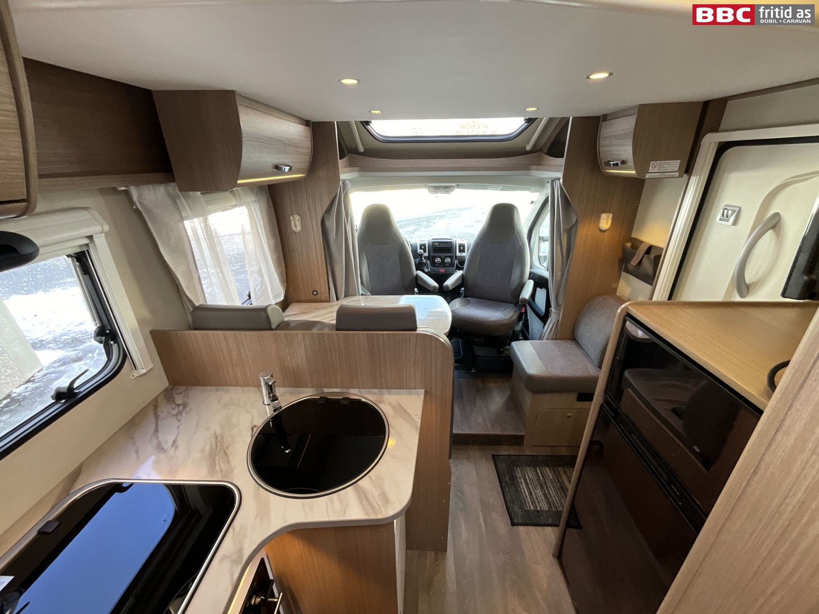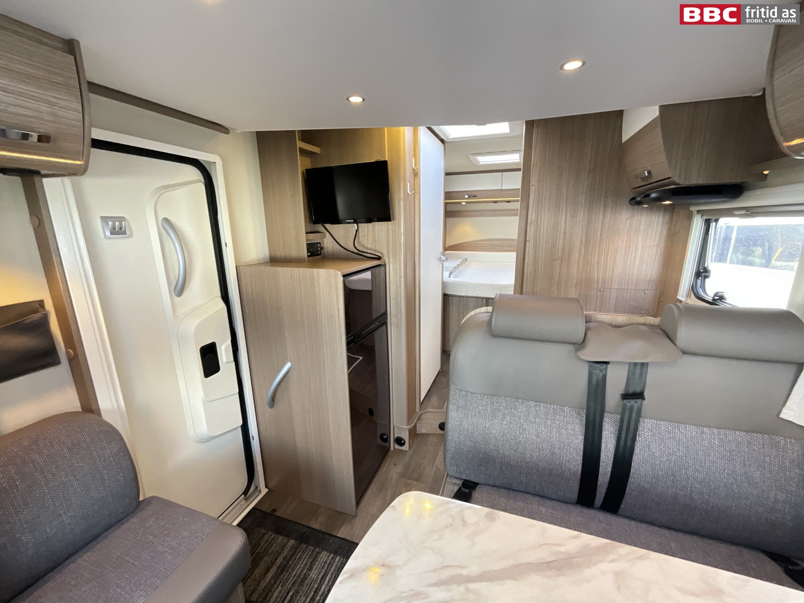 Her er det en rett-salong + sidesitter på 45 cm rett innenfor bodelsdøren. Bordet kan tas av ved behov. Totalt 5 personer kan sitte i salongen samtidig når fremsetene vendes bakover. Ellers er det 2 overskap med lys under, 4 taklys, 2 stk USB-uttak ved bordet, 230V-uttak og myggdør i bodelsdøren. Senkesengen i taket måler 140/110 x 200 cm. Original stige følger med for lettere adkomst opp til sengen. En Finlux 22″ TV er montert på eget veggfeste, og koblet opp mot en digital antenne på taket.