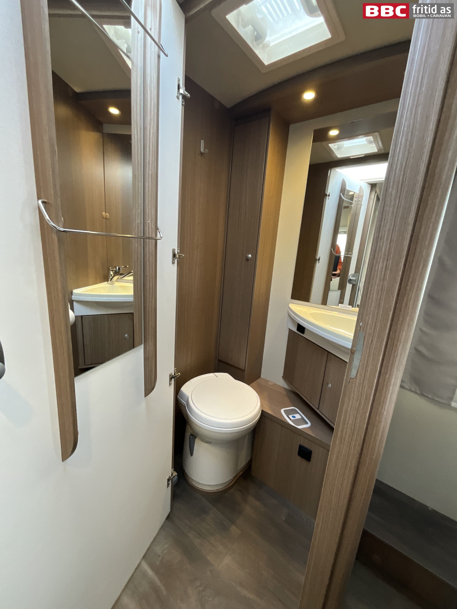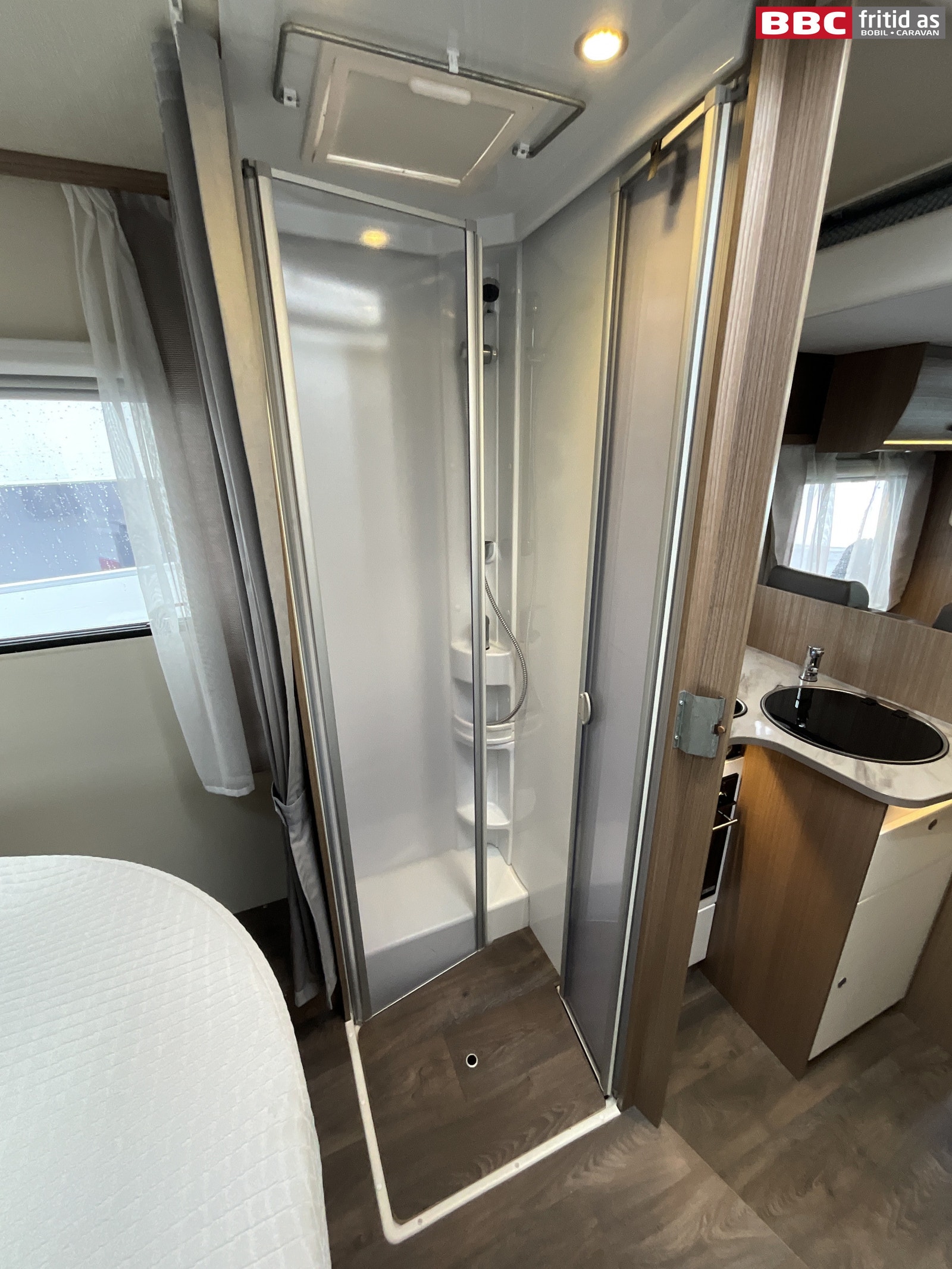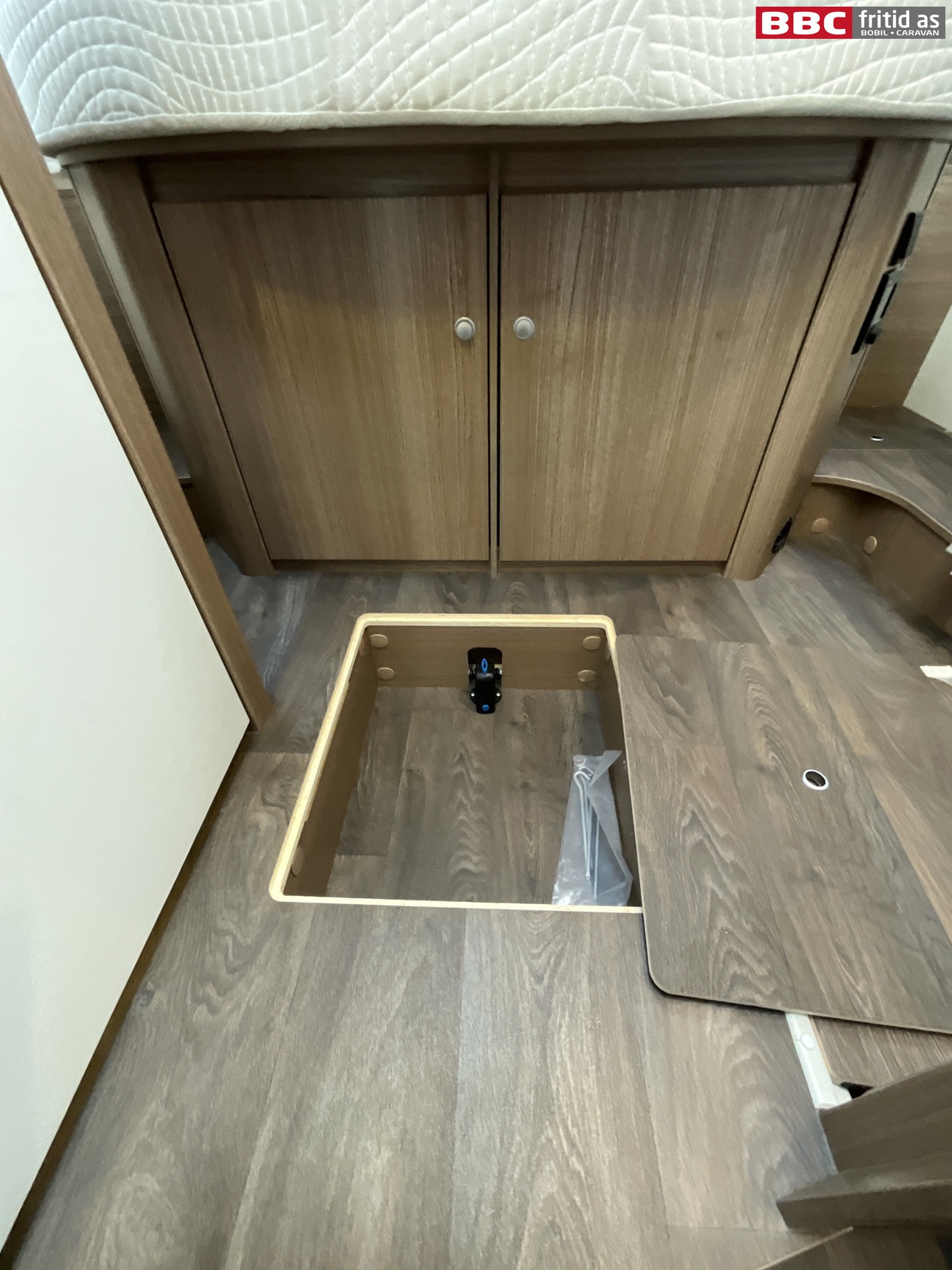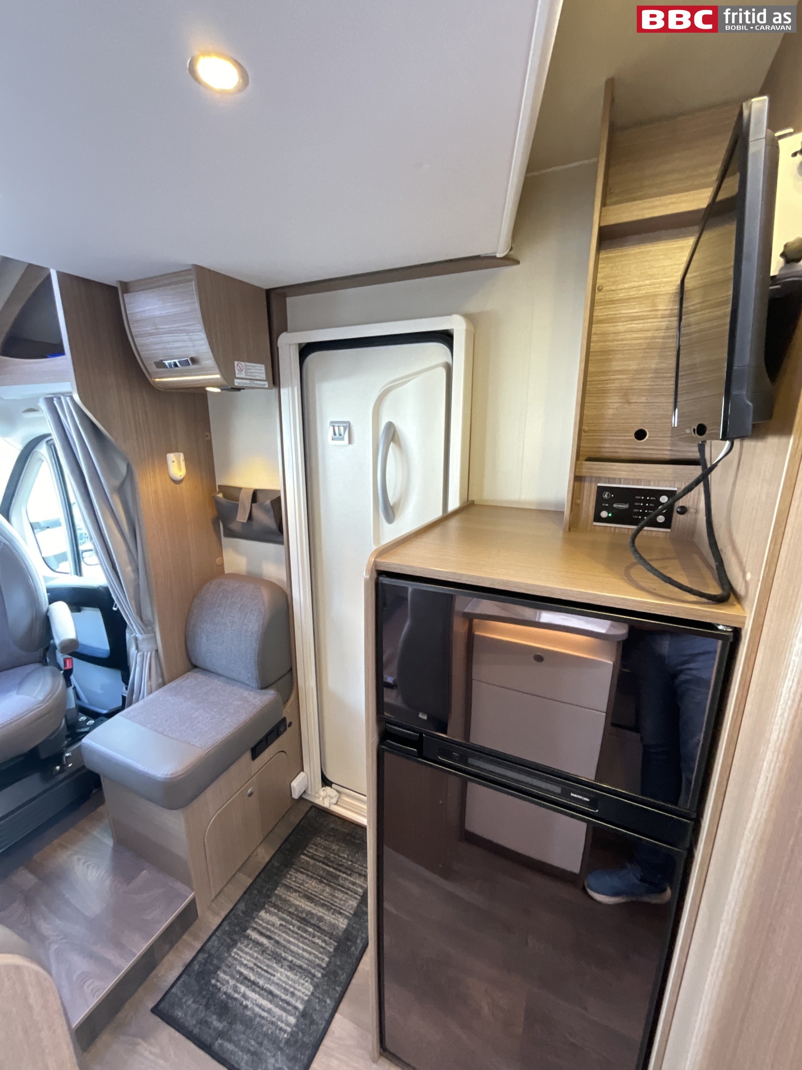 Her er det en rett-salong + sidesitter på 45 cm rett innenfor bodelsdøren. Bordet kan tas av ved behov. Totalt 5 personer kan sitte i salongen samtidig når fremsetene vendes bakover. Ellers er det 2 overskap med lys under, 4 taklys, 2 stk USB-uttak ved bordet, 230V-uttak og myggdør i bodelsdøren. Senkesengen i taket måler 140/110 x 200 cm. Original stige følger med for lettere adkomst opp til sengen. En Finlux 22″ TV er montert på eget veggfeste, og koblet opp mot en digital antenne på taket.
