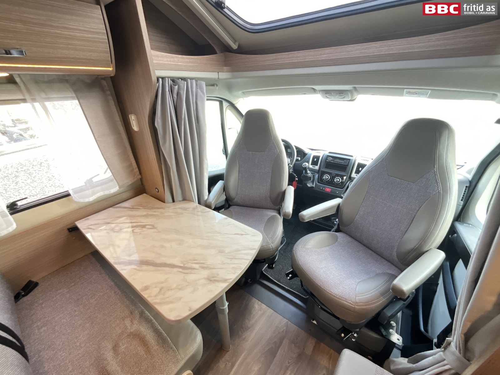 Fremme i bilen er det 2 gode og meget pene vendbare fremster med flere justeringsmuligheter. Det er også 2 koppholdere, kartplate, 12V og USB-uttak, Pioneer DAB+ radio, elektriske vinduer og speil. Egen skjerm for ryggekamera, AC, 3 hyller over fører/passasjer og en stor takluke på ca 115 x 50 cm.
